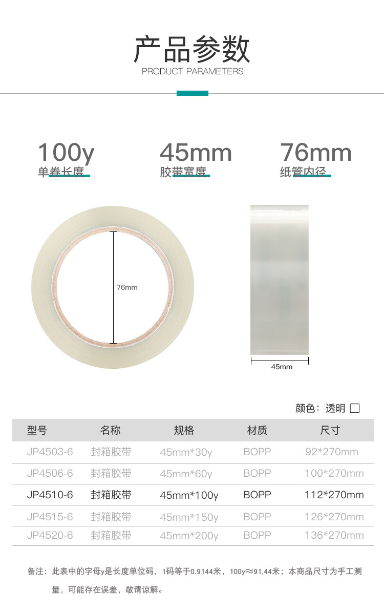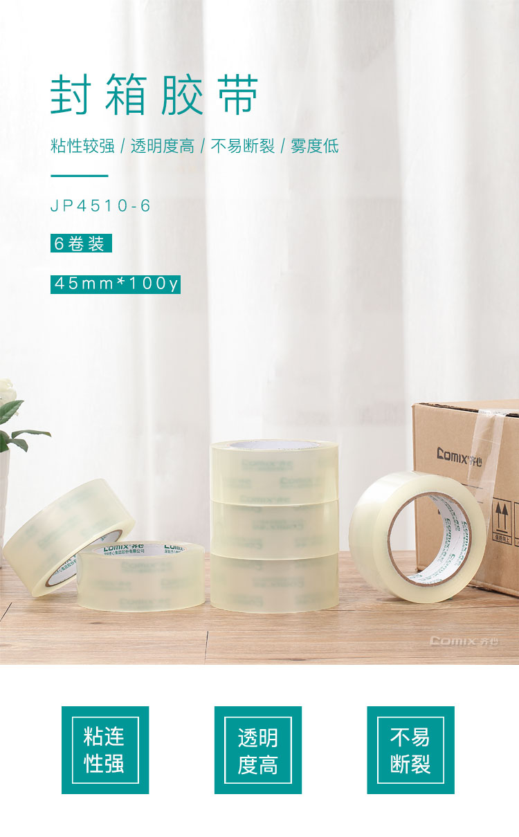 齐心 JP4510-6 封箱胶带45mm100码6个/筒胶纸胶带封箱胶透明