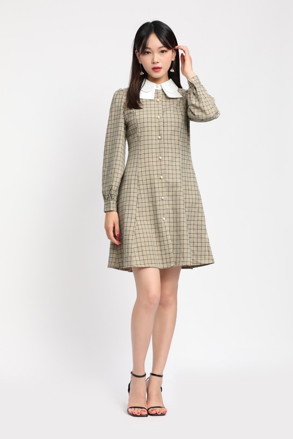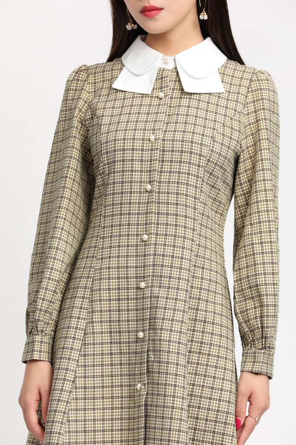amadella 白色衬衣领珍珠扣格纹连衣裙 11909