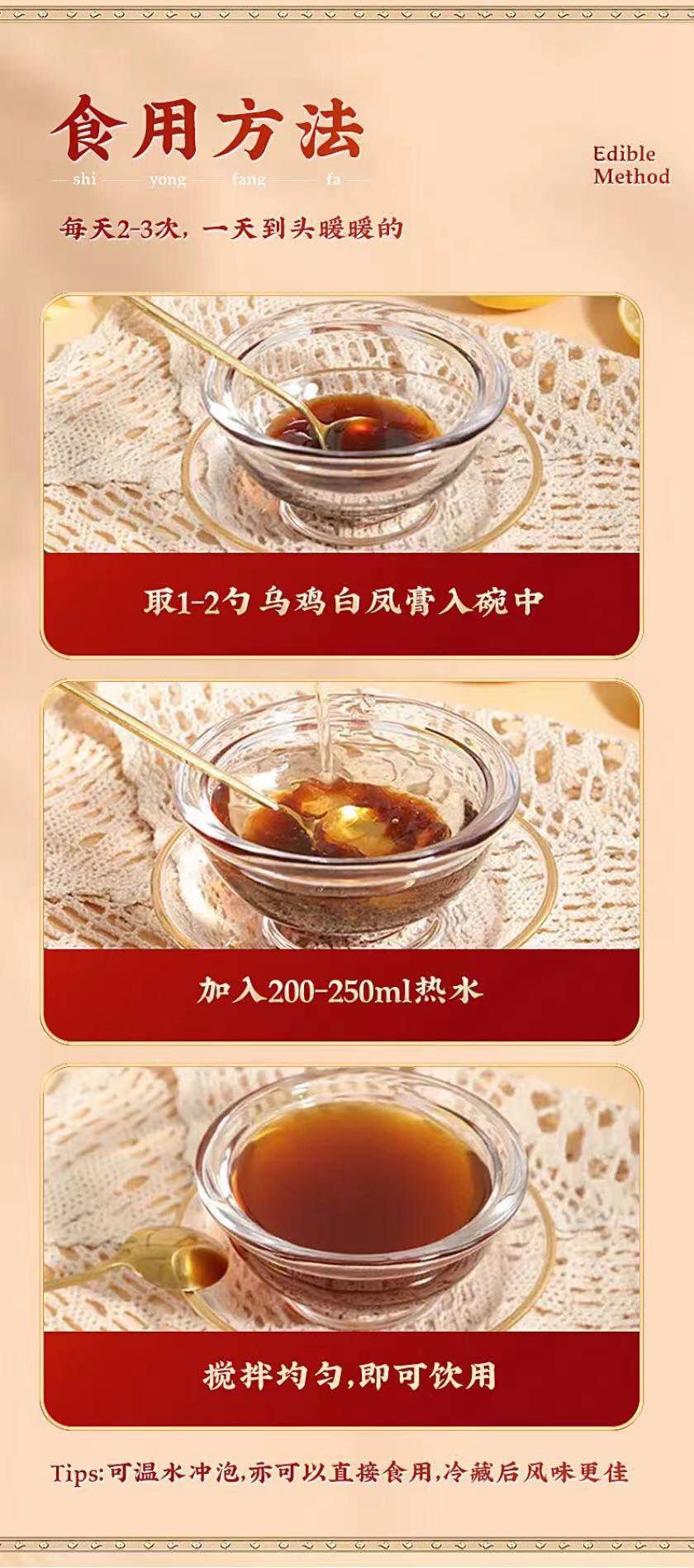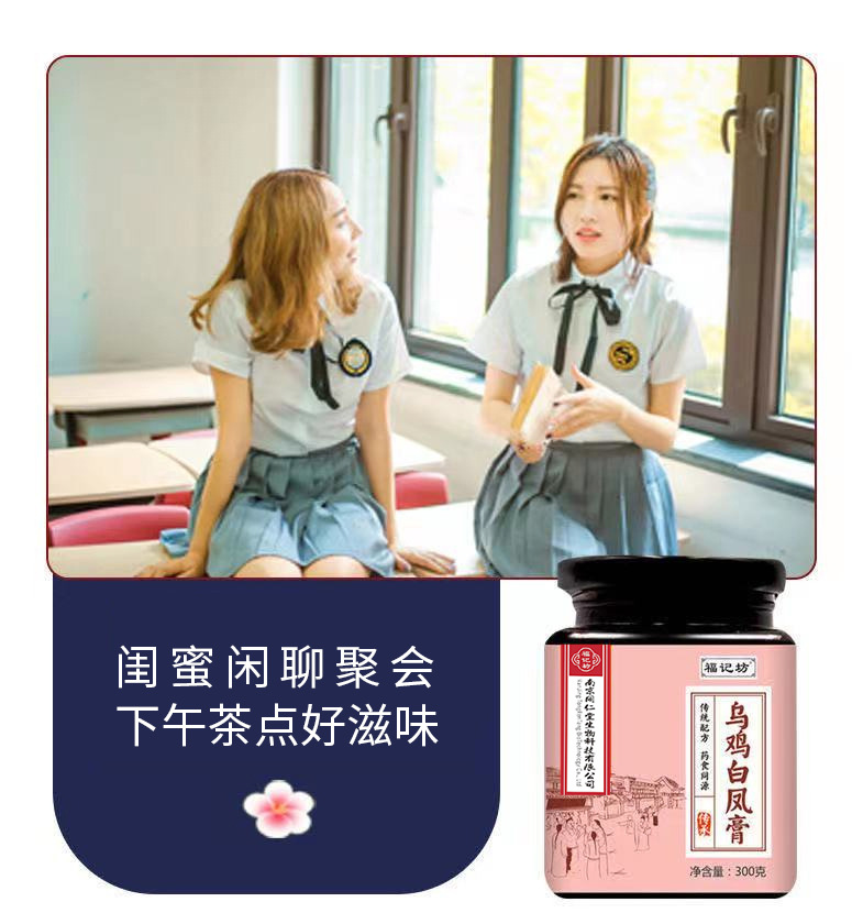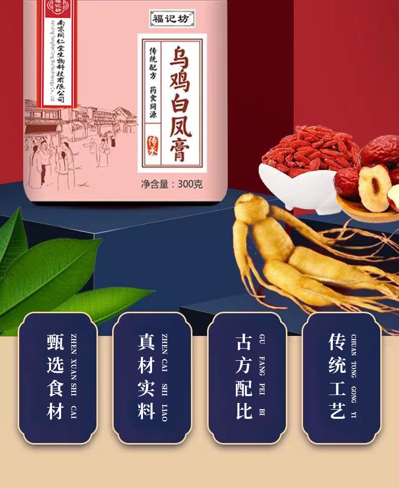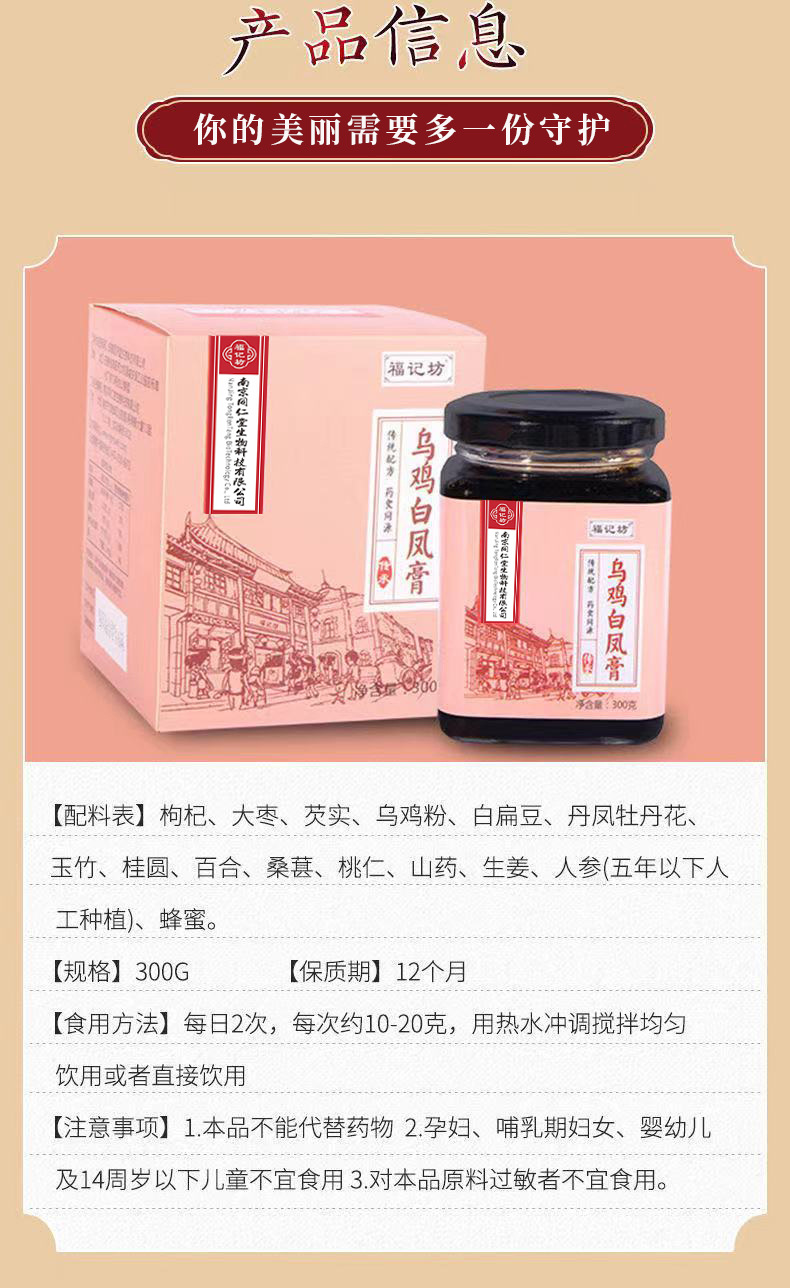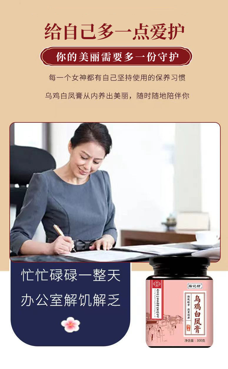 福记坊乌鸡白凤膏。补气养血、调理月经、改善白带、美容养颜。用于气血两虚,身体瘦弱,月经不顺、量少、痛经,肌肤暗淡无光,熬夜气虚掉发……一勺好膏,万千滋养。女人常喝,月月舒心,驻容颜不易老。20+女人必入,让你经期也能光彩照人