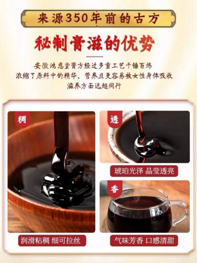 采用古法工序,慢火熬制而成并经过地道选材→古法熬制 →深度清洁→ 慢浸长泡 →武火煎汁→ 文火秘稠→ 滤清提髓 →秘稠收膏...匠心熬制而成,每一道工序都非常考究,煎熬时间、入胶火候、出膏老嫩程度……太嫩不宜储存,太老不便服用,所以要吃到正宗的。乌鸡白凤膏,全部真材实料,拒绝勾兑