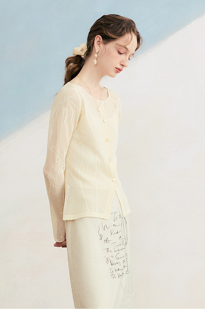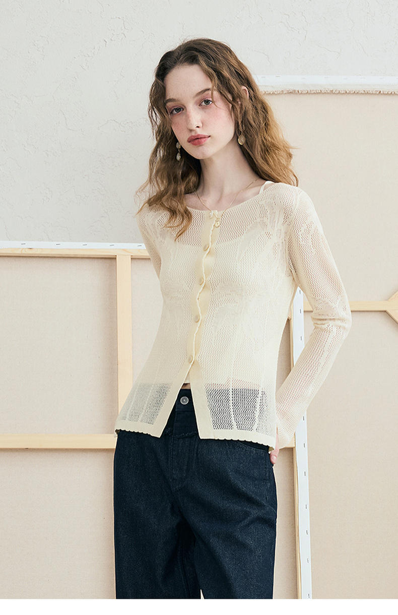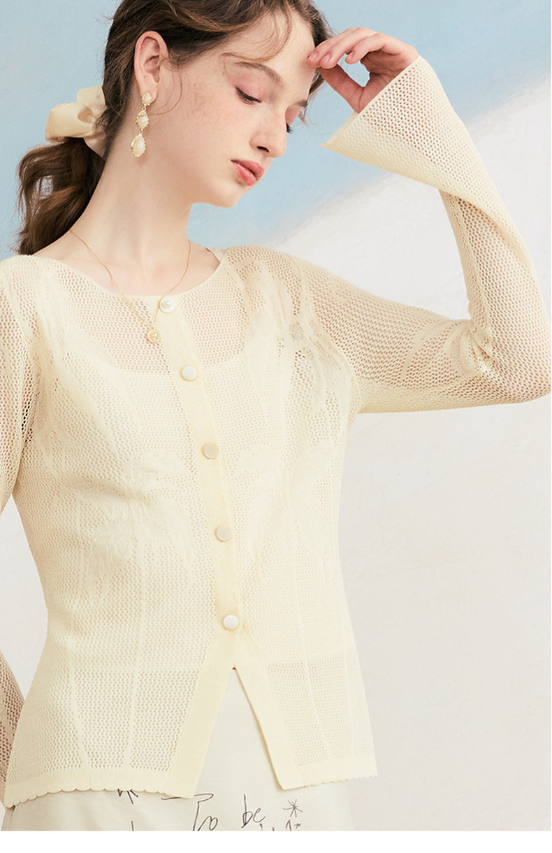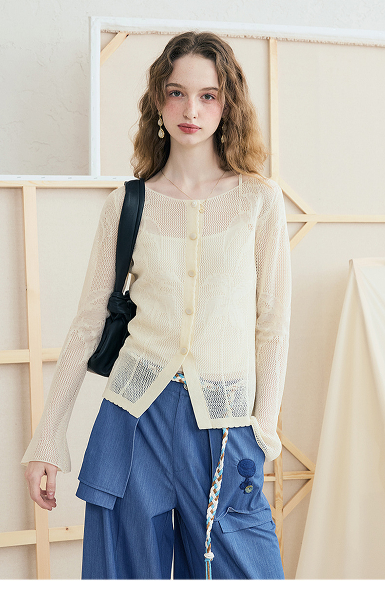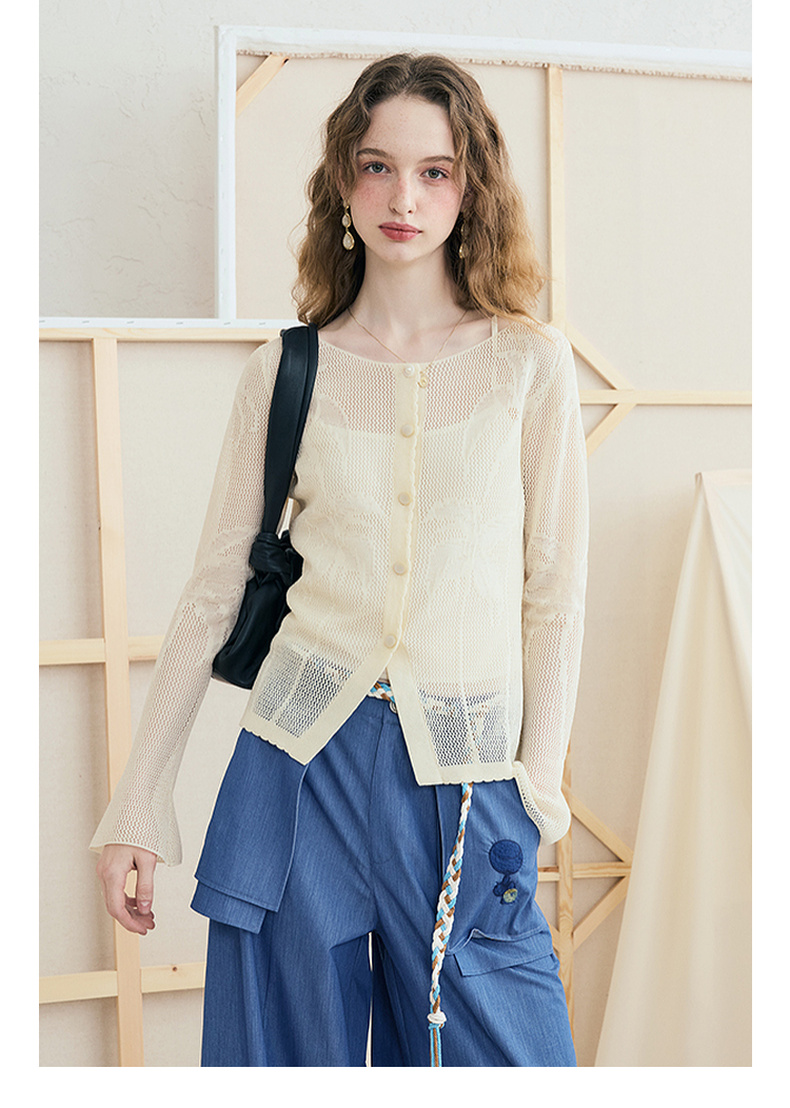 两三事 邮寄月光 2025夏季新款小清新钩针提花透视针织开衫女