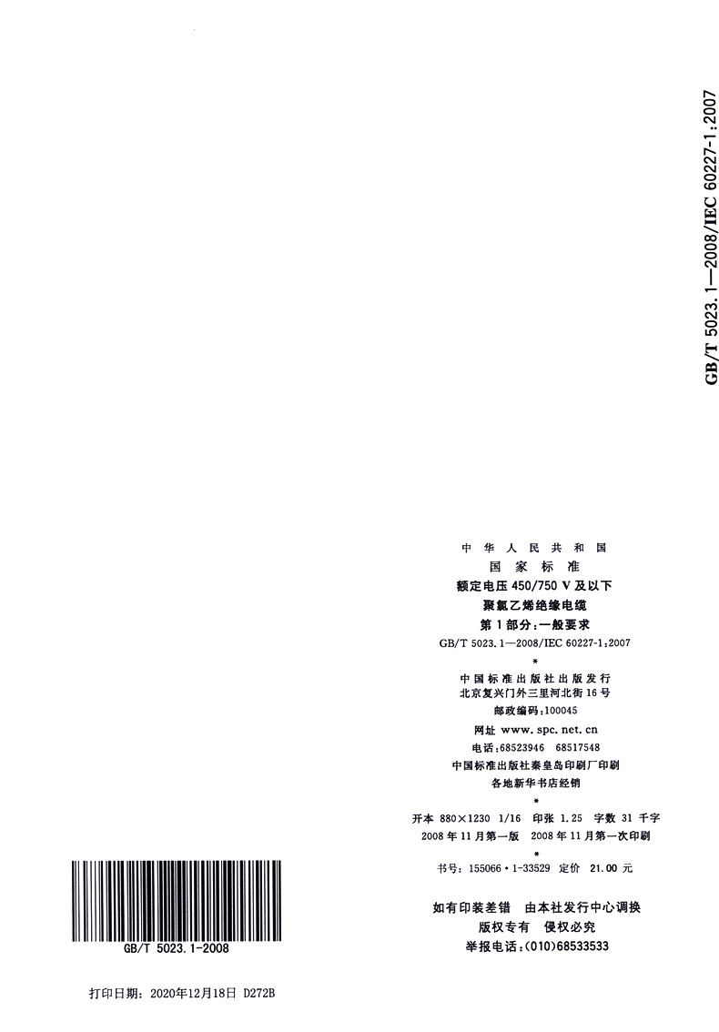 书名:速印不退 GB/T 5023.1-2008额定电压450/750V及以下聚氯乙烯绝缘电缆 第1部分:一般要求