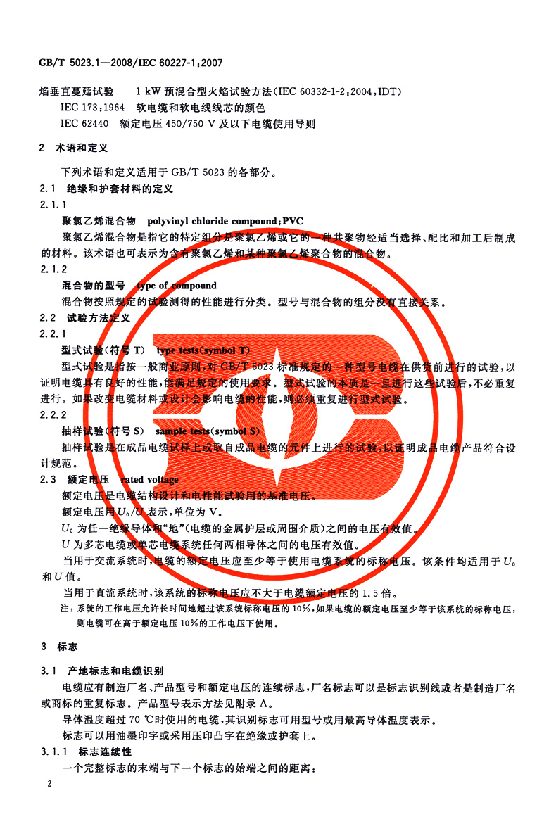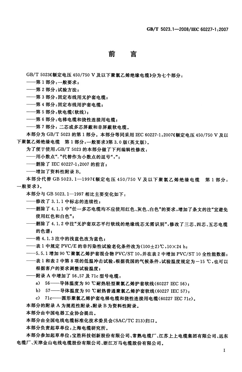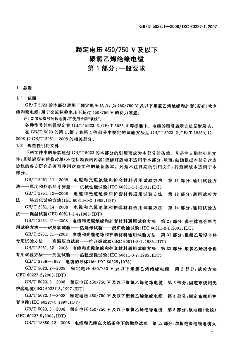 GB/T 5023.1-2008额定电压450/750V及以下聚氯乙烯绝缘电缆 第1部分:一般要求