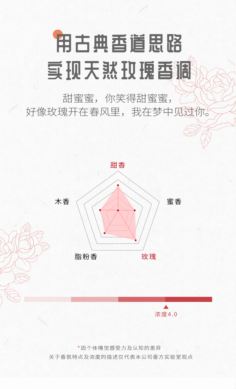 玫瑰的纯甜气息在空间中弥漫,高度还原自然玫瑰香;檀木的甜香一齐迸发,花与木的气息谐和而温柔,营造复古高雅的清丽氛围。