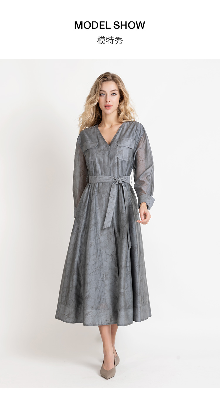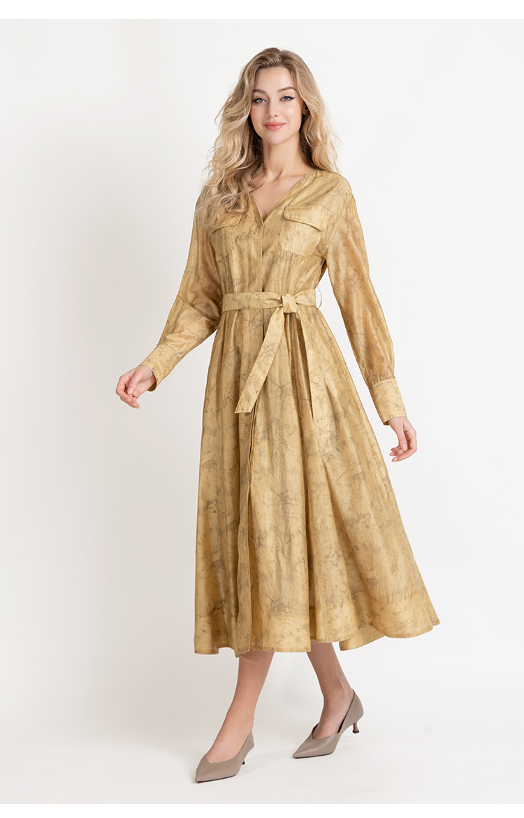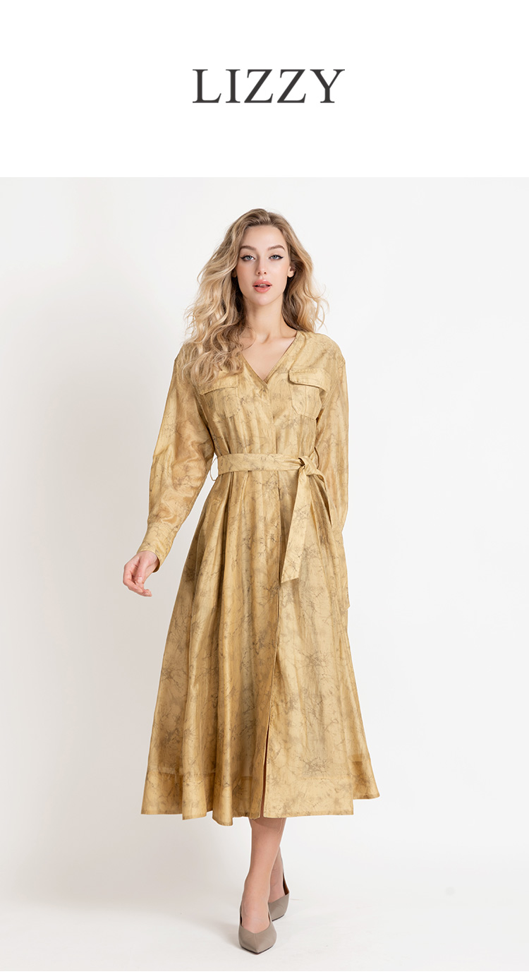 LIZZY法式优雅手绘印花工装风高级感气质V领大摆连衣裙8025