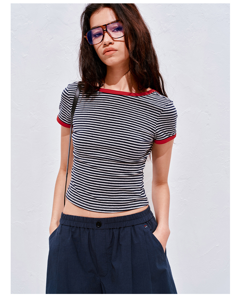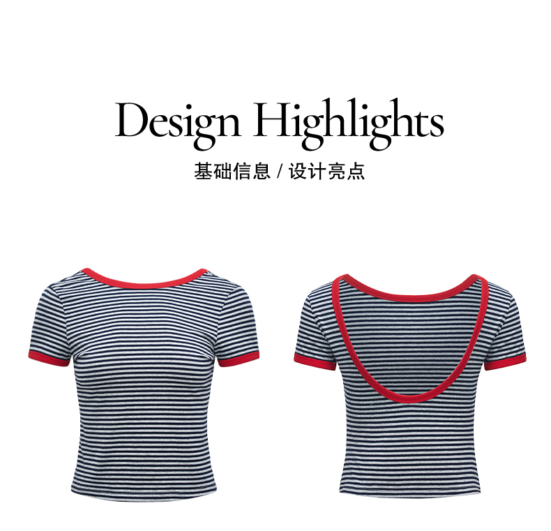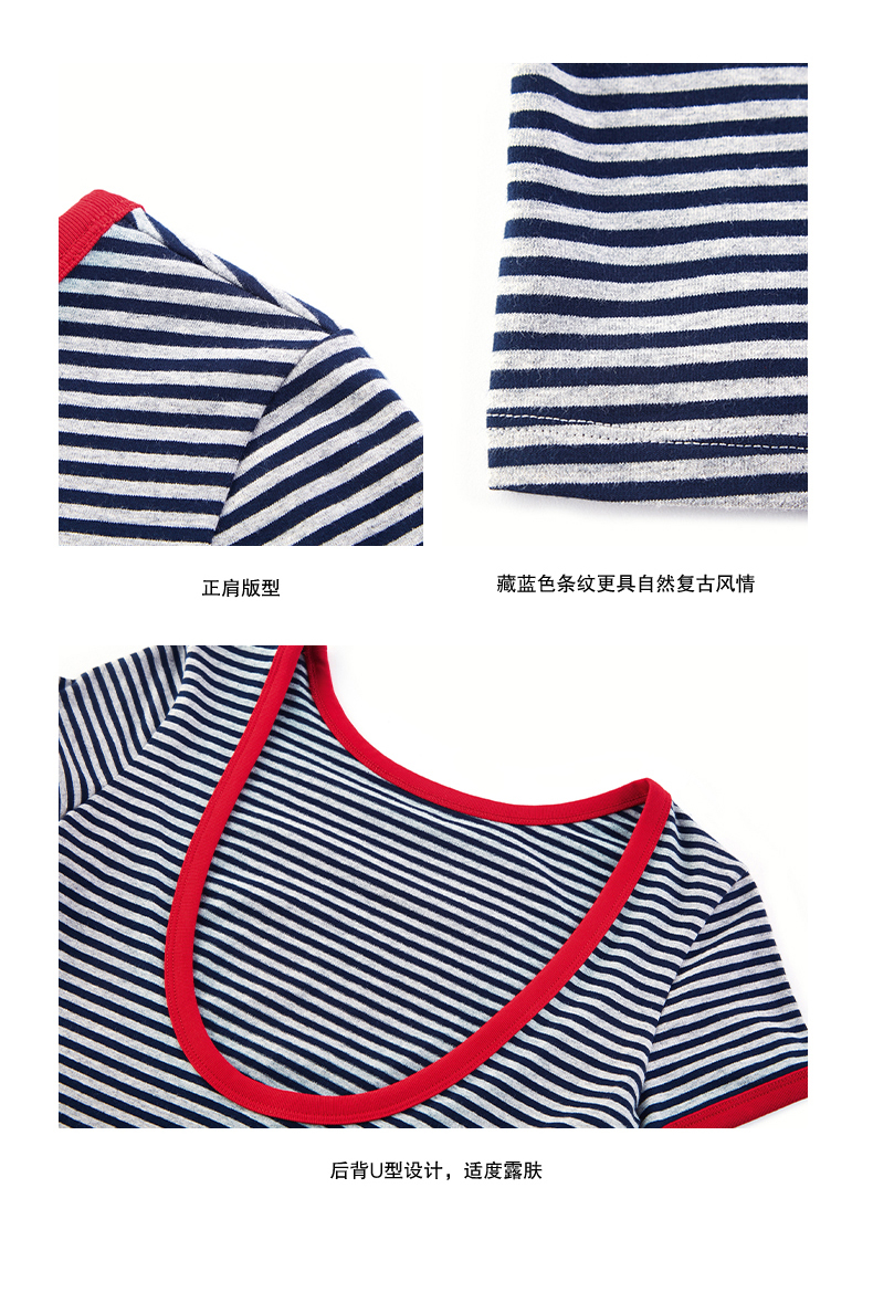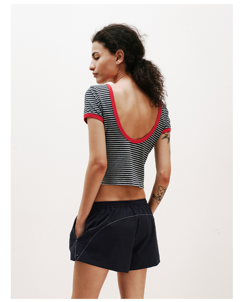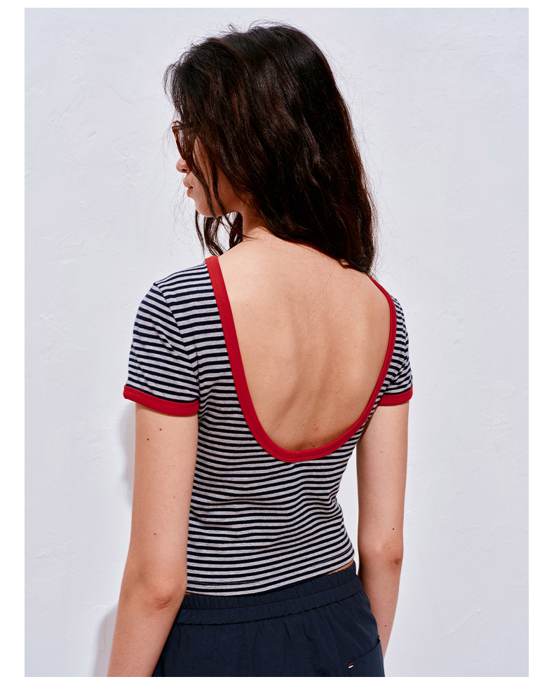NUTH复古条纹撞色露背圆领修身短袖T恤女