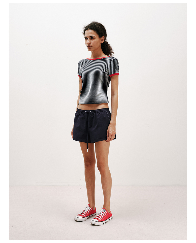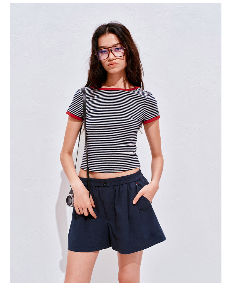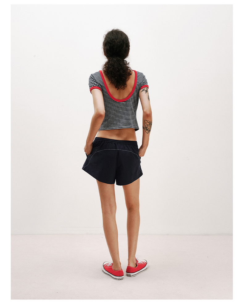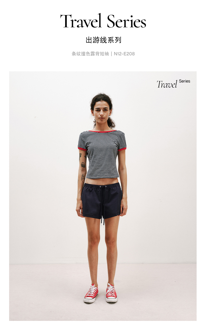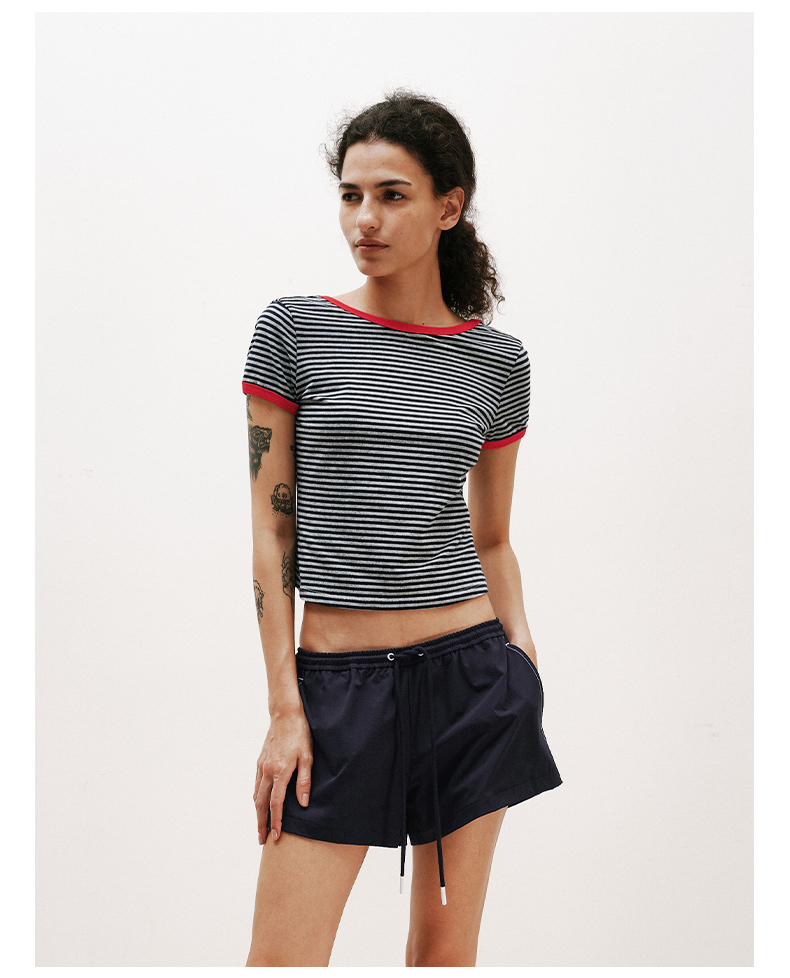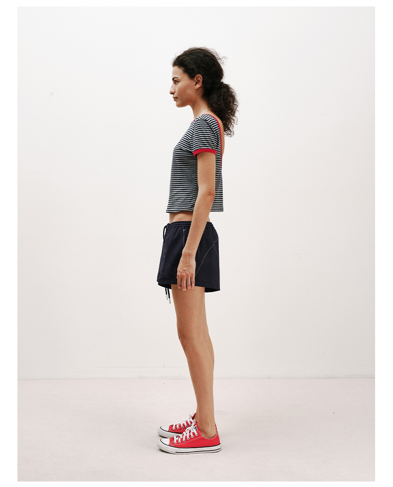 NUTH复古条纹撞色露背圆领修身短袖T恤女
