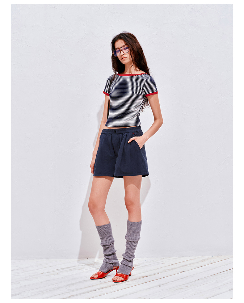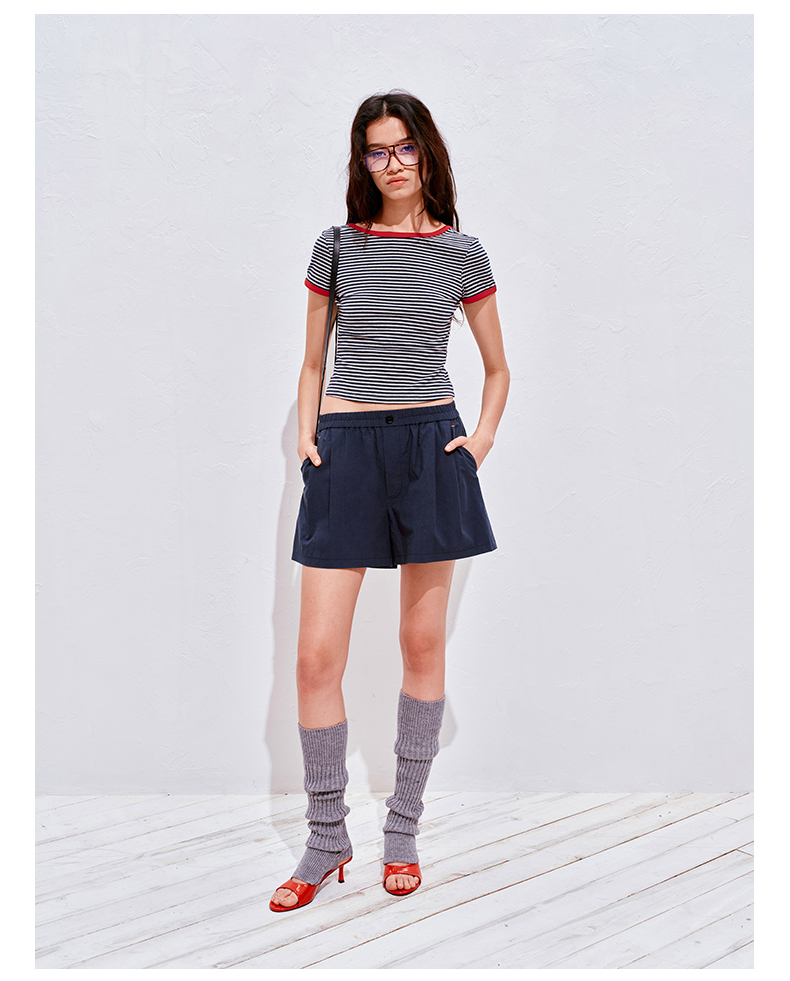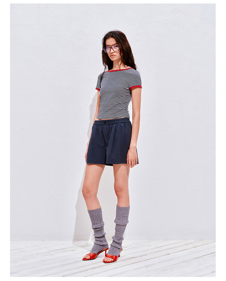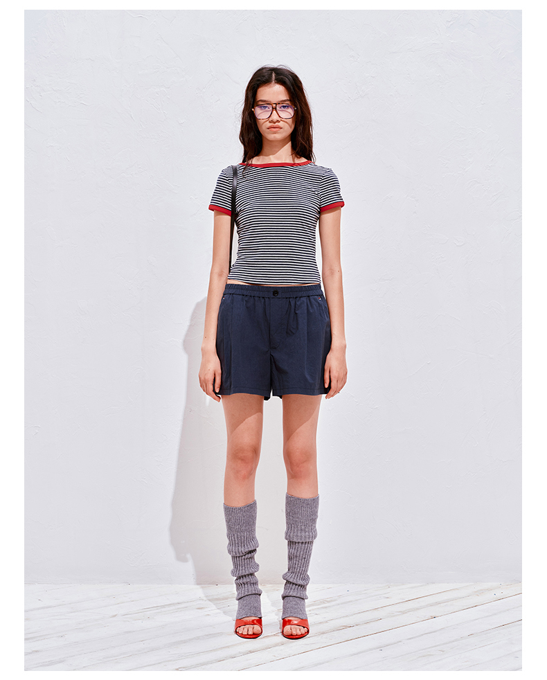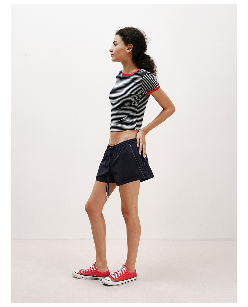 NUTH复古条纹撞色露背圆领修身短袖T恤女