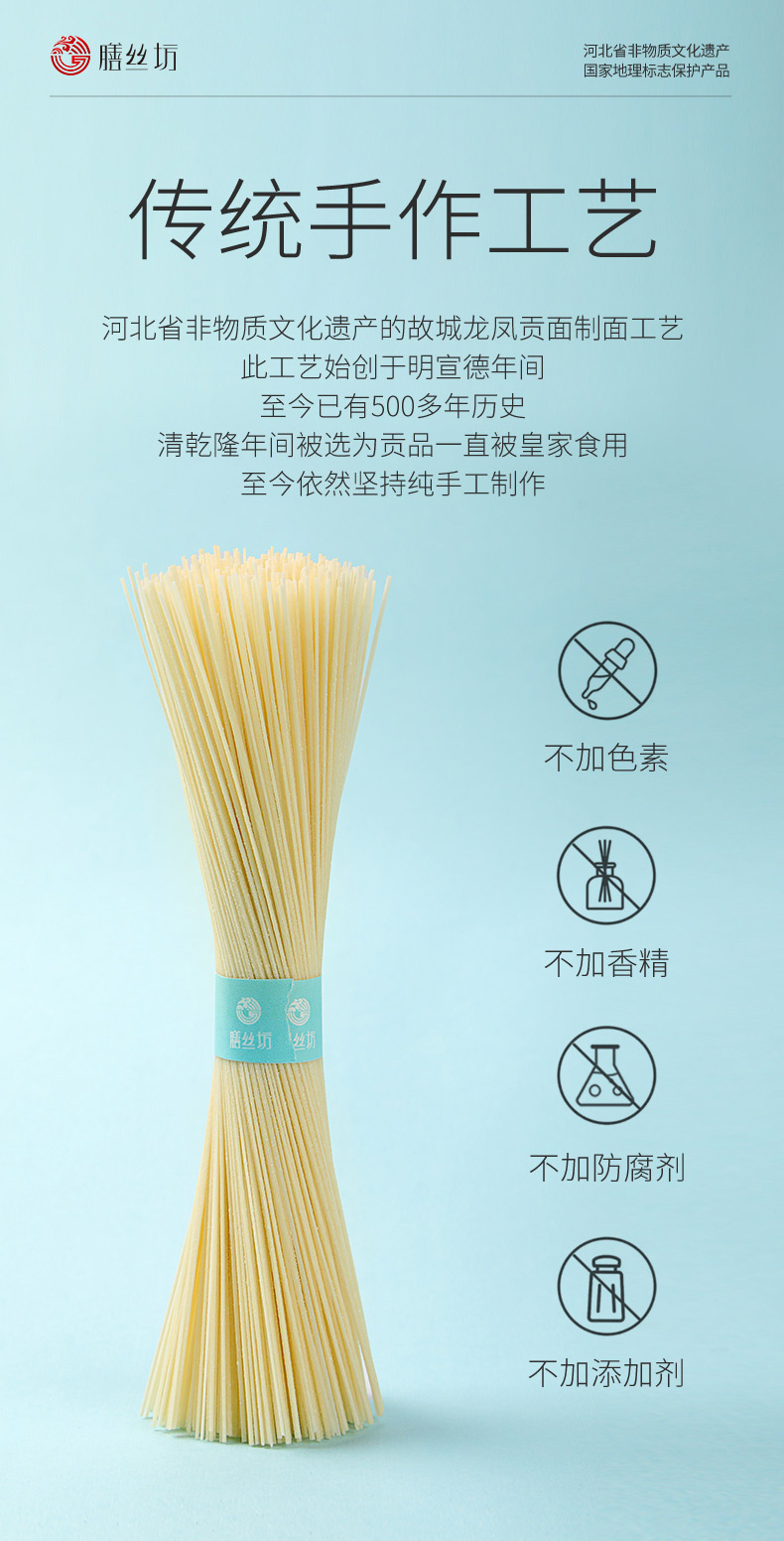 非遗美食【膳丝坊】龙凤贡面 手工空心挂面 细如丝 空如竹 韧如藤 久煮不烂 久放不坨 40秒即熟 配料干净