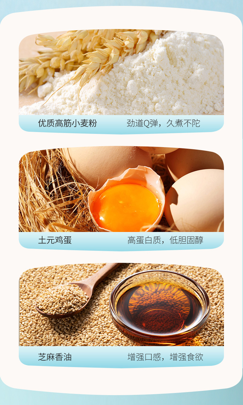 极细手延龙须面:优质专用高筋小麦粉、鸡蛋、芝麻油、食用盐、水