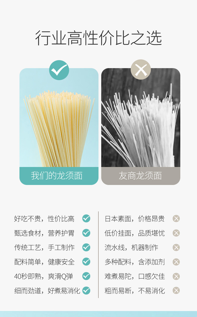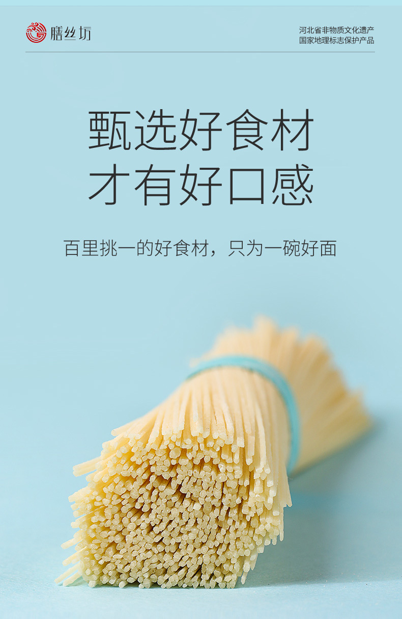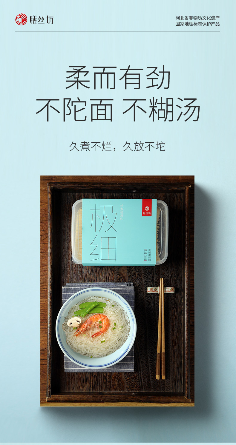 3、龙凤贡面作为河北故城的非遗地标美食,500多年代代传承,独家空心技艺,40秒即熟,久煮不烂、久放不坨;