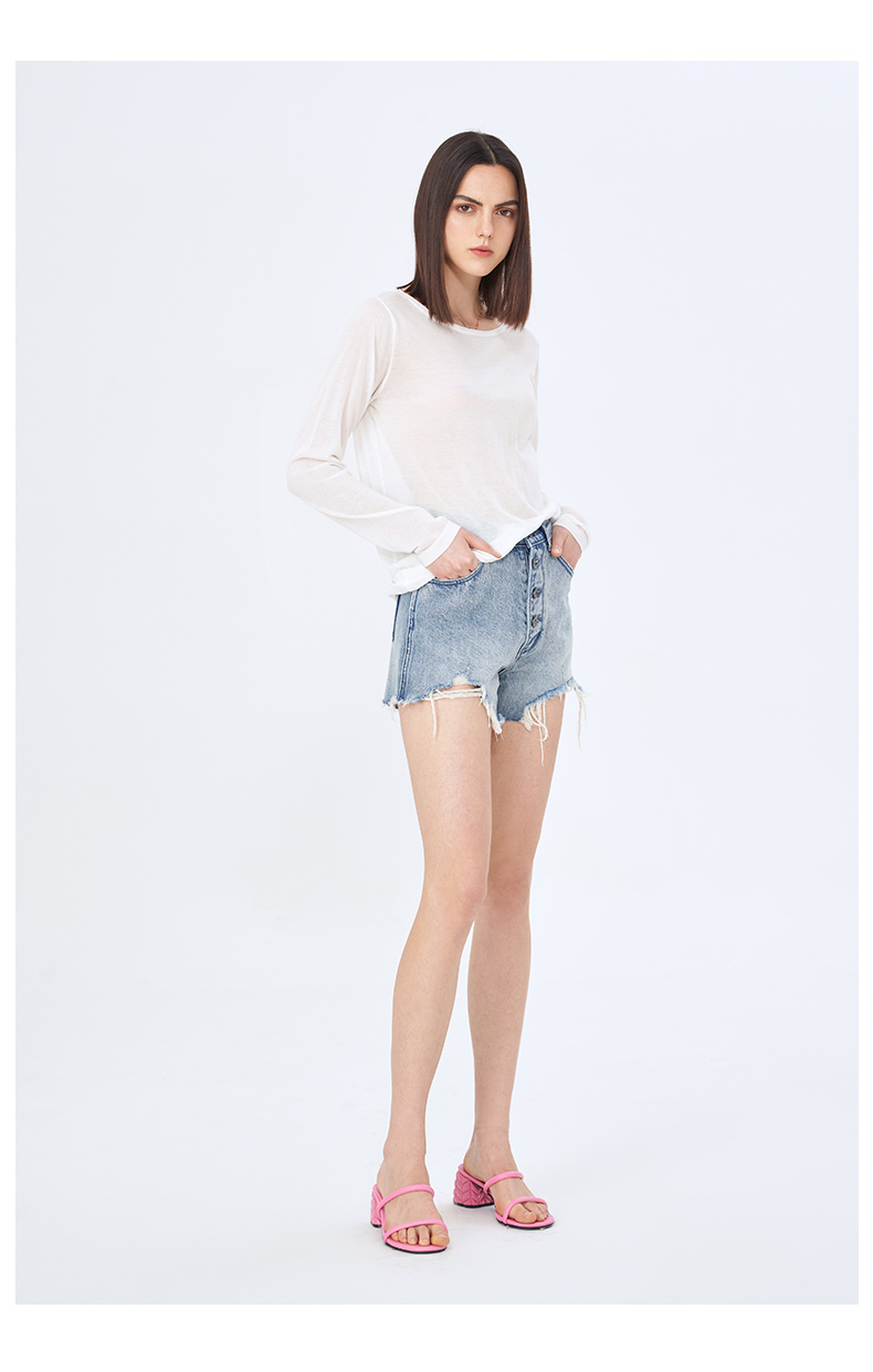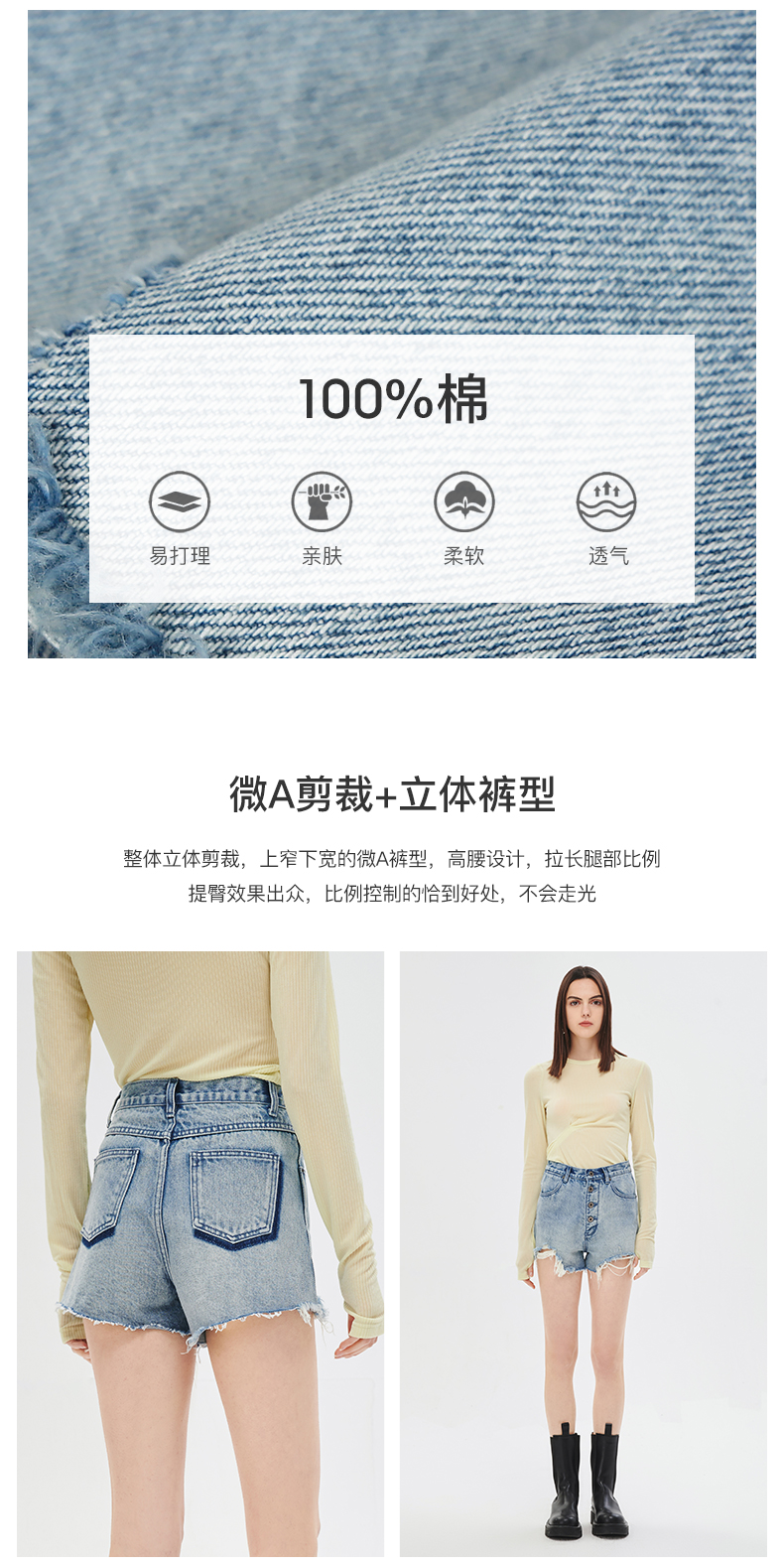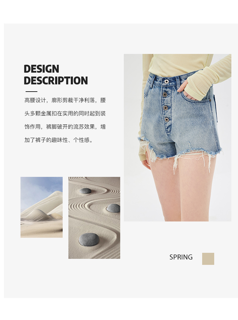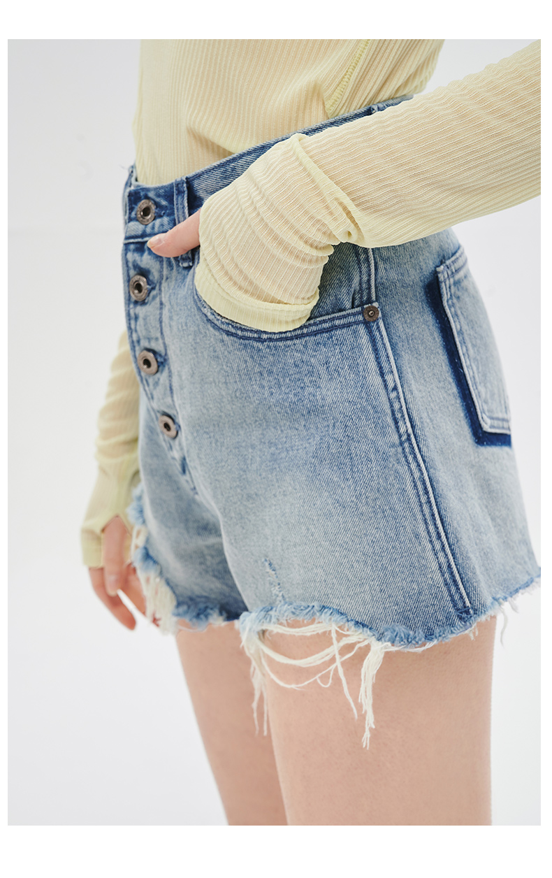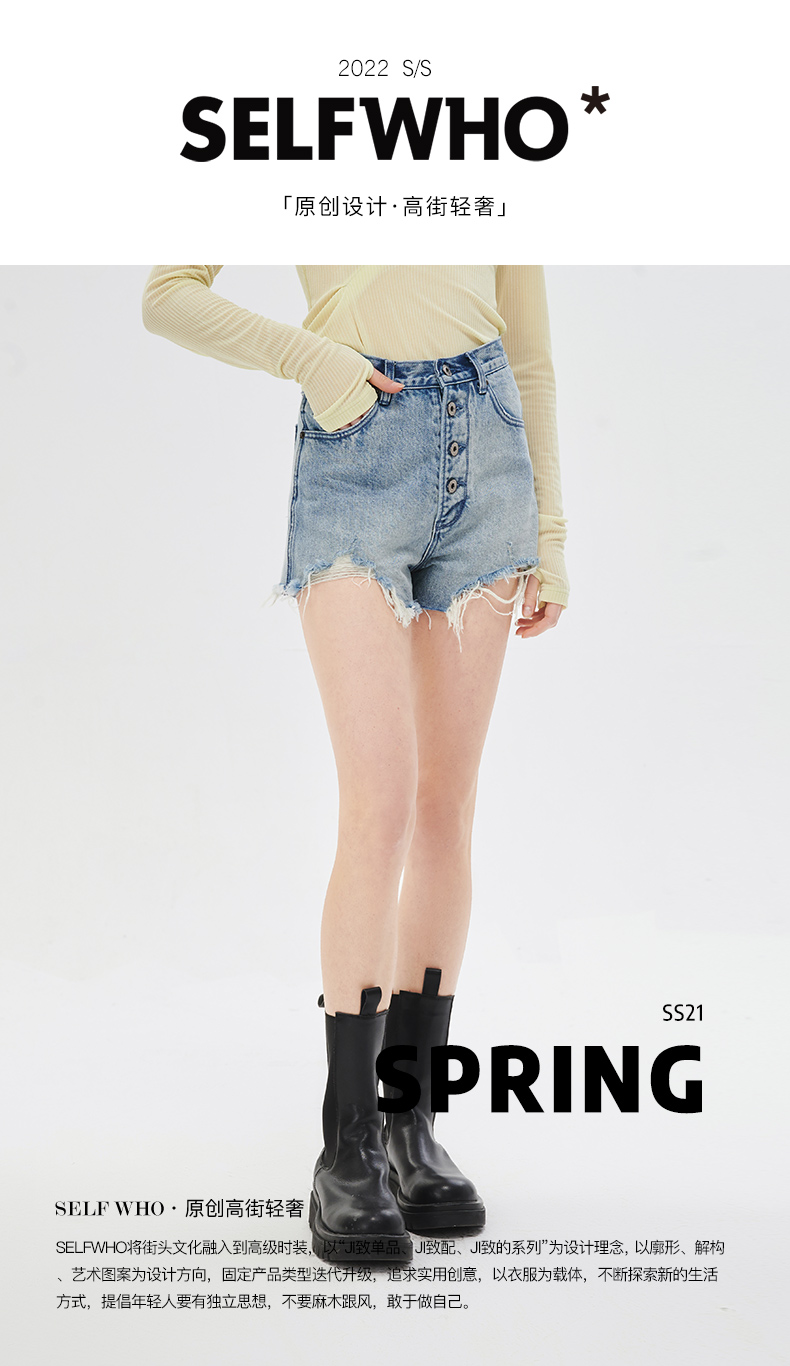 Self Whoins风时髦百搭高腰猫须流苏洗水撞色浅蓝色牛仔短裤女