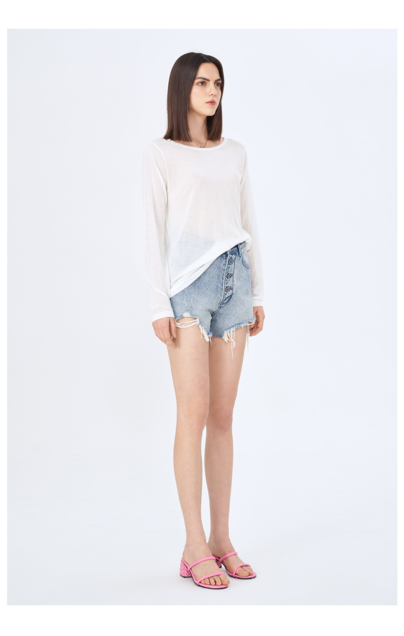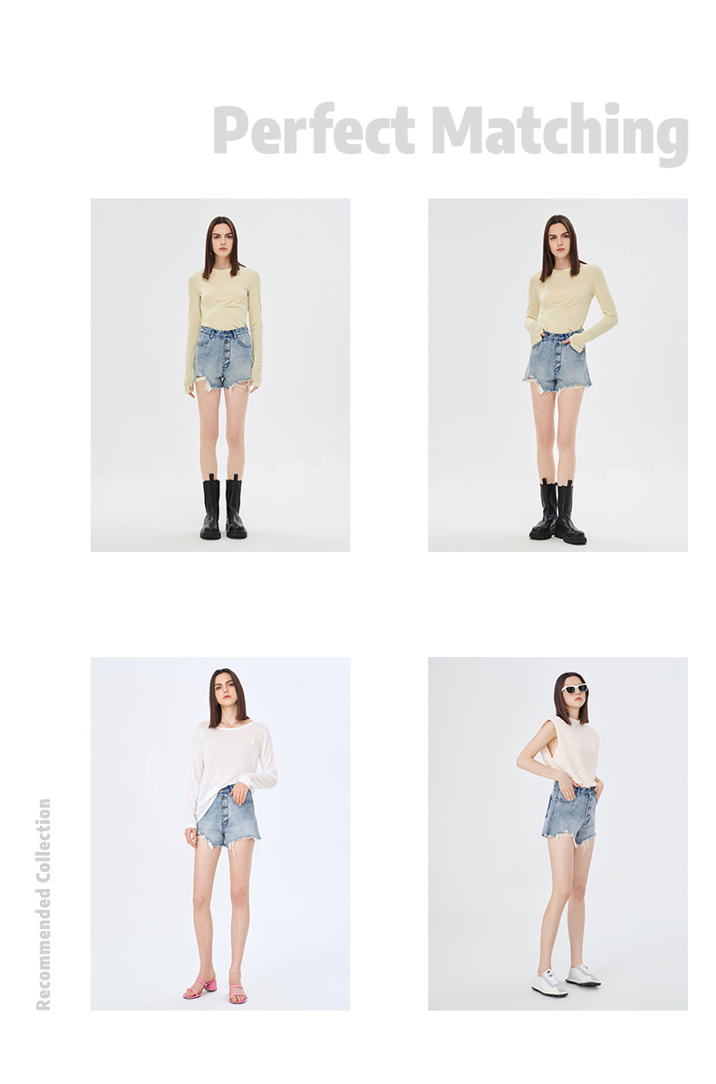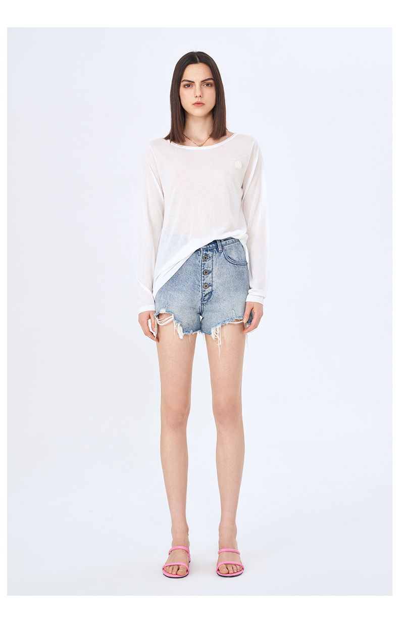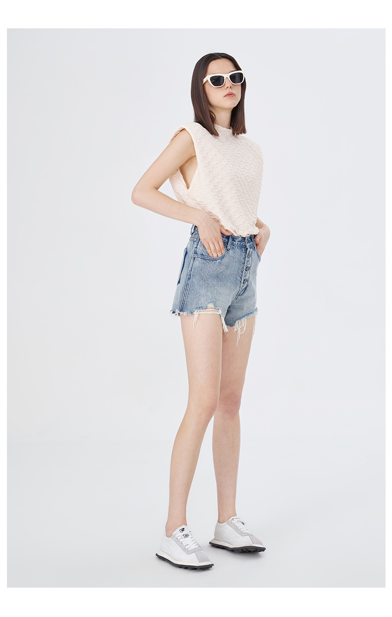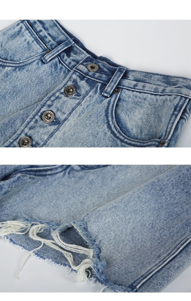 Self Whoins风时髦百搭高腰猫须流苏洗水撞色浅蓝色牛仔短裤女