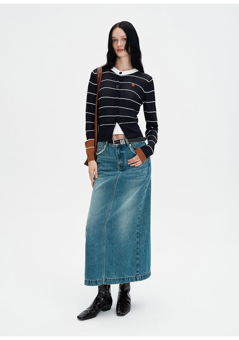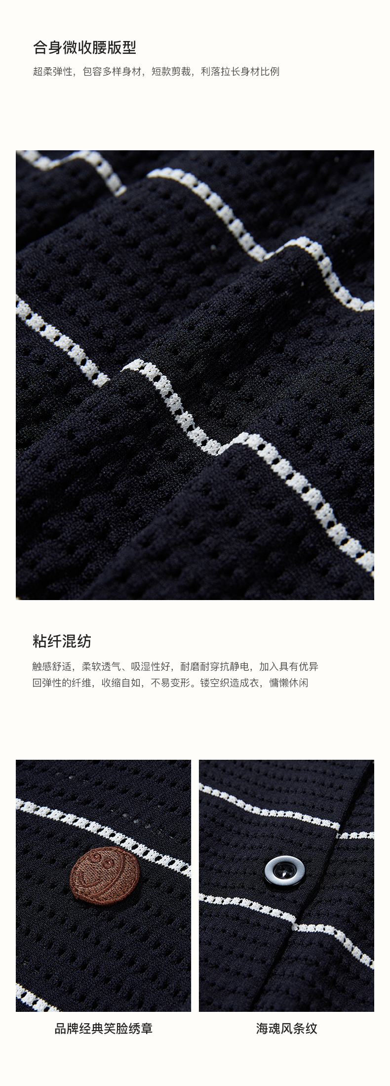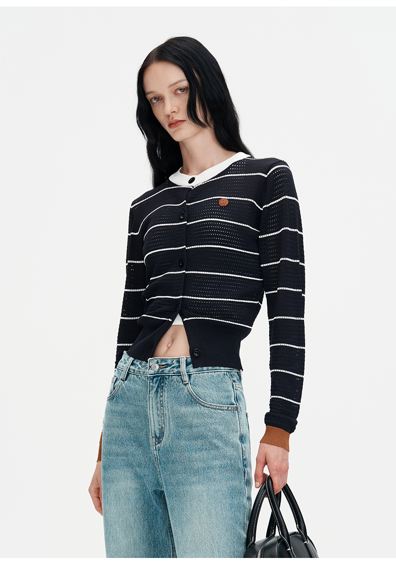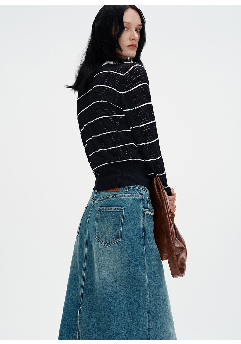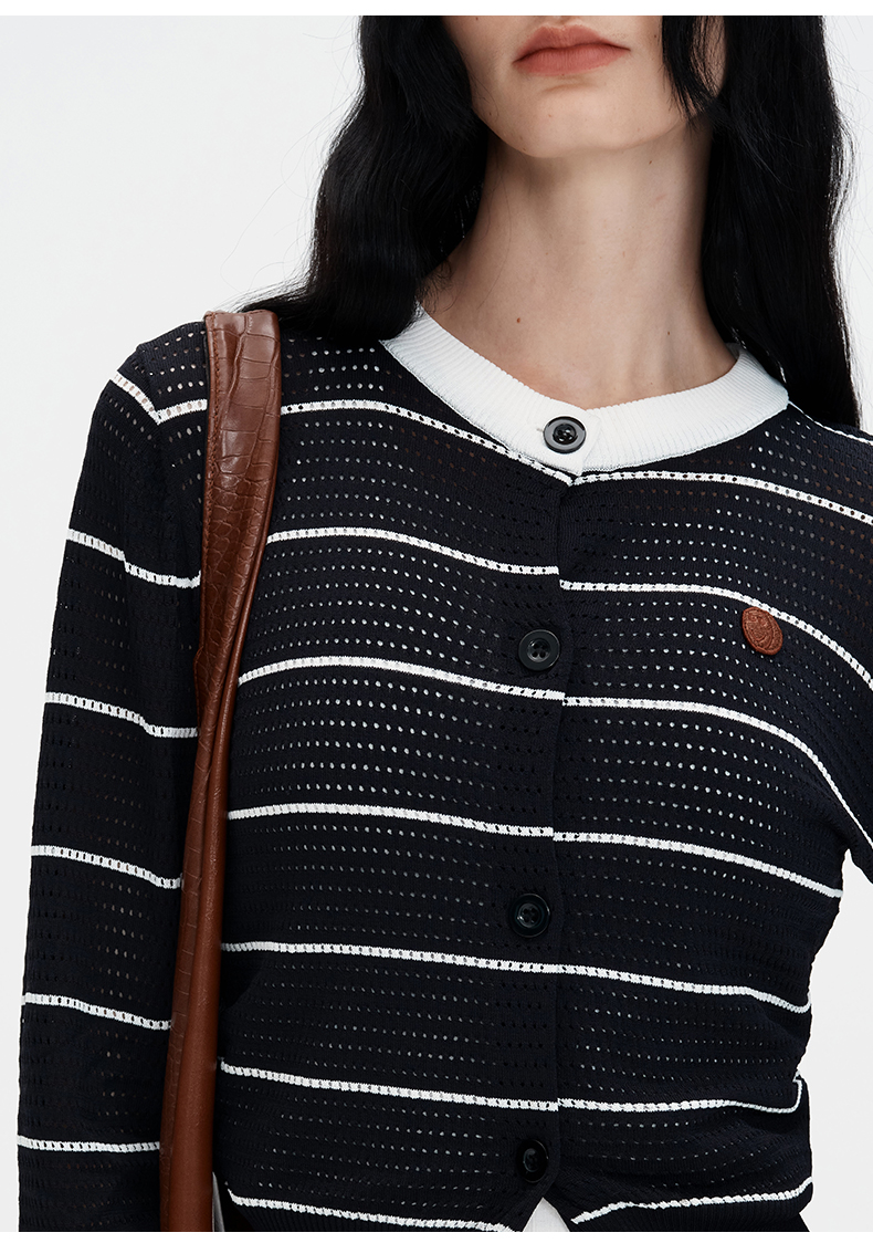 【笑脸衣橱】SELFWHO黑色镂空条纹针织衫长袖女秋季2024新款高级慵懒通勤收腰上衣