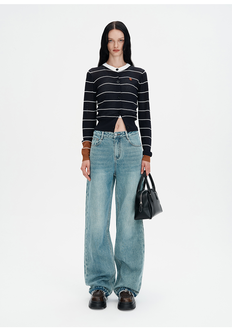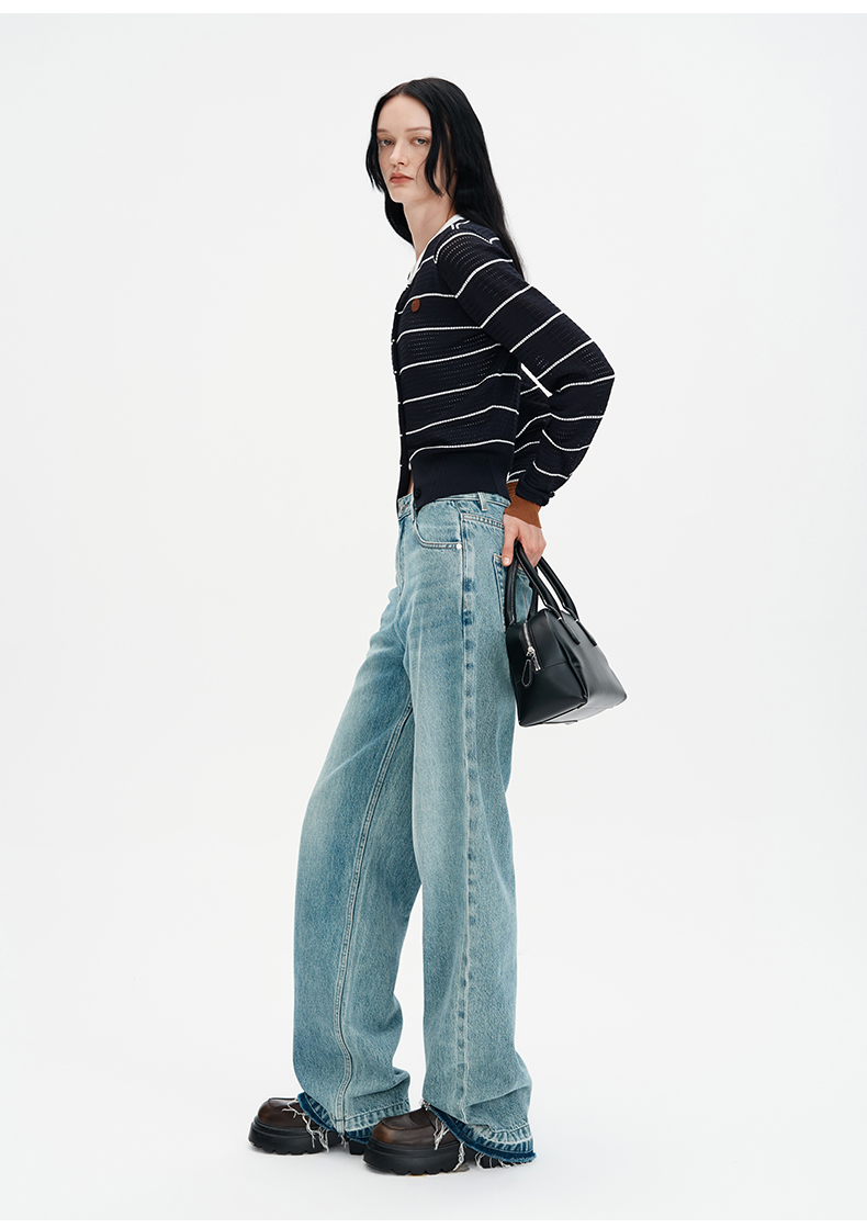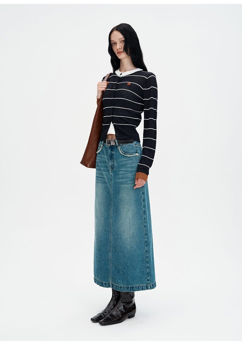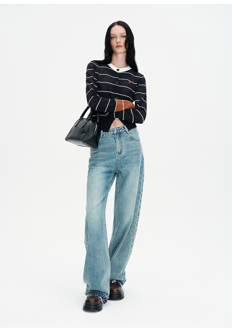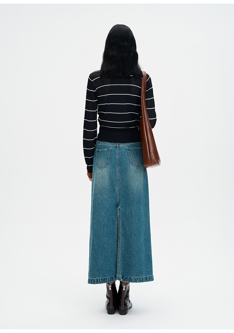 【笑脸衣橱】SELFWHO黑色镂空条纹针织衫长袖女秋季2024新款高级慵懒通勤收腰上衣