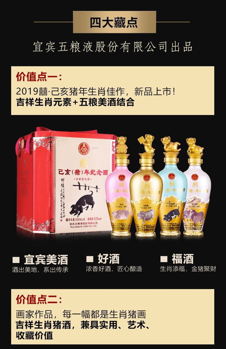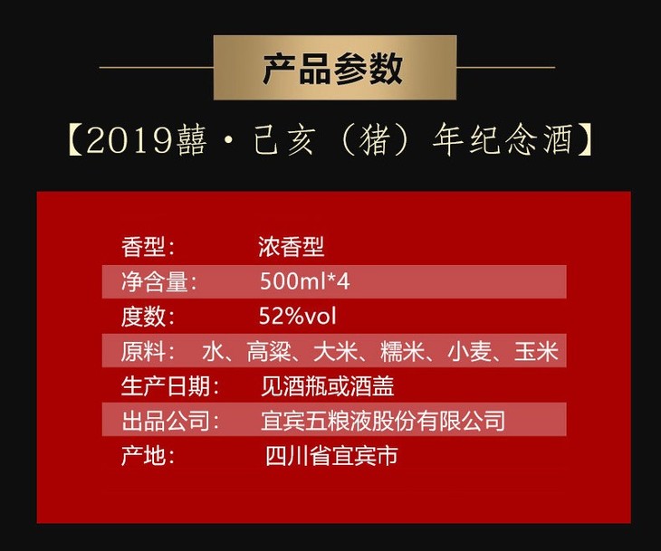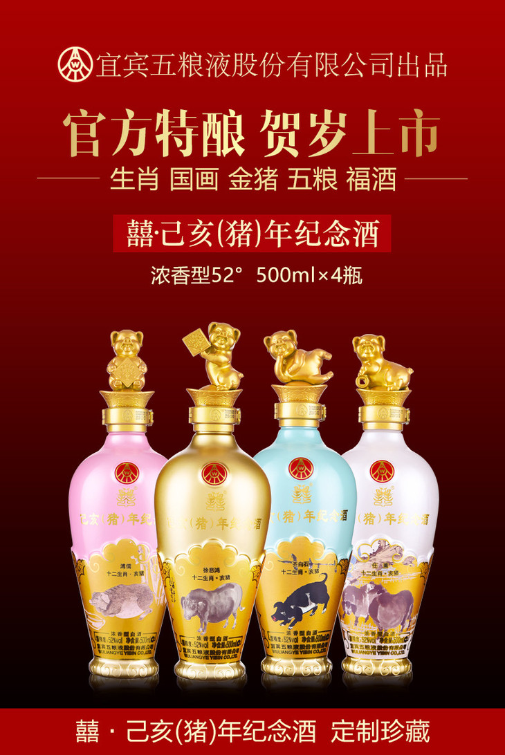 五粮液股份 出品 己亥猪年生肖纪念酒 52度 2019年浓香型白酒 500ml*4瓶 整箱装