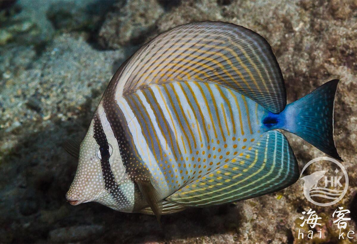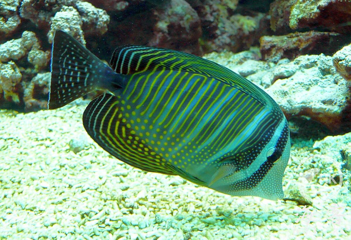 也叫印度大帆吊,或红海大帆吊。暗色的身体带着非常明亮的条纹及斑点。有一条蓝色带白斑点的尾巴。亚成鱼(图示亚成鱼)比成鱼颜色鲜艳。当背鳍及臀鳍张开时,其身体尺寸能增大一倍。