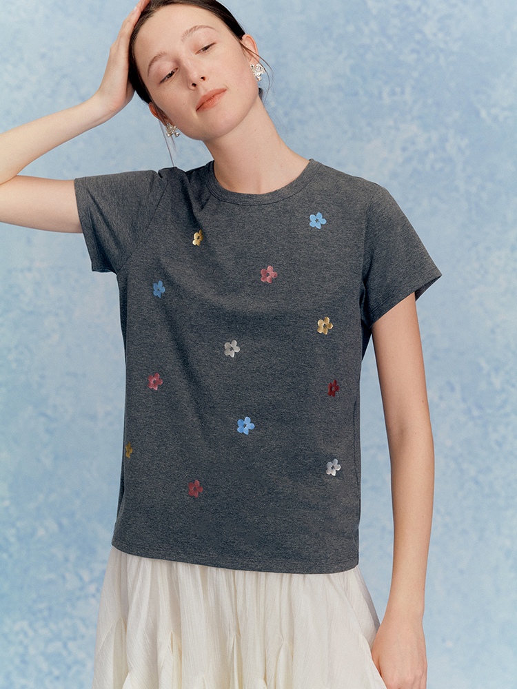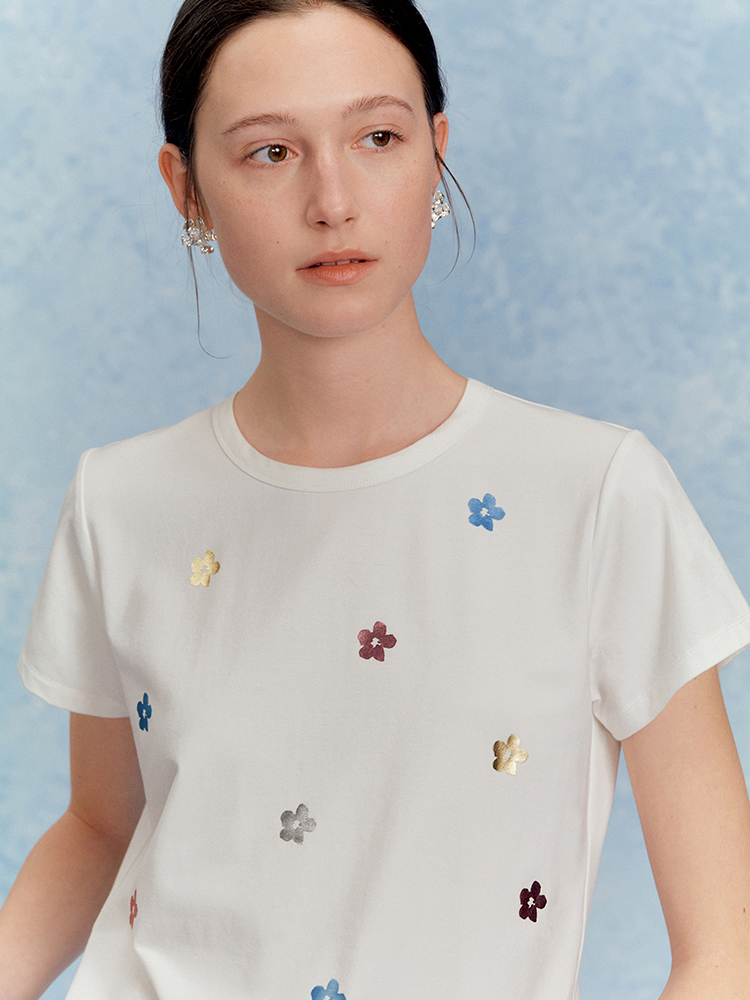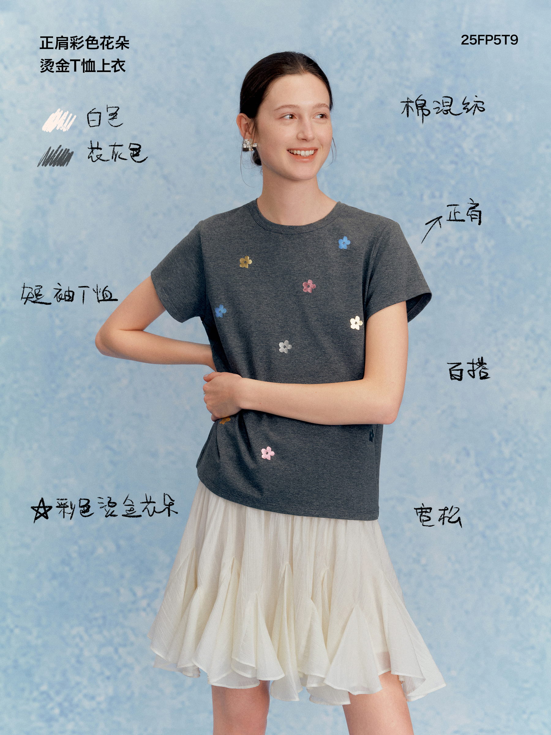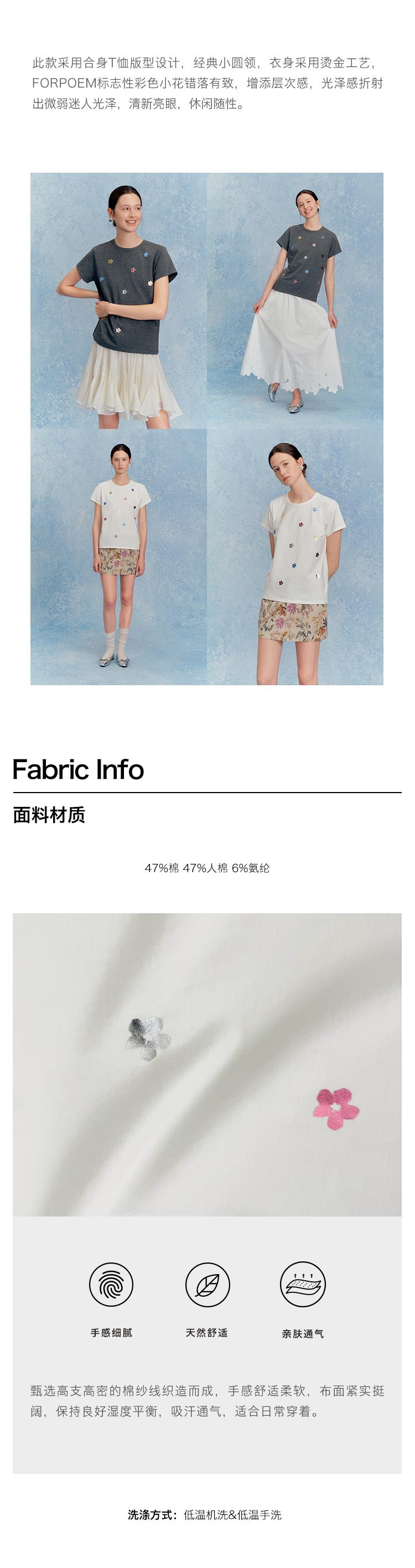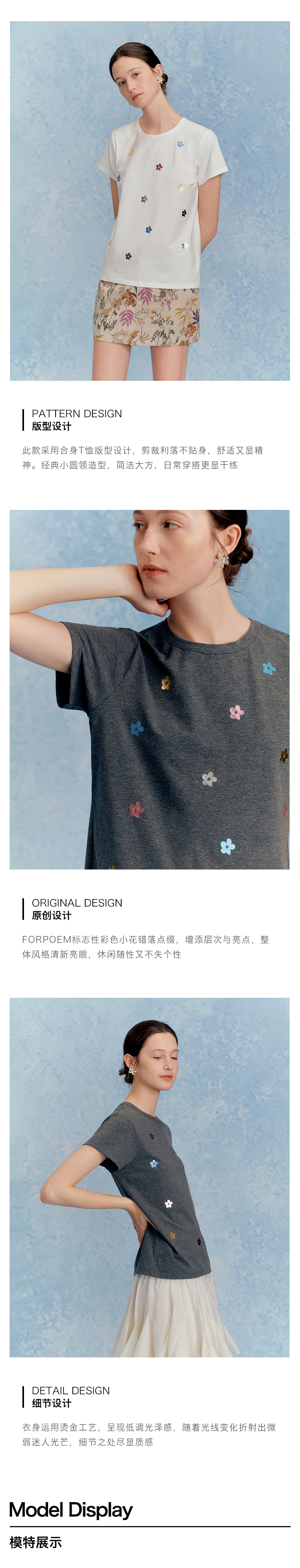 ForPoem 现货 25/SS原创设计棉混纺正肩彩色花朵烫金T恤上衣