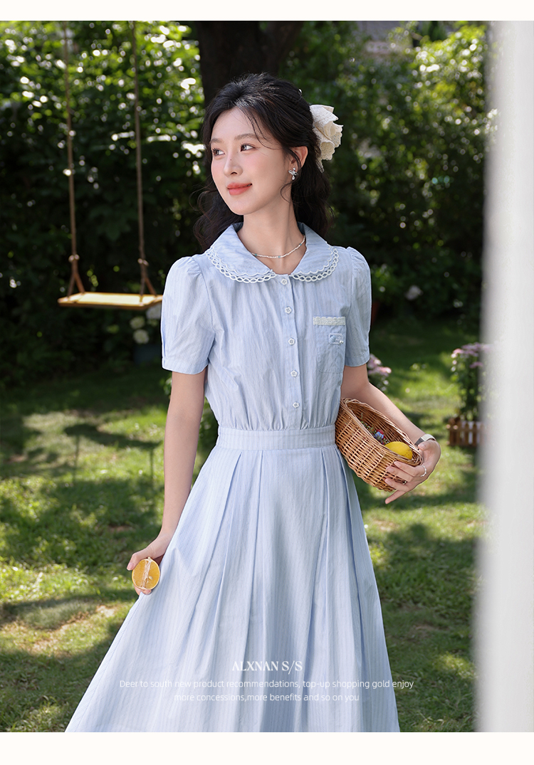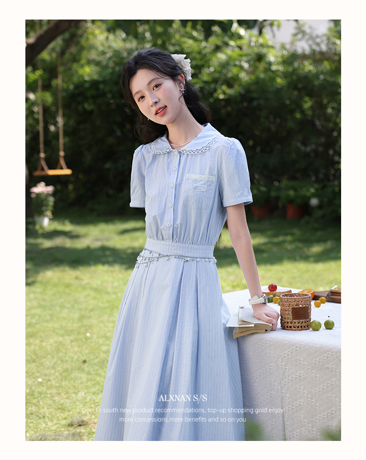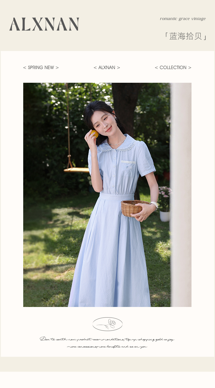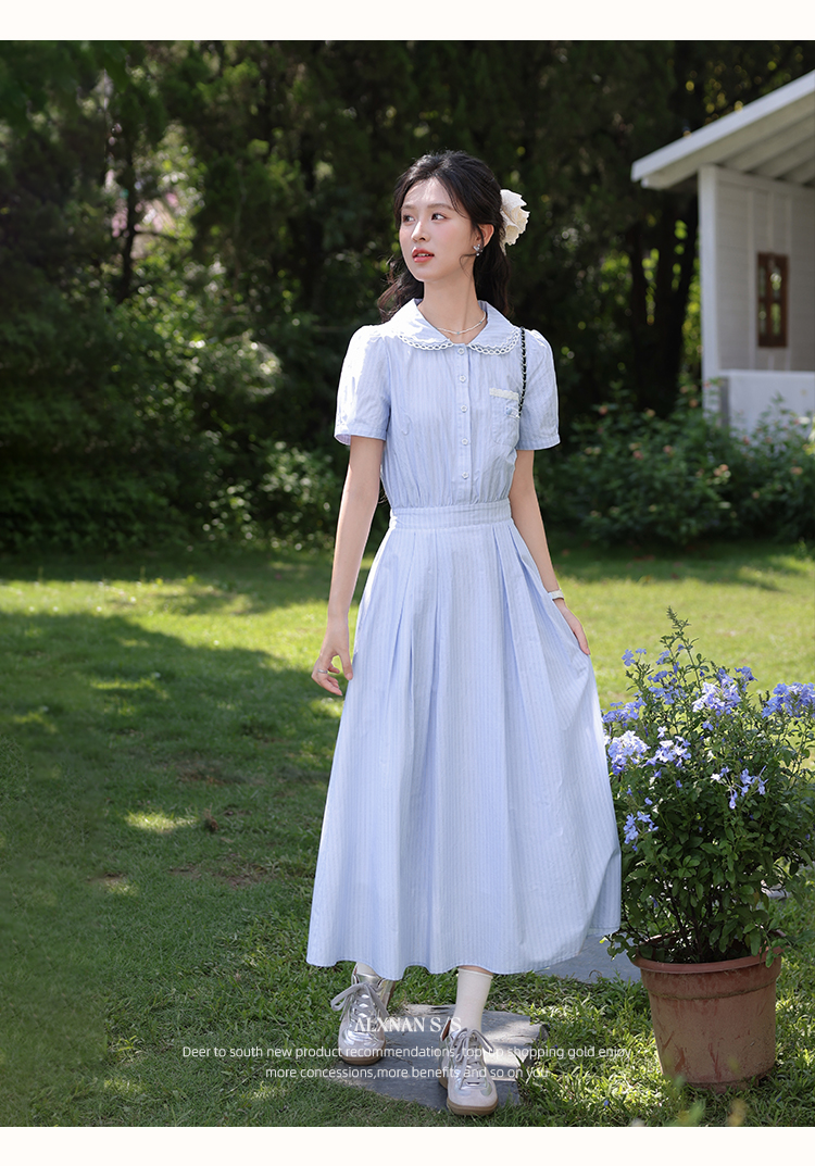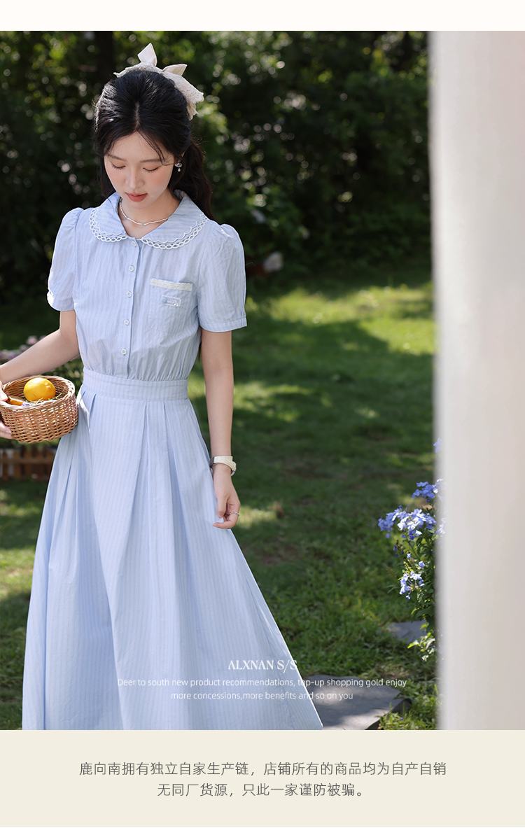 【65折秒杀】鹿向南「蓝海拾贝」法式蓝色条纹短袖衬衫连衣裙女夏季收腰长裙子