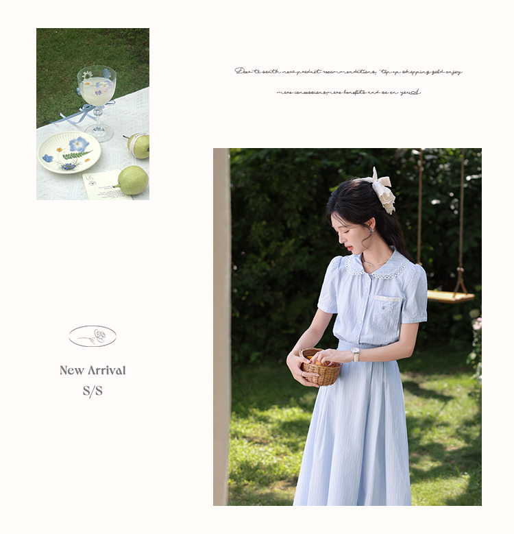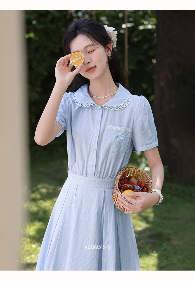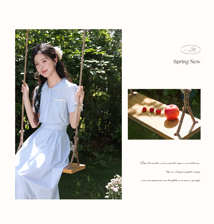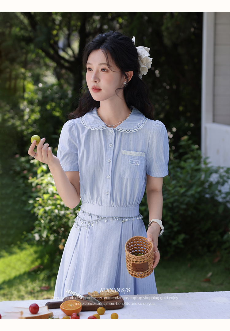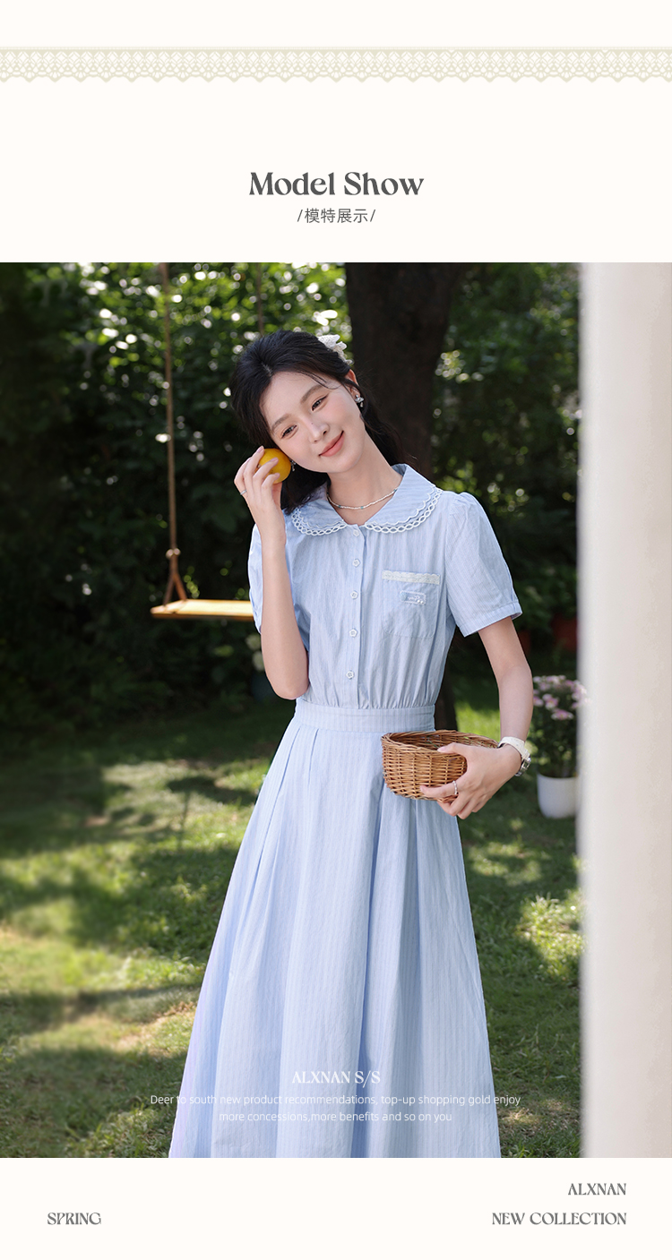 【65折秒杀】鹿向南「蓝海拾贝」法式蓝色条纹短袖衬衫连衣裙女夏季收腰长裙子