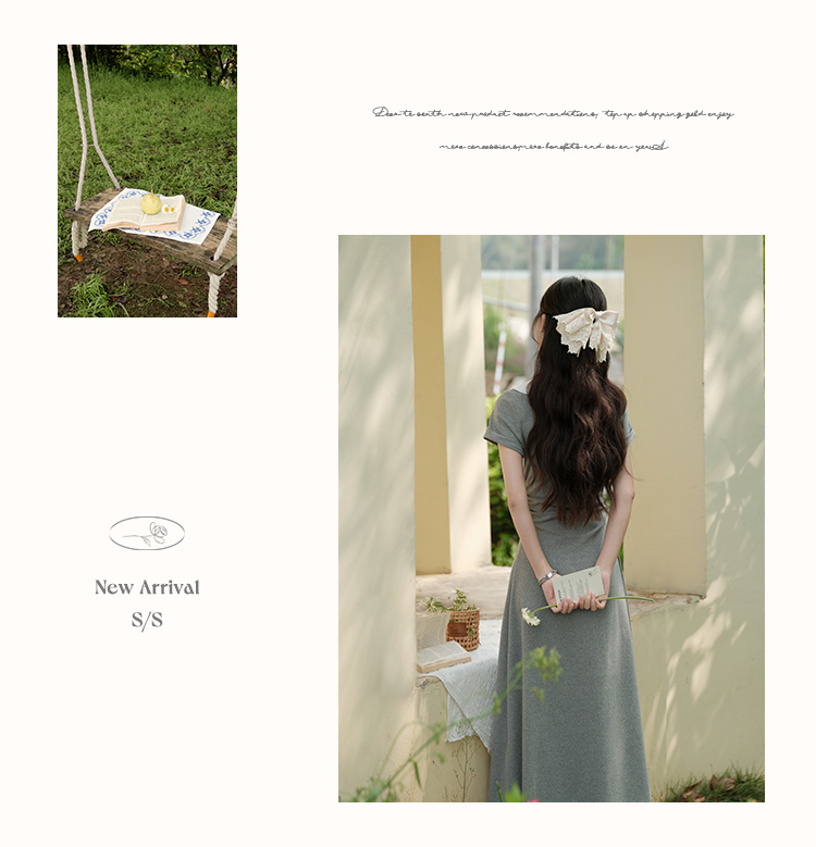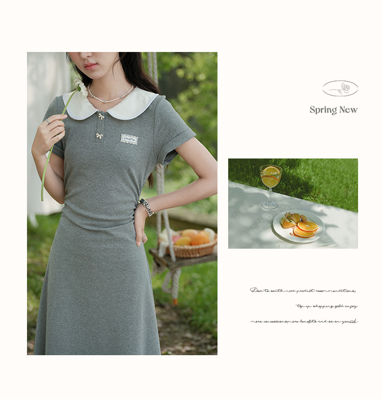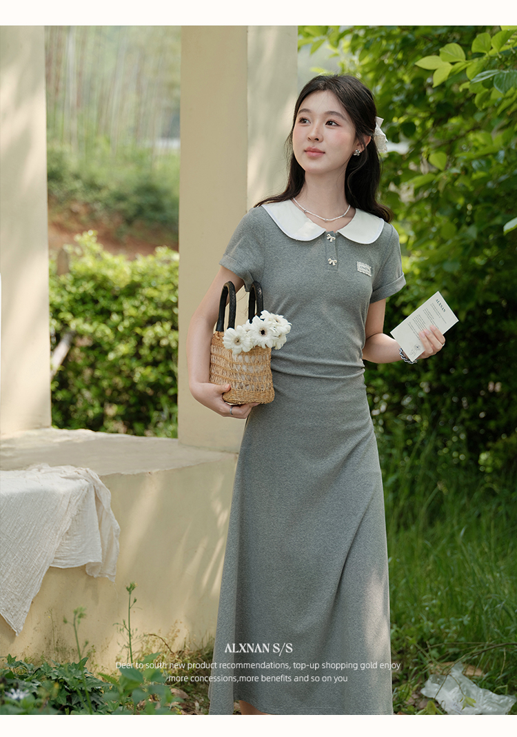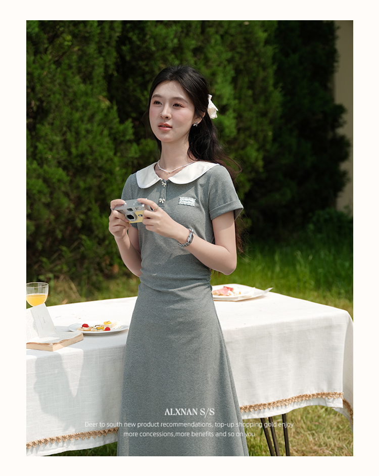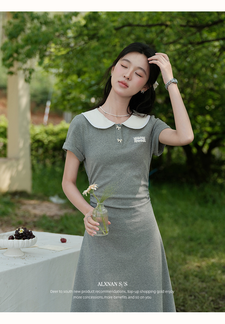 鹿向南「miu系学姐」气质显瘦娃娃领灰色短袖连衣裙女夏A字长裙