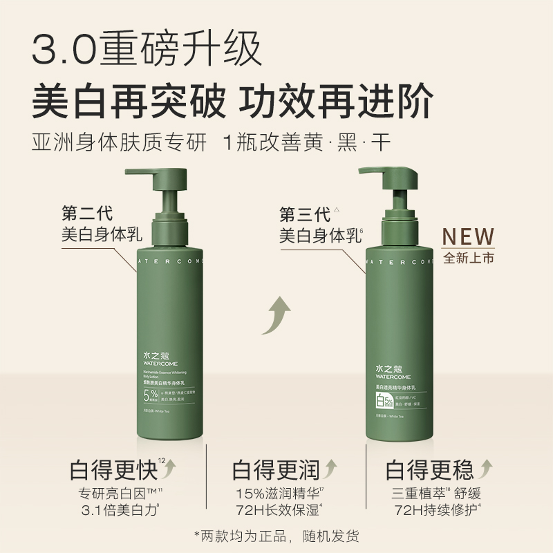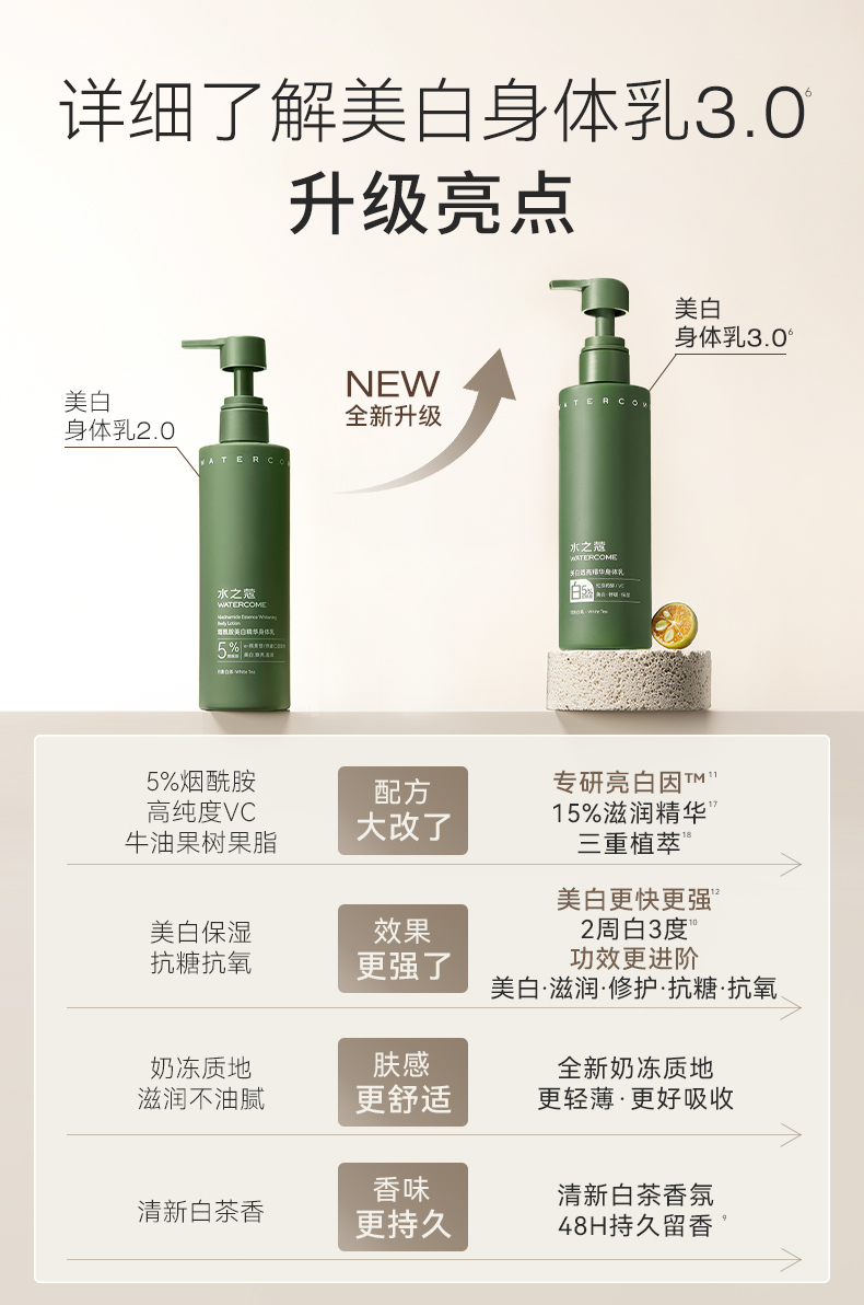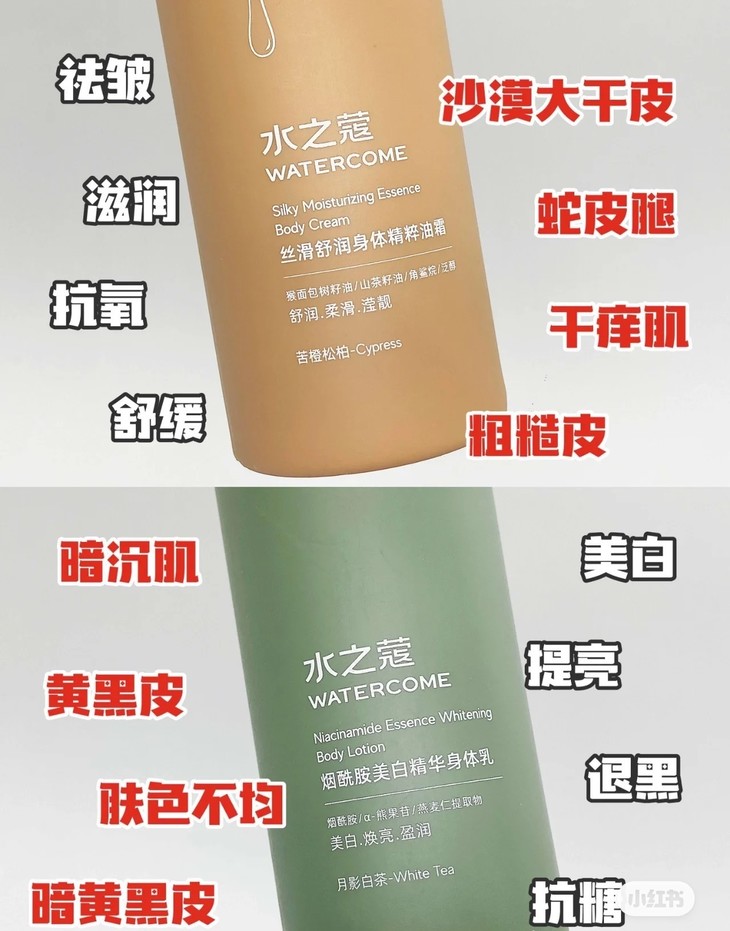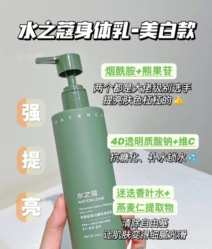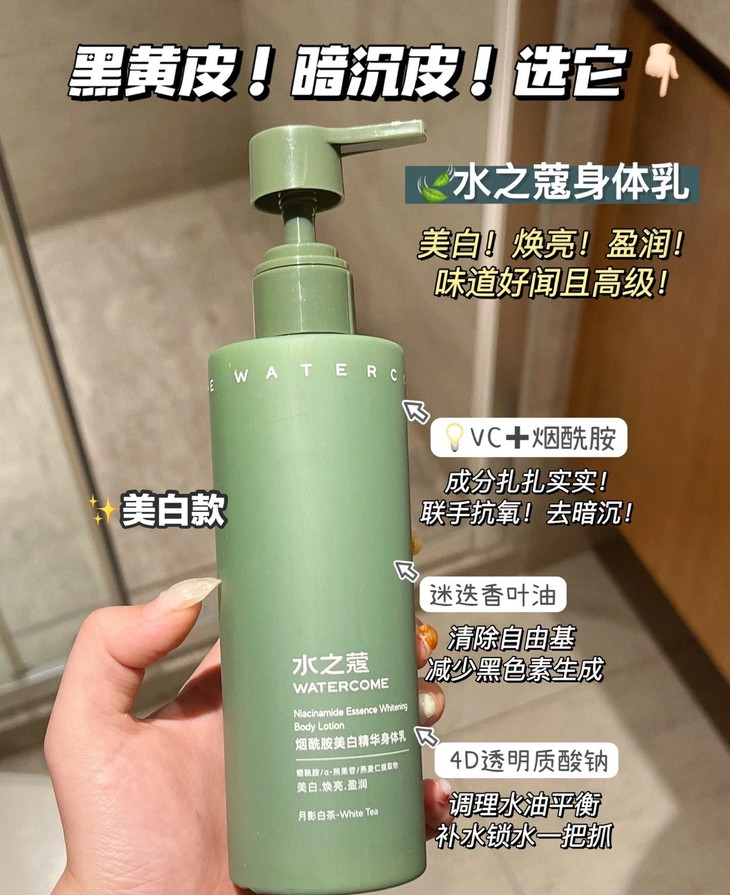 水之蔻家烟酰胺美白精华身体乳不仅美白效果好,保湿润肤的效果也超绝!! 添加4 重润肤精粹,哪怕是身在北方的大干皮在擦了 TA 家身体乳以后, 干燥的皮肤也可以一整天都是润润的~真正地将柔润水嫩融入每一寸肌肤,与干燥起皮的鸡皮肤彻底说拜拜~~
