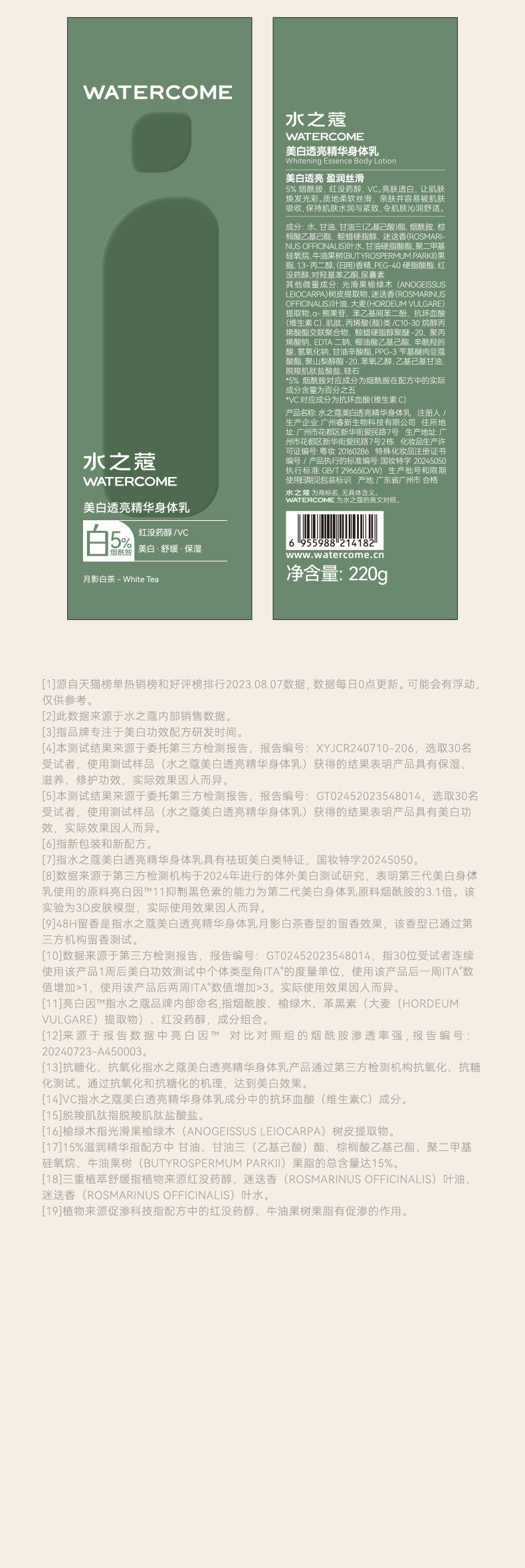 99.6 %纯度的 VC搭配5 %高浓度的烟酰胺, 不仅可以阻隔黑色素的生成及转运,还能抑制 AGEs 的生成和堆积, 有效双重抗糖减黄!!烟酰胺虽然是美白成分里的老大哥,可也不是越多越好滴。 过量的烟酰胺容易导致过敏,而水之蔻家身体乳中所添加的5 %的高浓度烟酰胺就正正好~