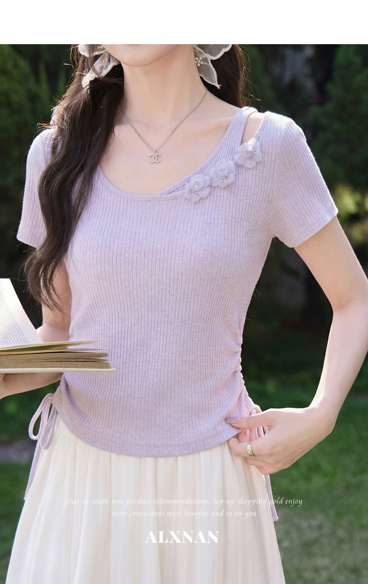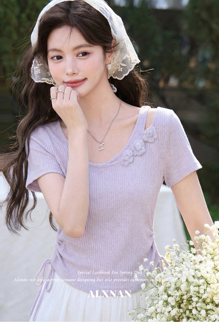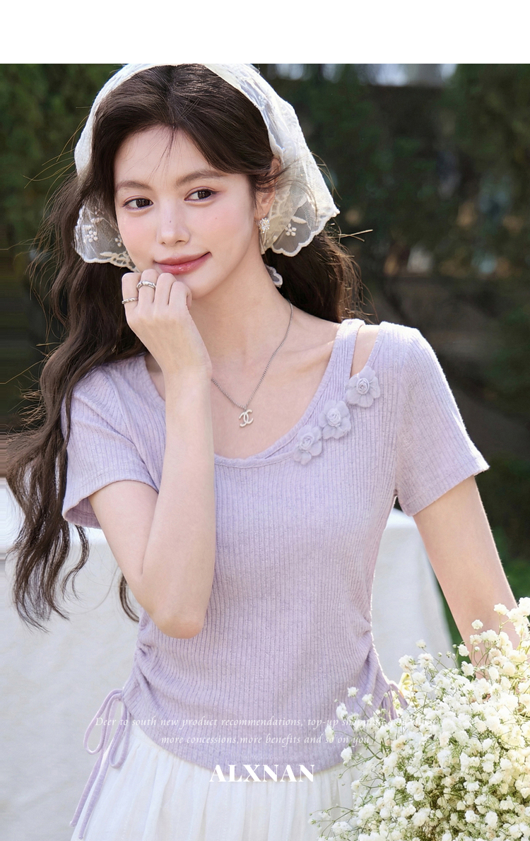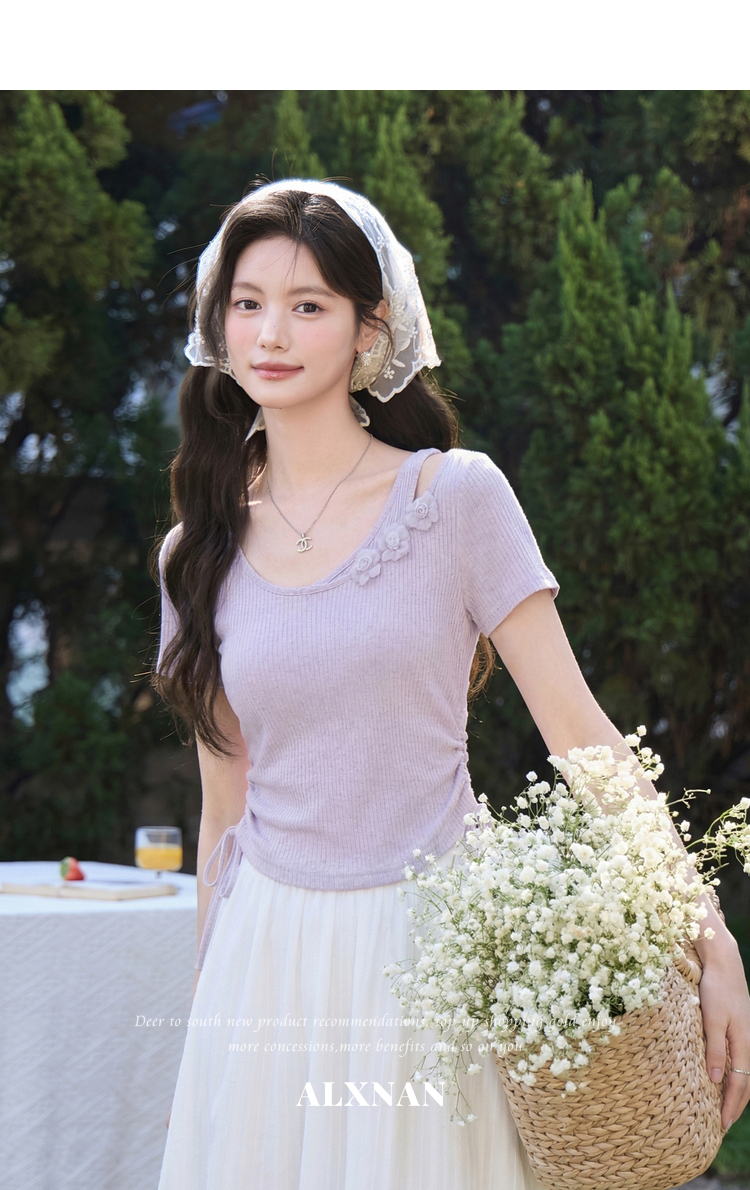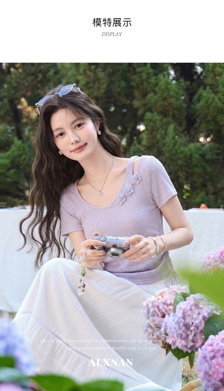 鹿向南「花间柔语」紫色短袖T恤女2026夏新款法式气质设计感上衣