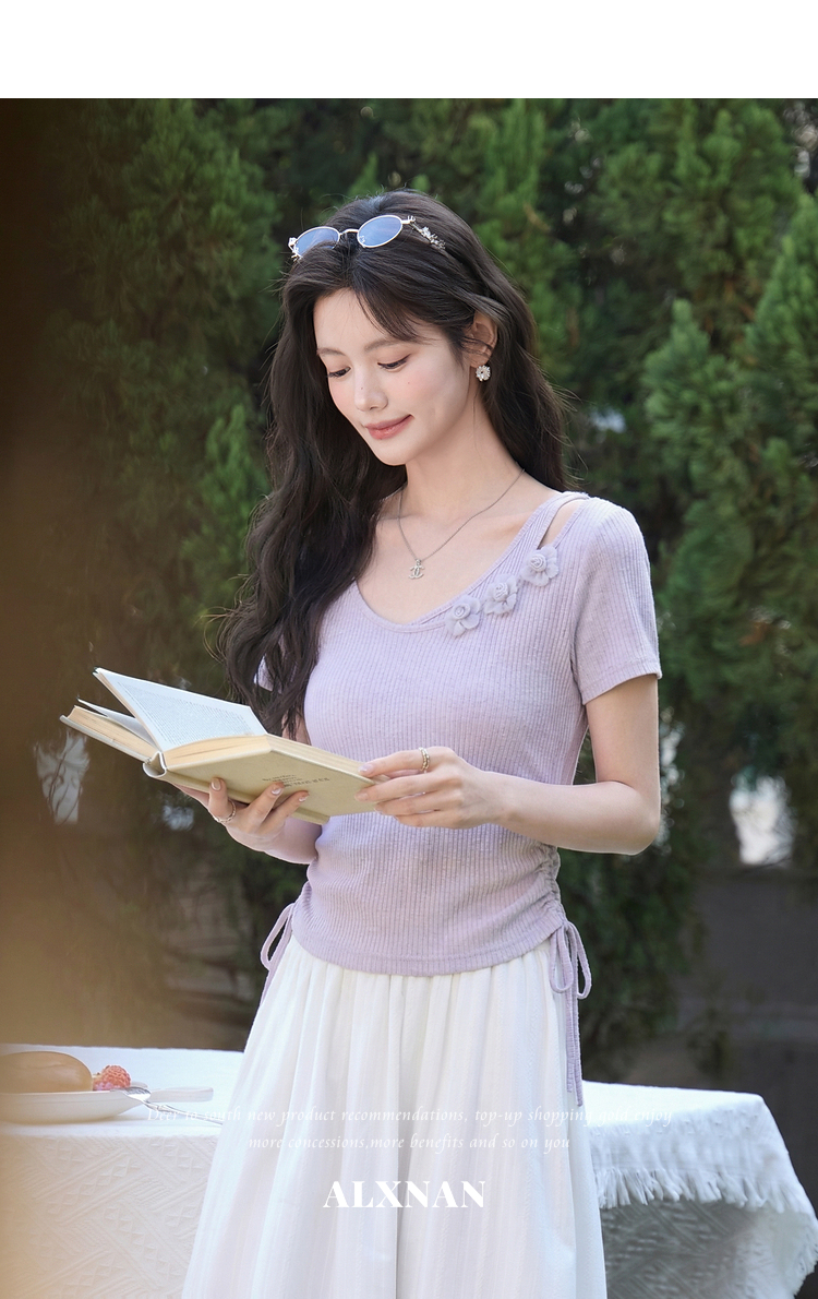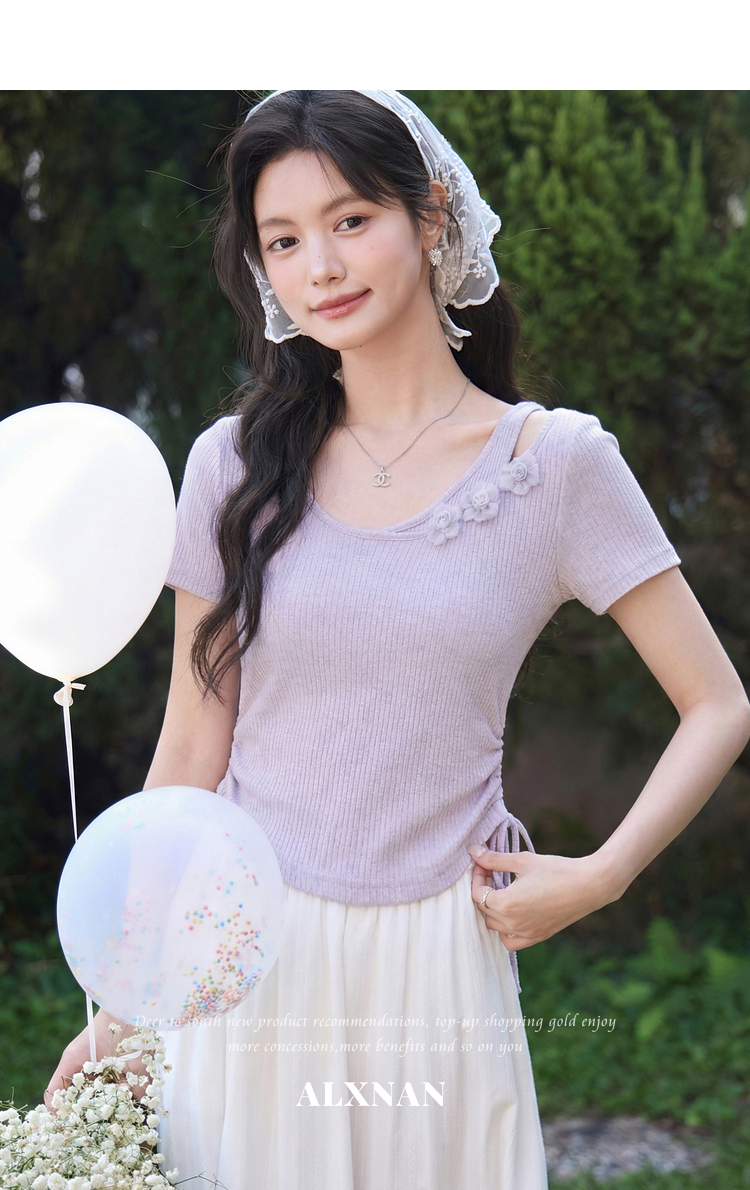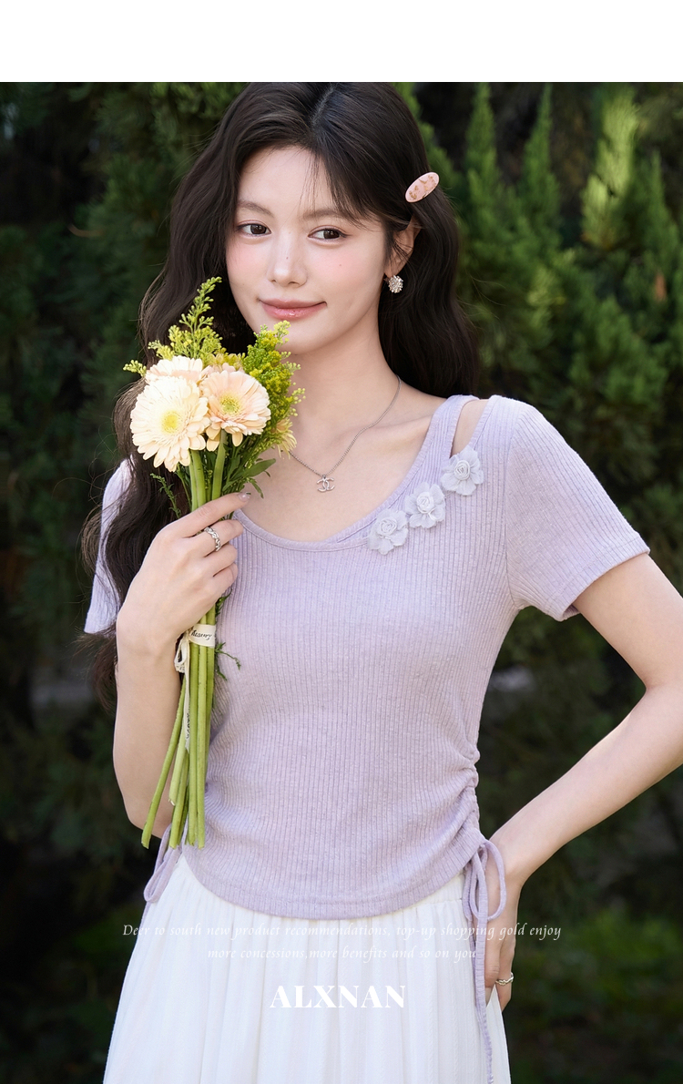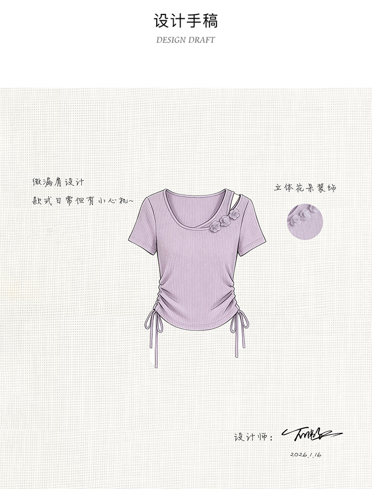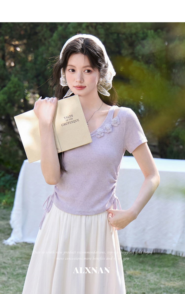 鹿向南「花间柔语」紫色短袖T恤女2026夏新款法式气质设计感上衣