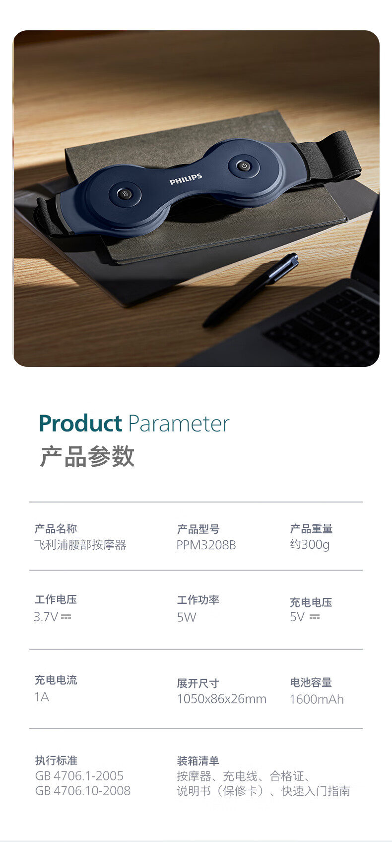 飞利浦(PHILIPS)腰部按摩器 腰椎热敷仪多档振动腰带热敷舒缓腰部按摩仪PPM3208B蓝 年会礼品生日礼物送男女朋友父母