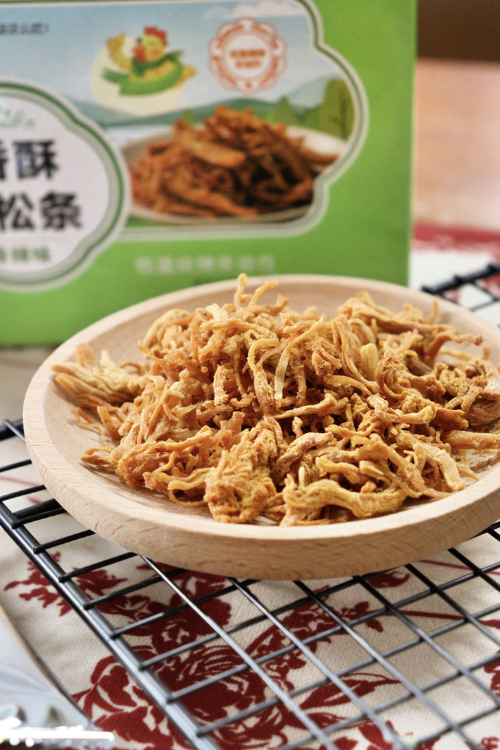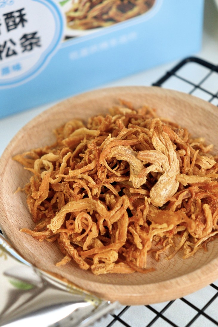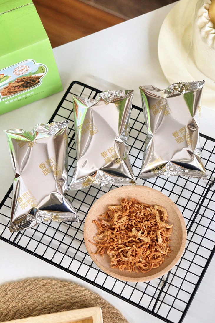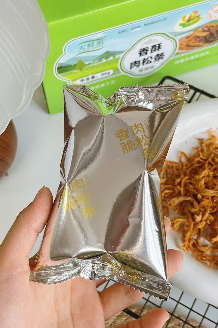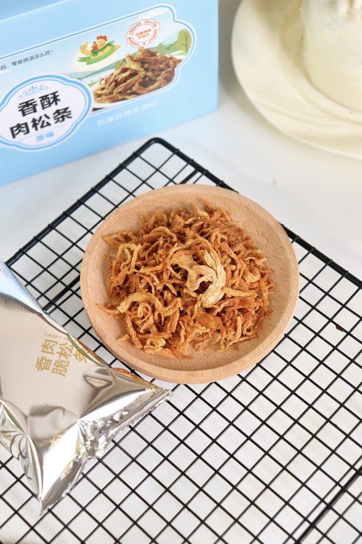 不光可以空口吃 它可以搭配粥、面、面包等食用 提升食物的口感和风味 将香酥鸡肉松条撒在白粥上,能增加粥的香味和口感 将其加入泡面中,香气和口感瞬间提升 还可以用来制作肉松小贝、肉松卷等美味食品 这些多样化的用途使得香酥鸡肉松条成为家庭烘焙和零食的优选!