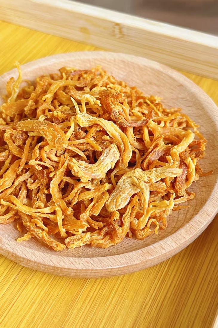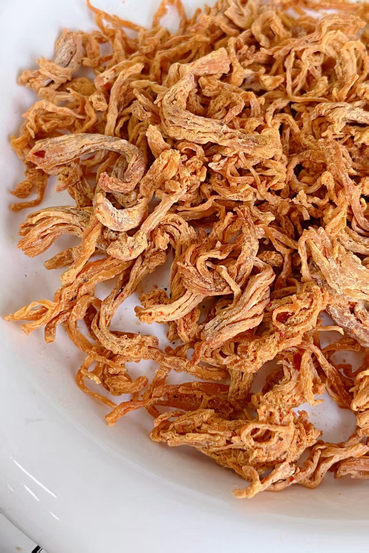 慢工出细活 高于110℃会导致油脂焦化发苦💢 低于110℃则无法激活肉纤维酥化反应💢 天鲜萌👉严格将温度控制在 110℃-120℃ 区间 平衡酥化效率与风味保留❗️ 市面肉松多采用 160℃-200℃ 高温速烤(15-30分钟)导致表面焦硬、内部干柴 🙌天鲜萌8小时慢火烘烤 通过分段控时,将水分活度降至 0.82-0.85 微生物无法繁殖的安全阈值,无需防腐剂 低温长时间加热促使鸡肉胶原蛋白水解为明胶 形成 “表面酥脆、内里蓬松” 的惊艳口感!