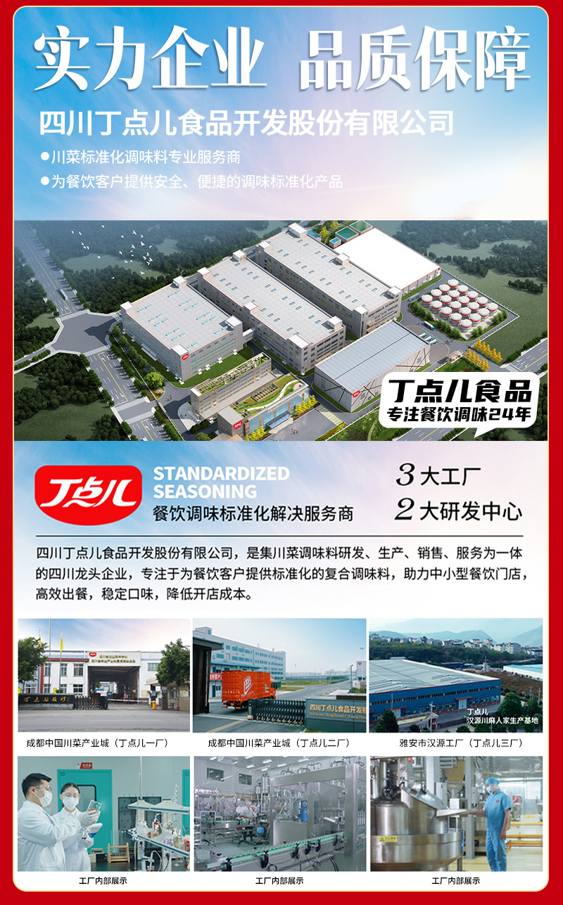 四川丁点儿食品开发股份有限公司,是集川菜调味料研发、生产、销售、服务为一体的现代化企业,专注为餐饮客户提供川菜调味解决方案。公司成立至今,服务了超百万家的餐饮门店以及连锁品牌。
