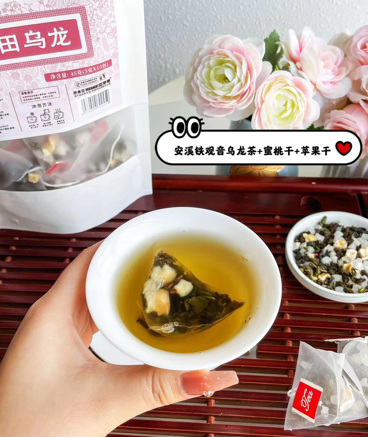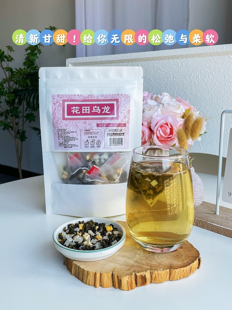 【品名】组合茶 花田乌龙45克/袋 黑果枸杞桑葚玫瑰茶75克/袋 【产地】安徽 【规格净重】45g/袋 75g/袋 【可选口味】花田乌龙茶+黑果枸杞桑葚玫瑰茶 【有效库存】1万+ 【生产日期】近2个月内 【保质期】12个月 【发货地】安徽 【发货时效】48小时 【快递公司】圆通 韵达、邮政,极兔,顺丰丰网 【不发货地区】新疆、西藏、玉树,西宁,海西蒙古族藏族自治州不发货。 【打包标准盒装/袋装】装箱 【是否包含礼品袋】 【保存方法】阴凉干燥处密封保存,避免阳光直射及高温 【售后退/换说明】七天无理由退换货(不影响二次销售,运费买家自理)
