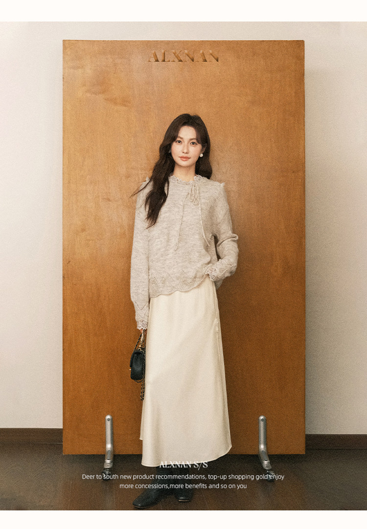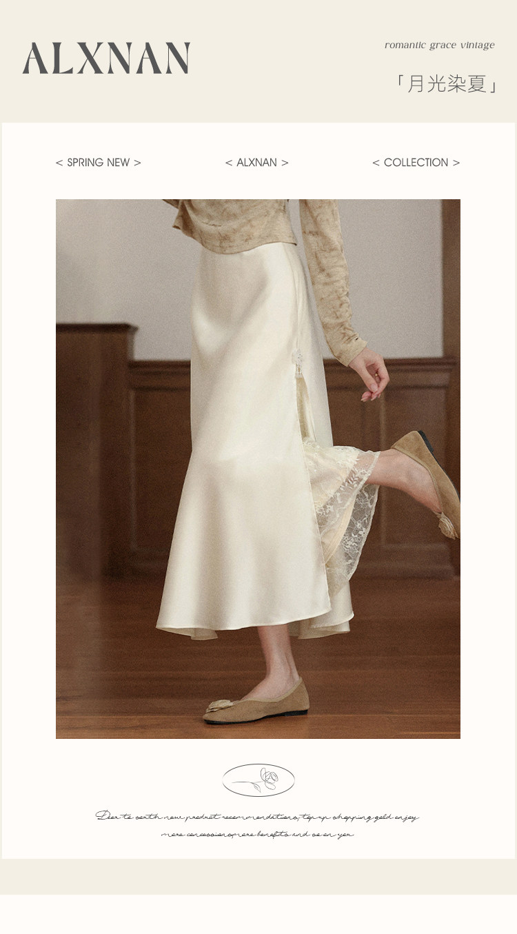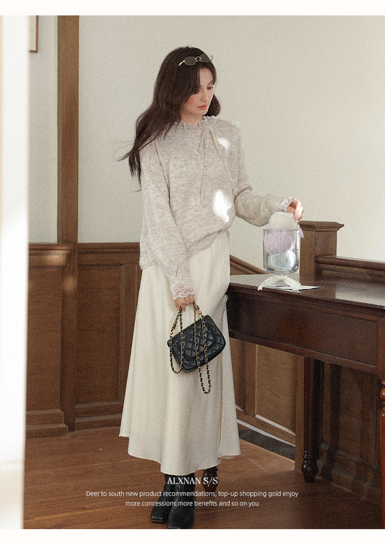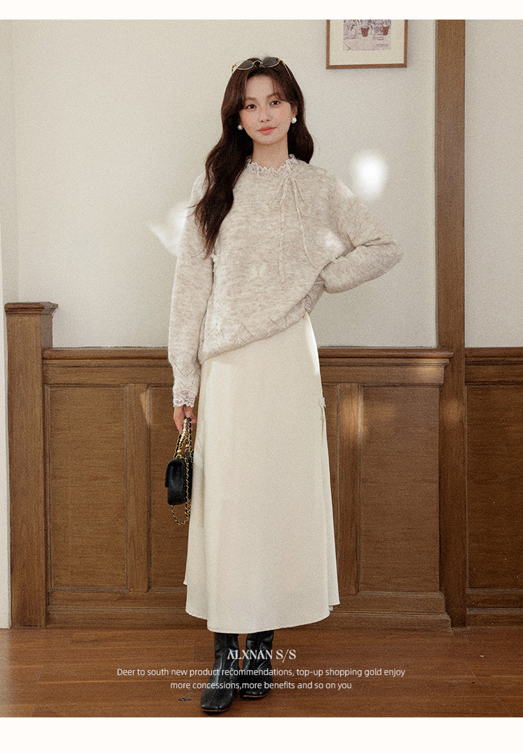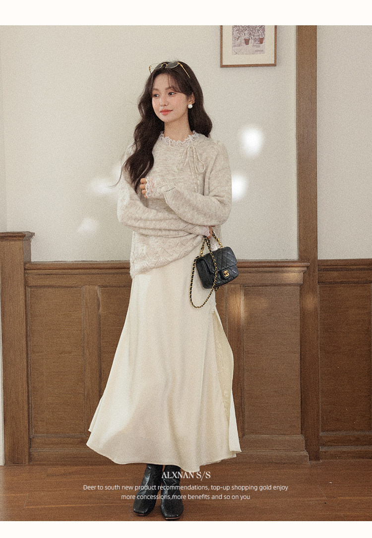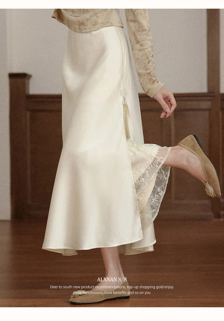 鹿向南「月光染」杏色法式半身裙女秋冬缎面半裙气质拼接蕾丝裙子