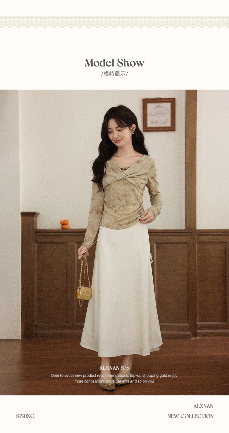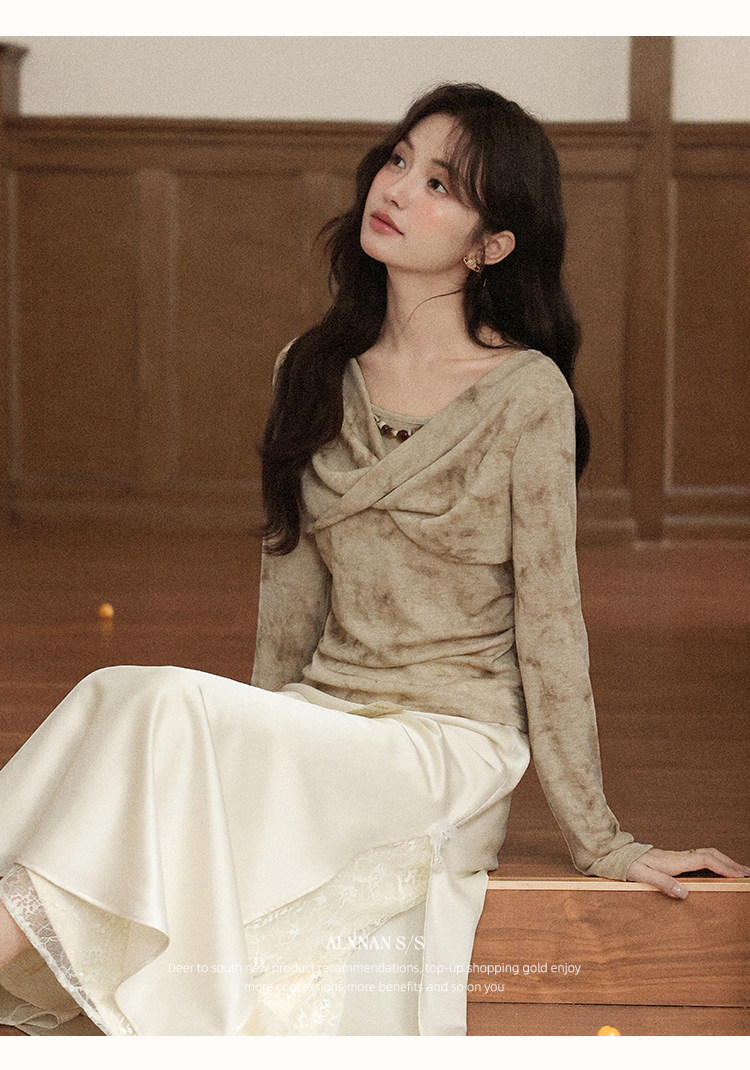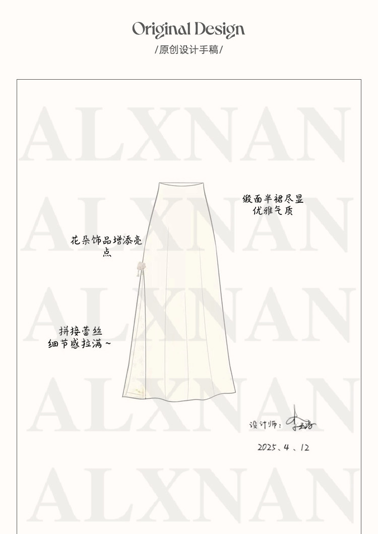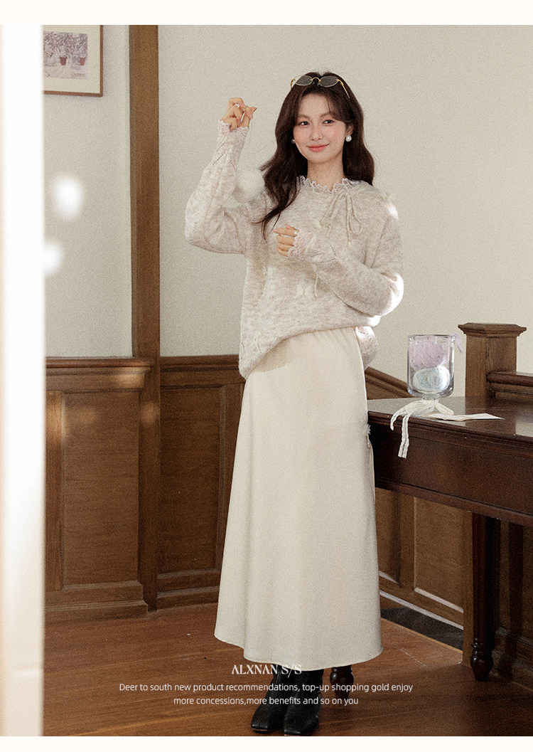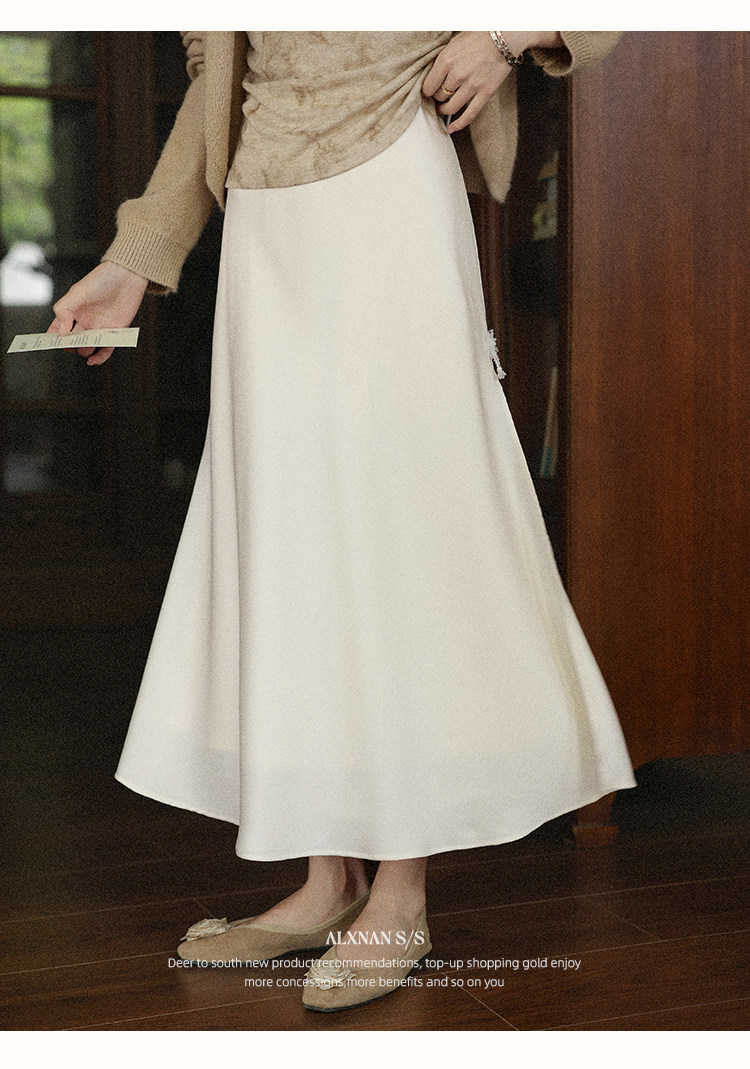 鹿向南「月光染」杏色法式半身裙女秋冬缎面半裙气质拼接蕾丝裙子