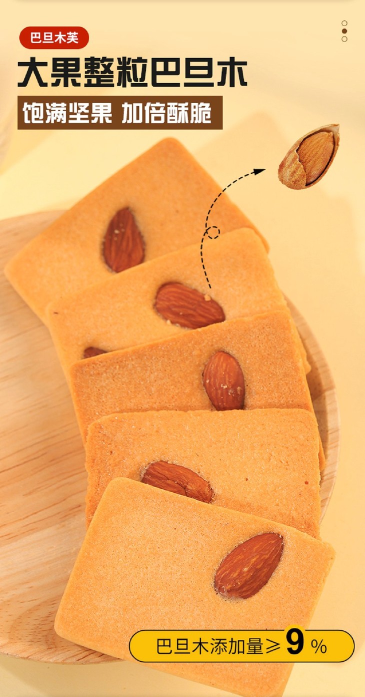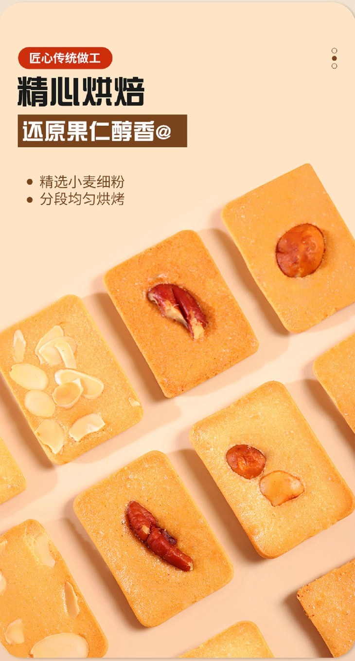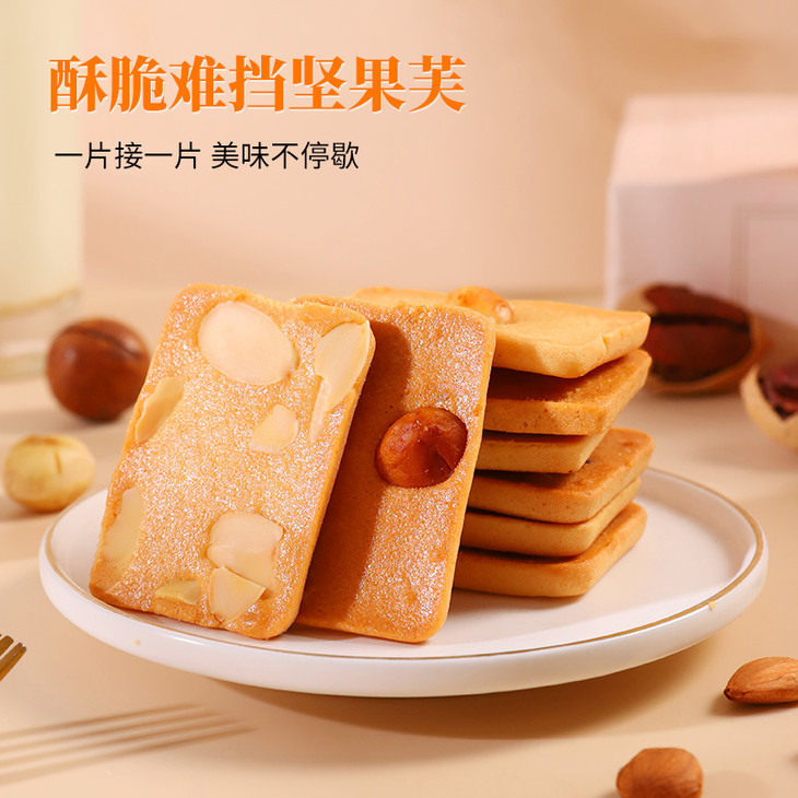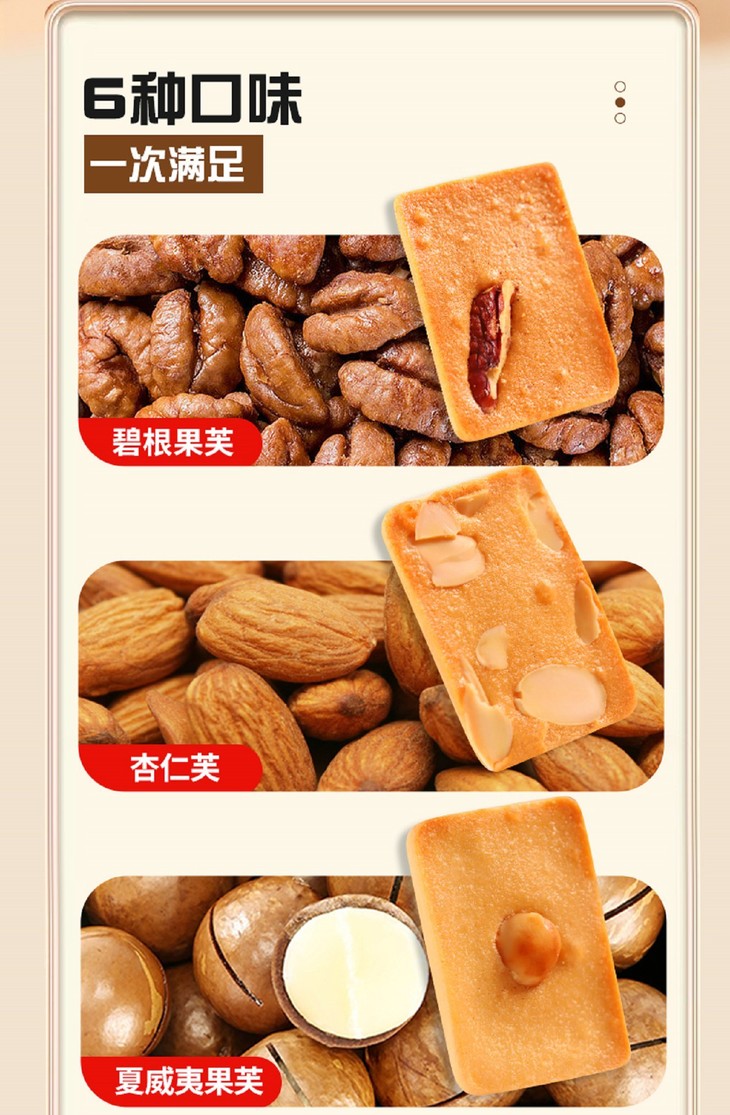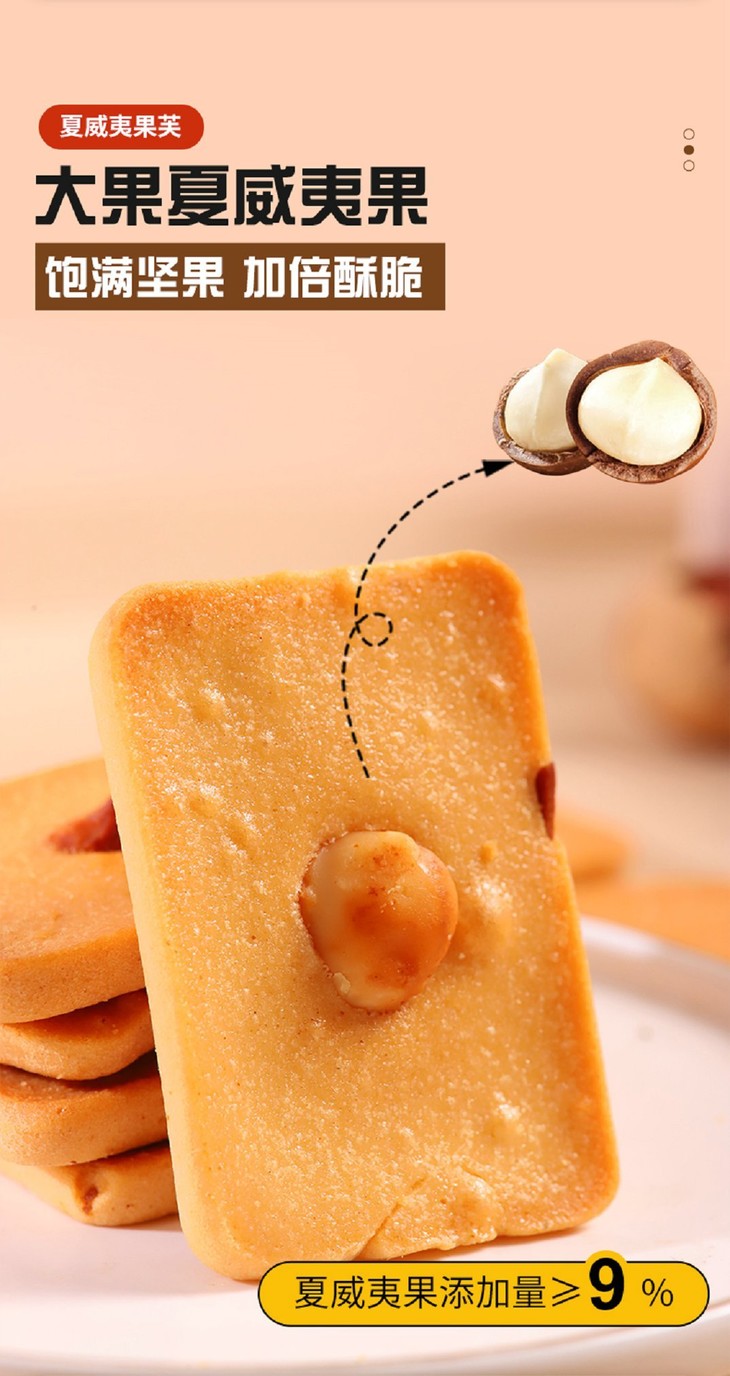 添加≥38%鲜鸡蛋,开袋就是扑鼻蛋香味,厚切蛋糕饼底 夏威夷果添加量9%,碧根果添加量10%,杏仁添加量10%,膳食配比均衡,每个饼干上都有一个坚果,好像小时候吃的味道,低温烘焙,非油炸制作,不易上火