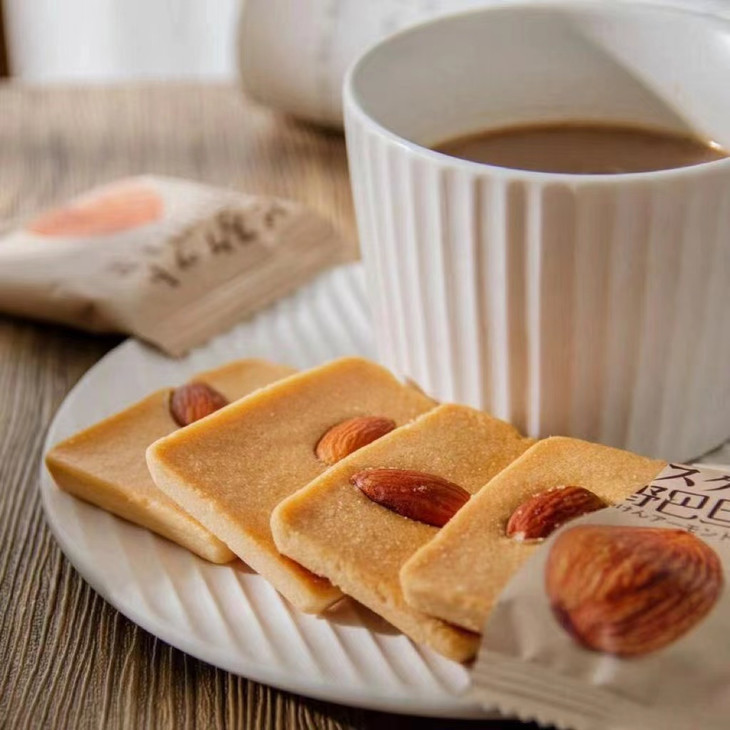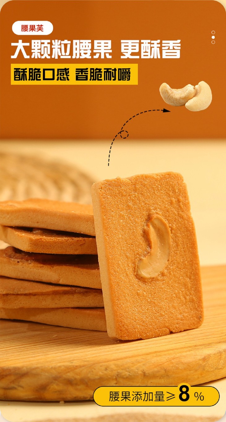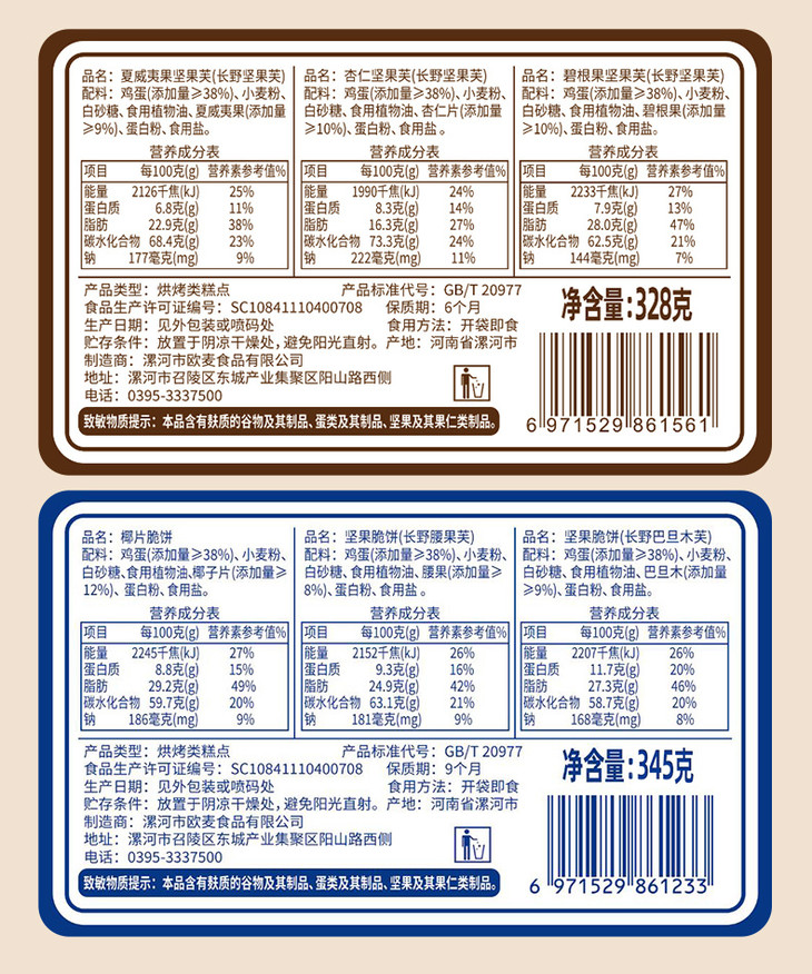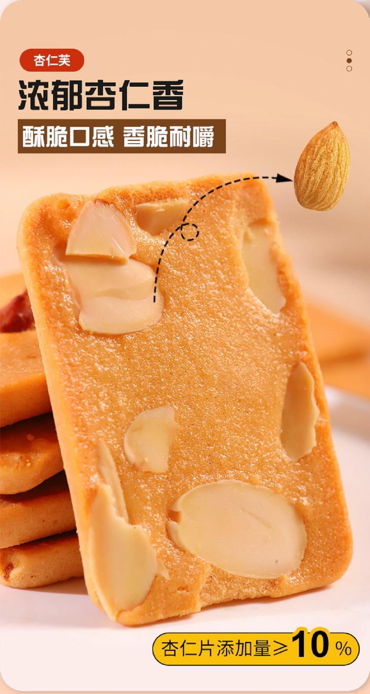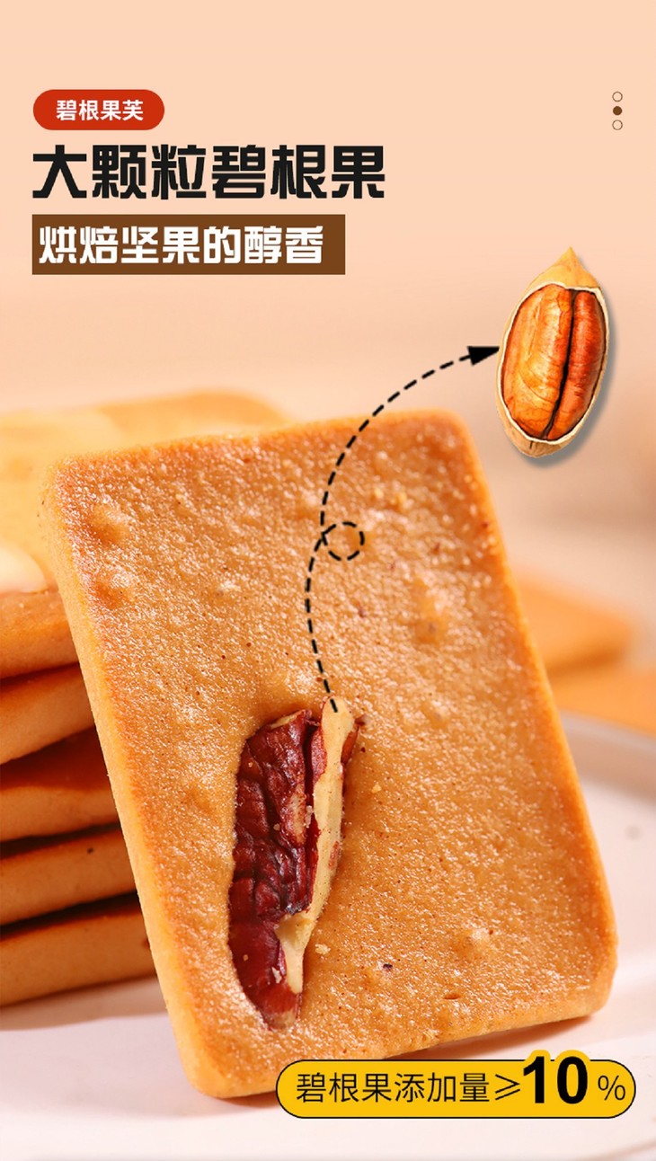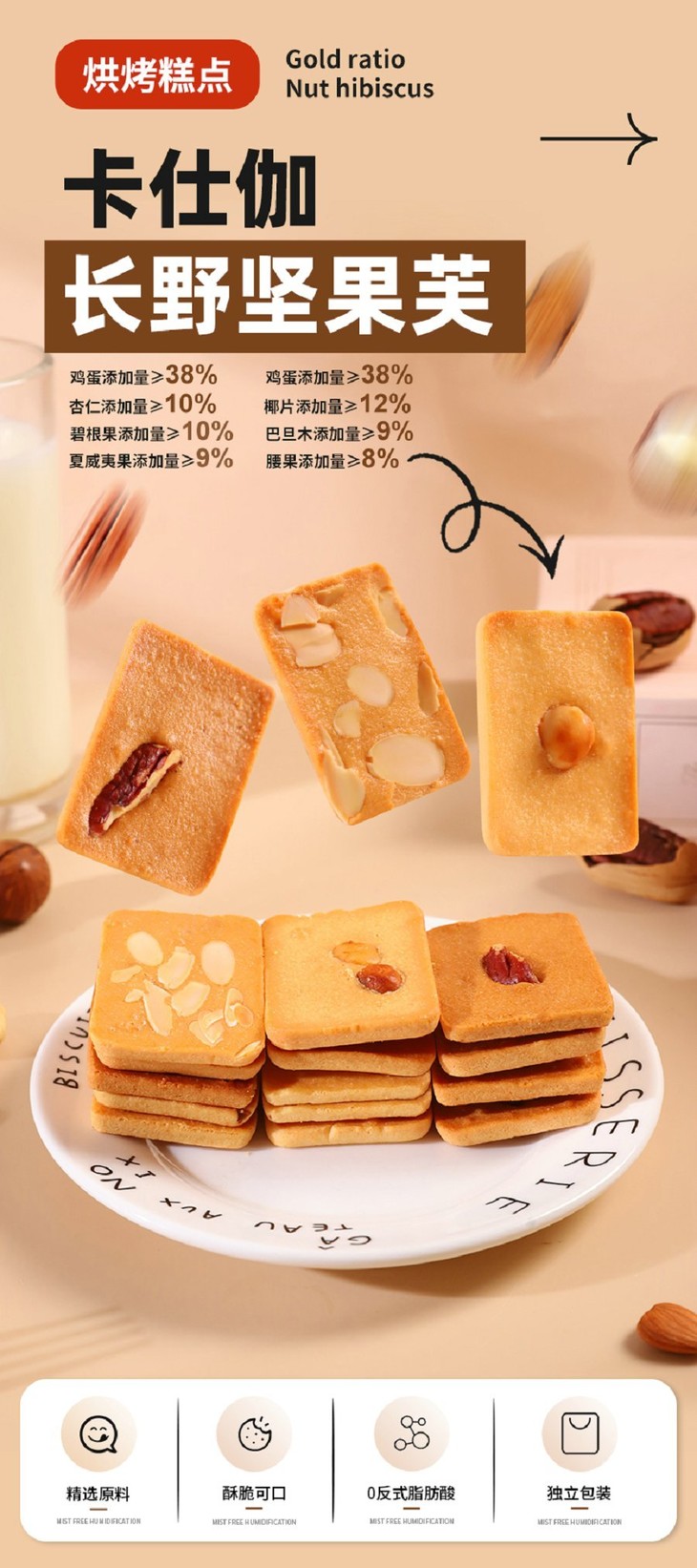 添加≥38%鲜鸡蛋,开袋就是扑鼻蛋香味,厚切蛋糕饼底 夏威夷果添加量9%,碧根果添加量10%,杏仁添加量10%,膳食配比均衡,每个饼干上都有一个坚果,好像小时候吃的味道,低温烘焙,非油炸制作,不易上火