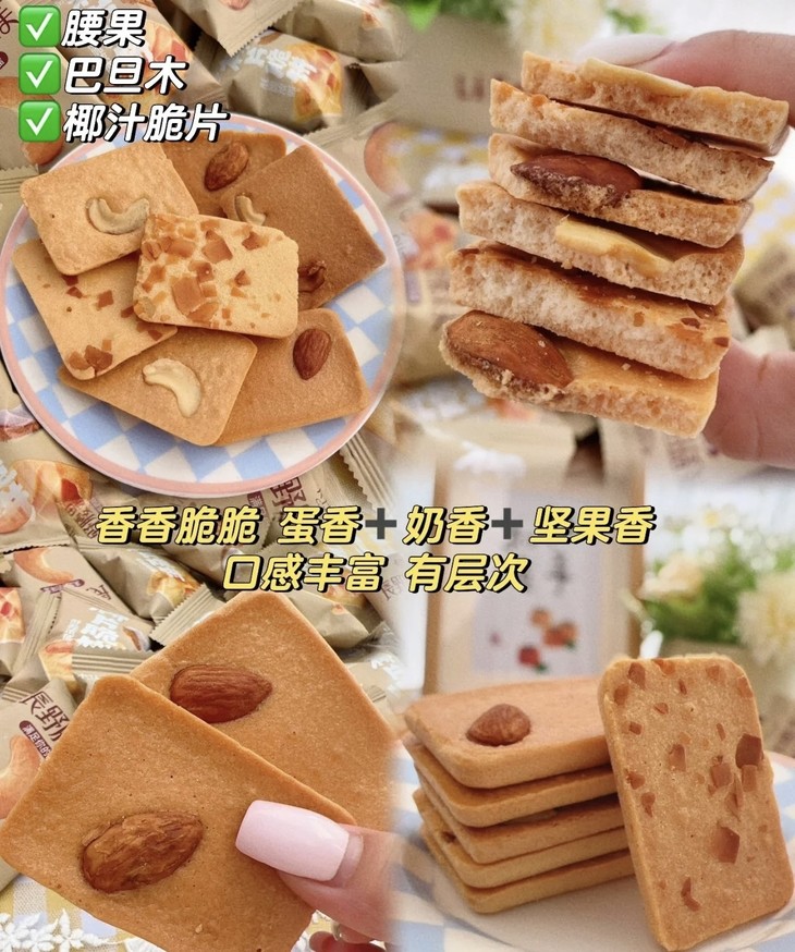这款饼干看起来清新 饼干脆脆的,香气浓郁 特别是吃到上面的坚果,和饼干一起咀嚼香 一整个大爱🧡ྀི💛ྀི❤️ྀི 坚果芙表面烤得金黄 有坚果和鸡蛋的香味,加上酥酥脆脆的口感 吃起来甜而不腻,比饼干更好吃!