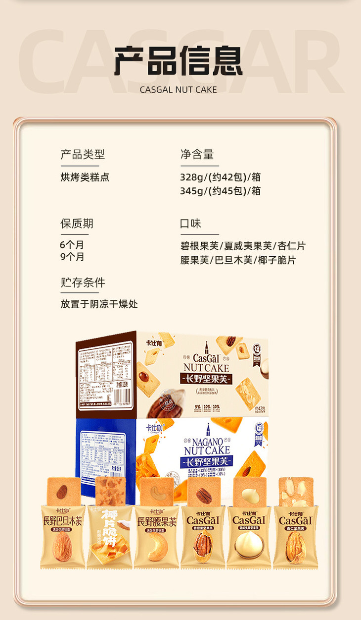 【口味】: 345g(腰果芙、巴旦木芙、椰片脆饼、3口味混合装) 新口味-328g(碧根果芙、夏威夷果芙、杏仁芙、3口味混合装)
