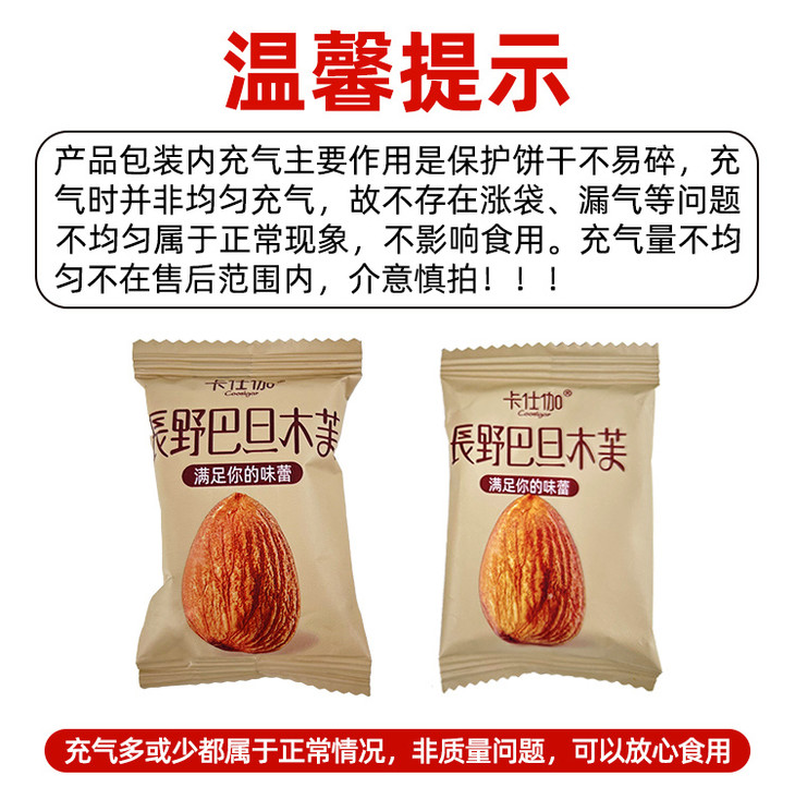 【售后说明】:食品不支持7天无理由。因顾客原因导致,拦截,改地址,拒收,需要支付3元/组快递费。签收有质量问题等情况,请在24小时内售后。需提供清晰可见的:快递面单图,快递包装图,产品问题图。(未提供凭证货超过售后24小时时效的将不予处理,还请理解!) 温馨提示: 长野坚果芙产品包装内充气主要作用是保护饼干不易碎,充气时并非均匀充气,故不存在涨袋,漏气等问题,充气多或少都属于正常情况,非质量问题,可以放心食用 未破损,漏气的情况下,不在售后范围内。 介意慎拍