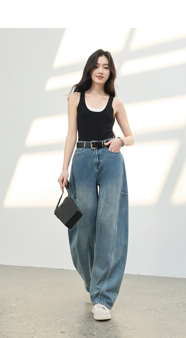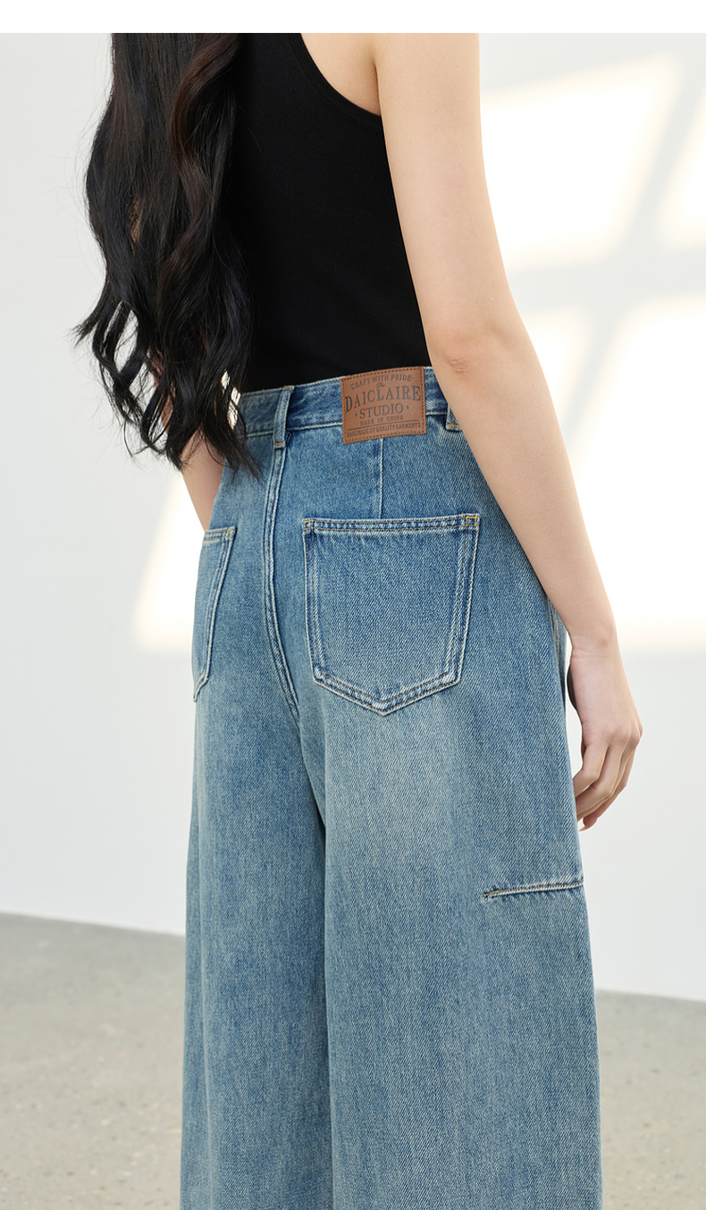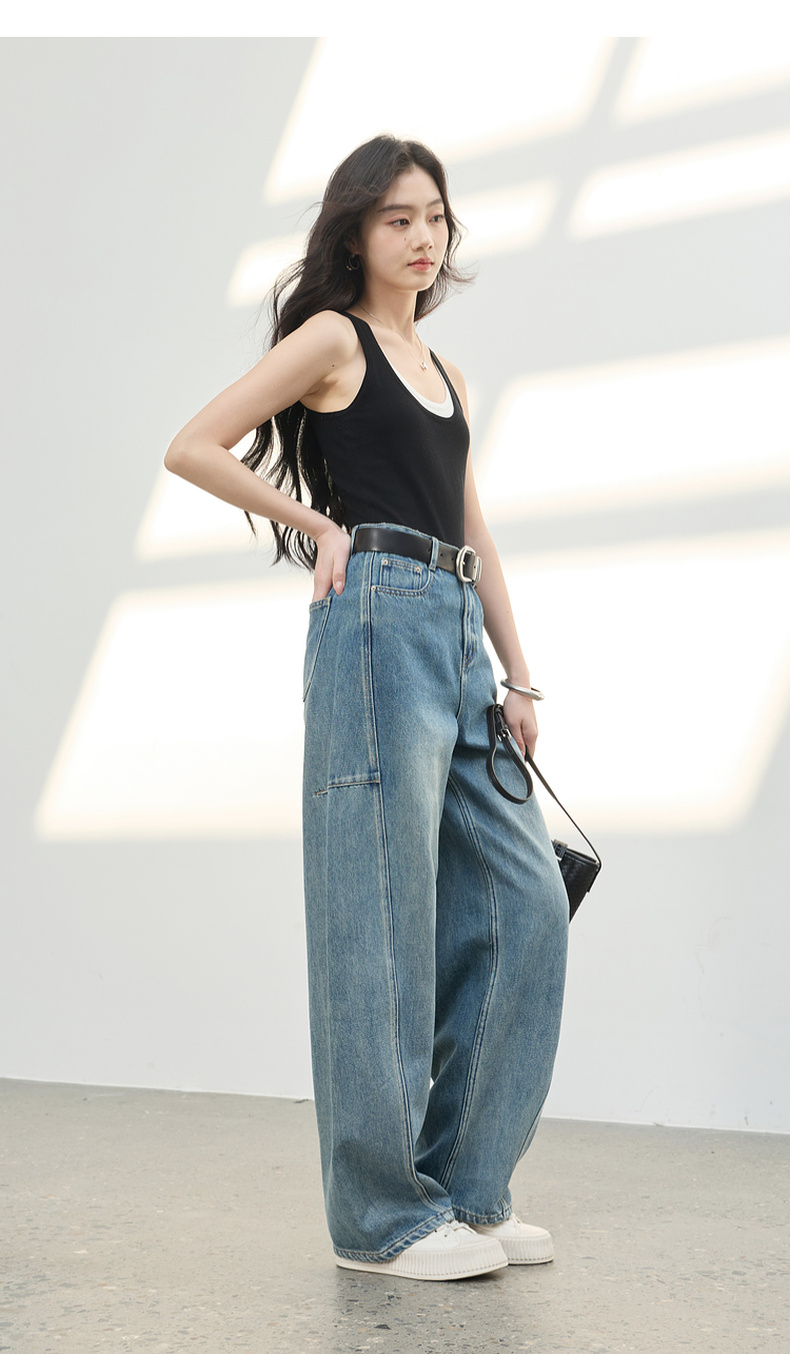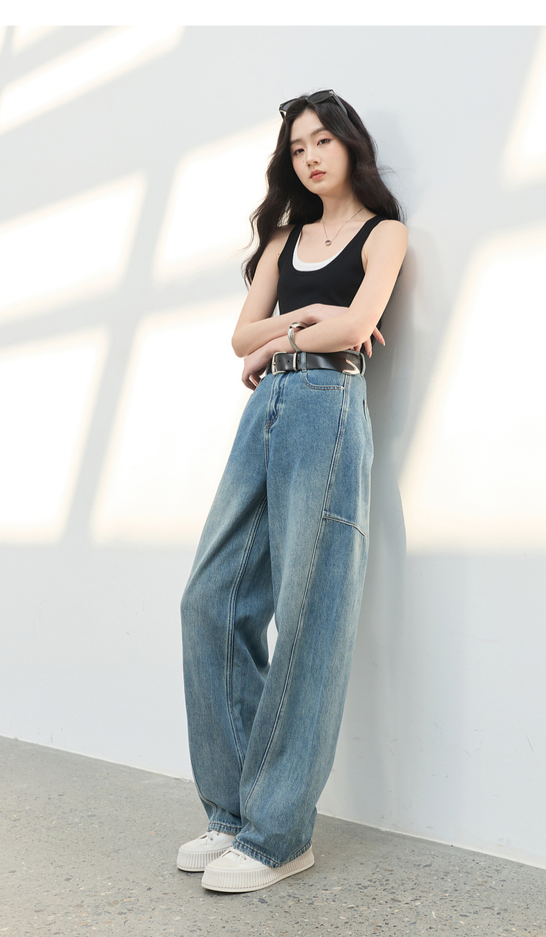 三彩2026春季新款复古休闲裤高腰牛仔裤长裤宽松弯刀裤显瘦垂感M