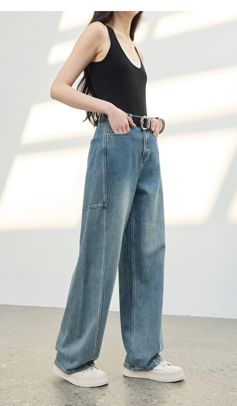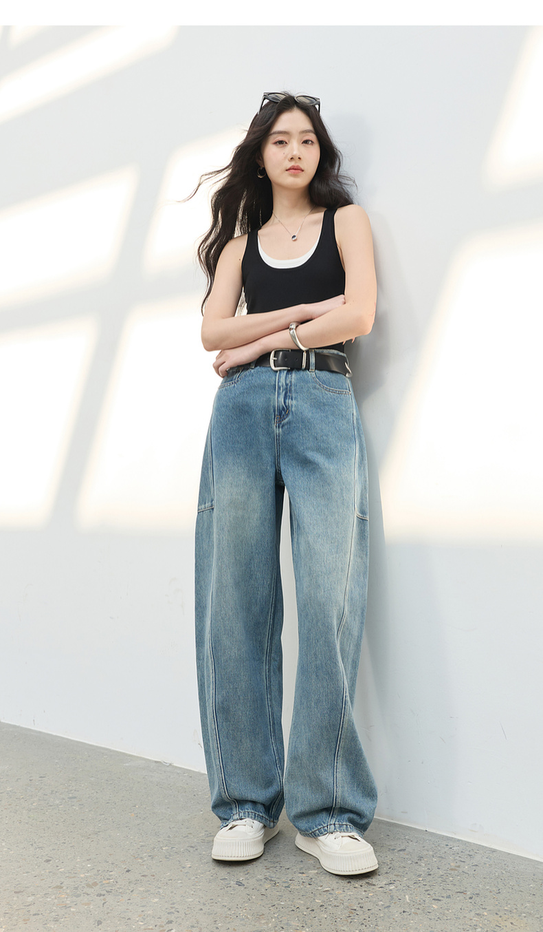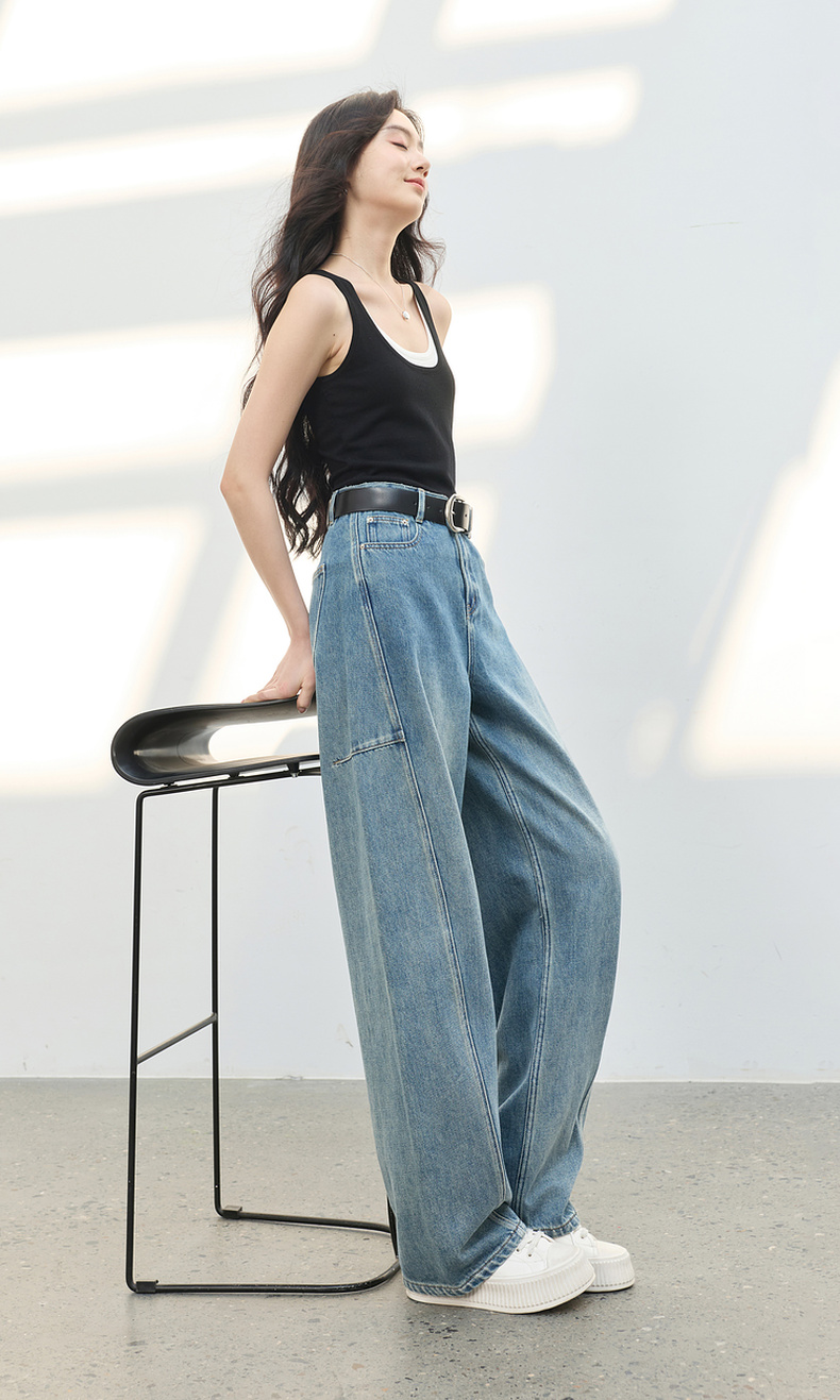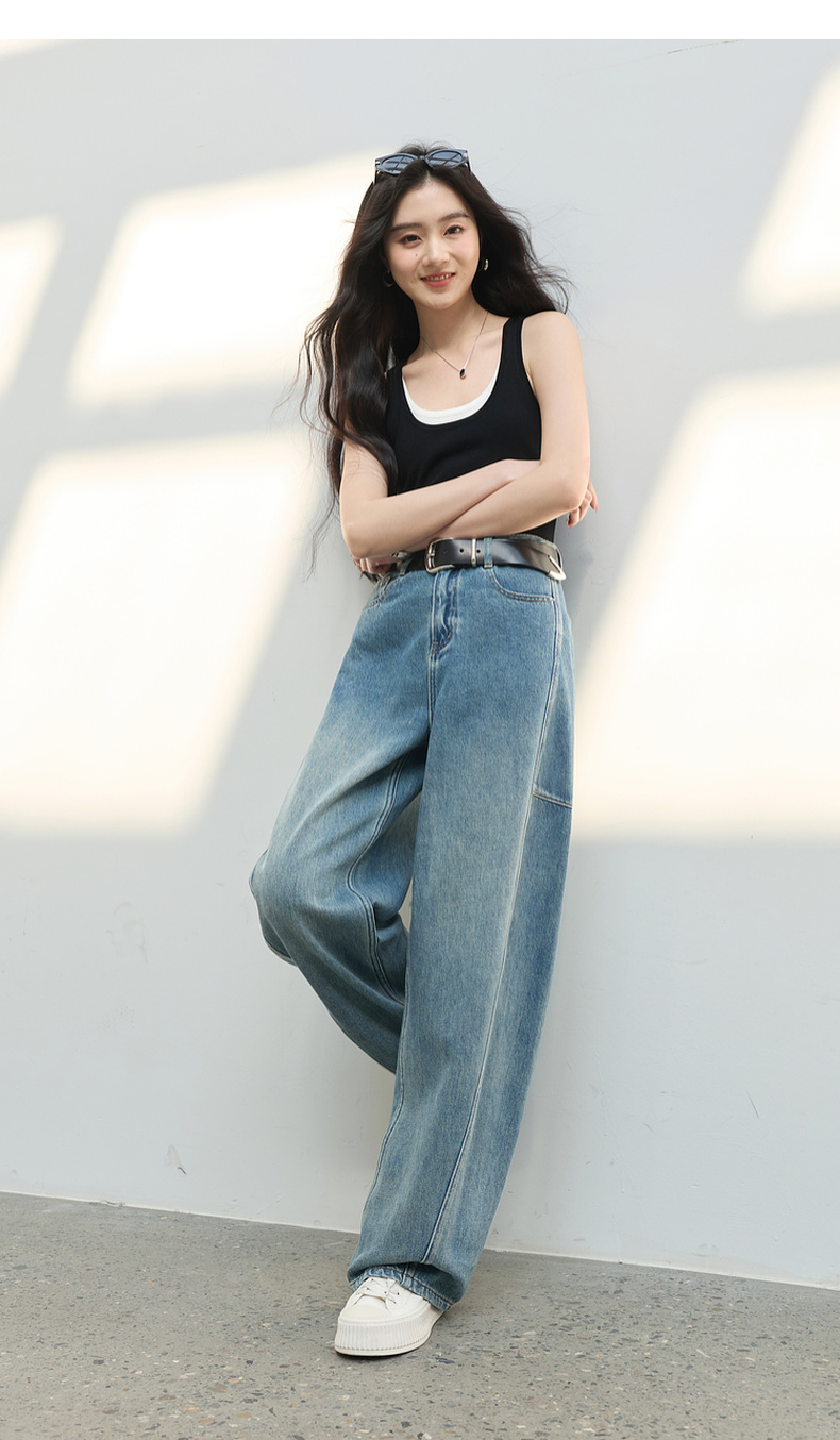 三彩2026春季新款复古休闲裤高腰牛仔裤长裤宽松弯刀裤显瘦垂感M