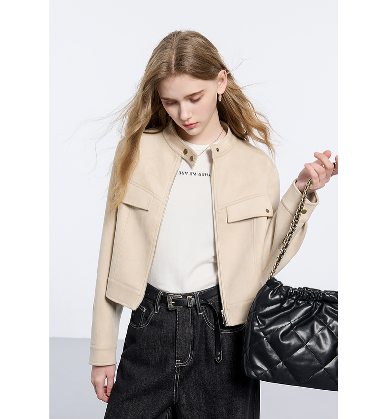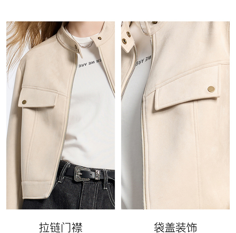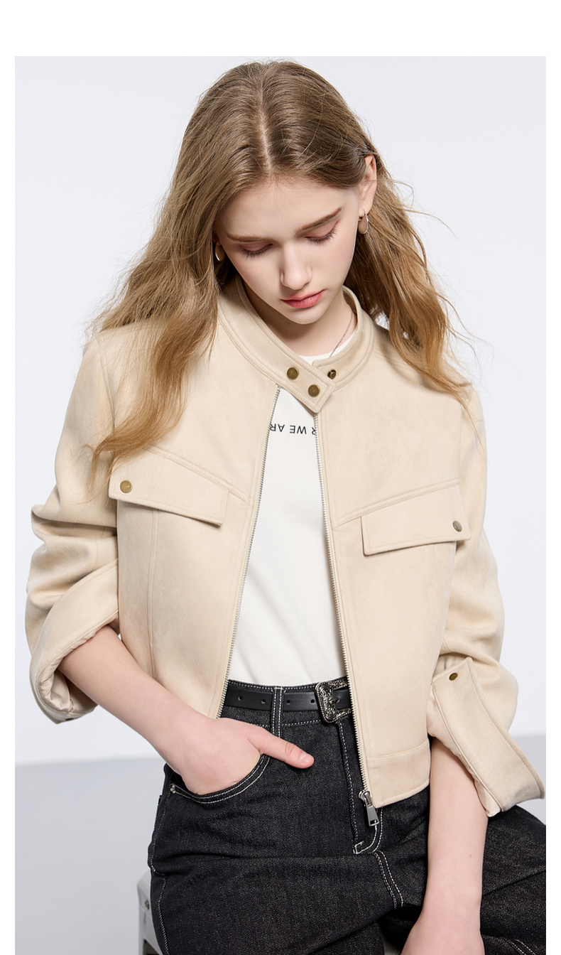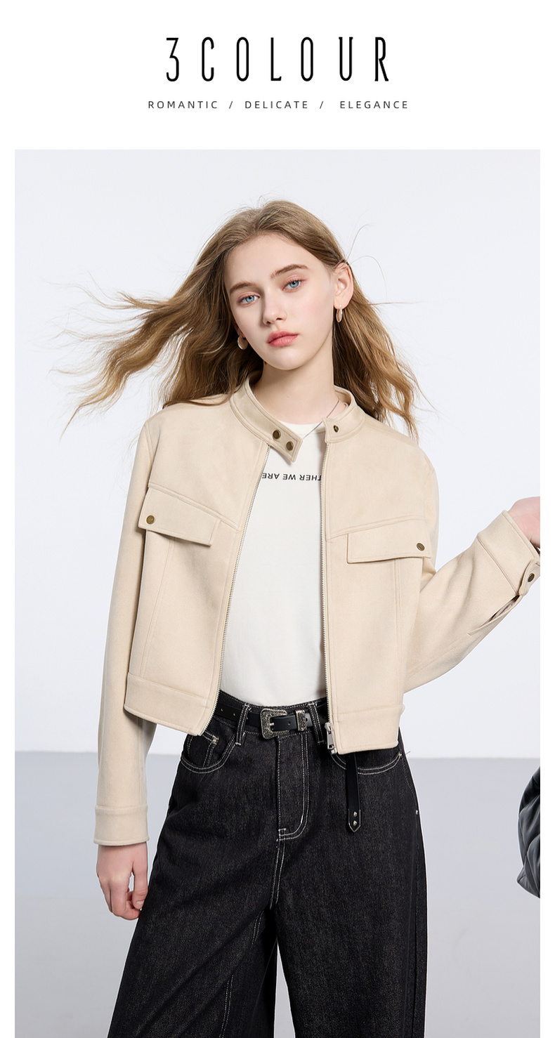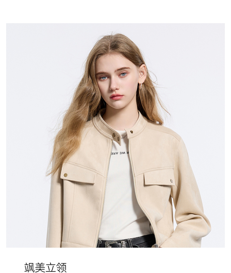 三彩2026春季新款宽松短款仿麂皮绒空气层外套简约夹克上衣M