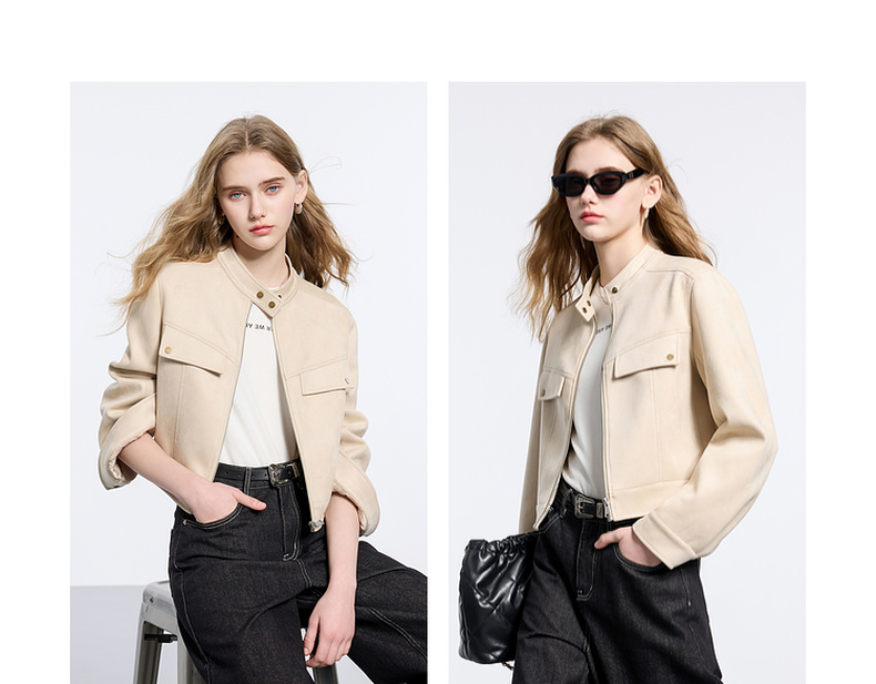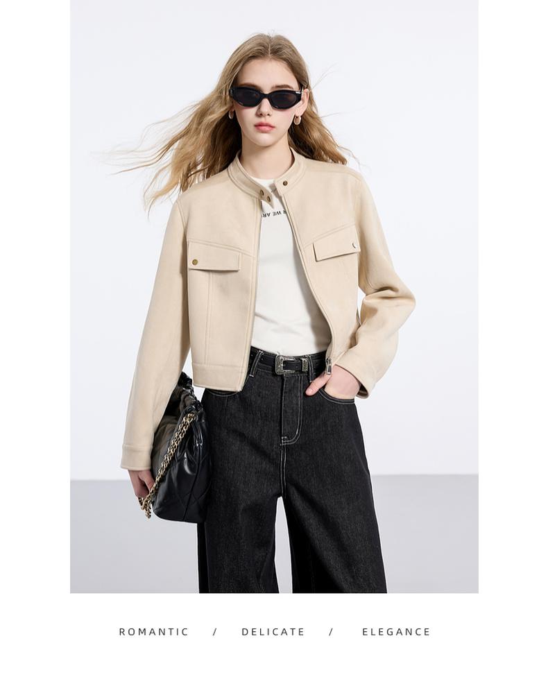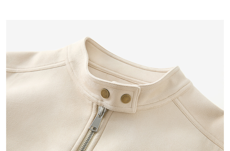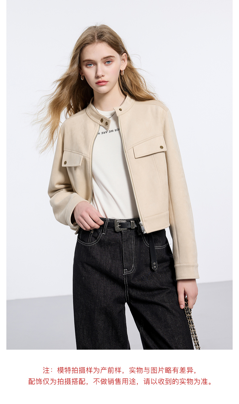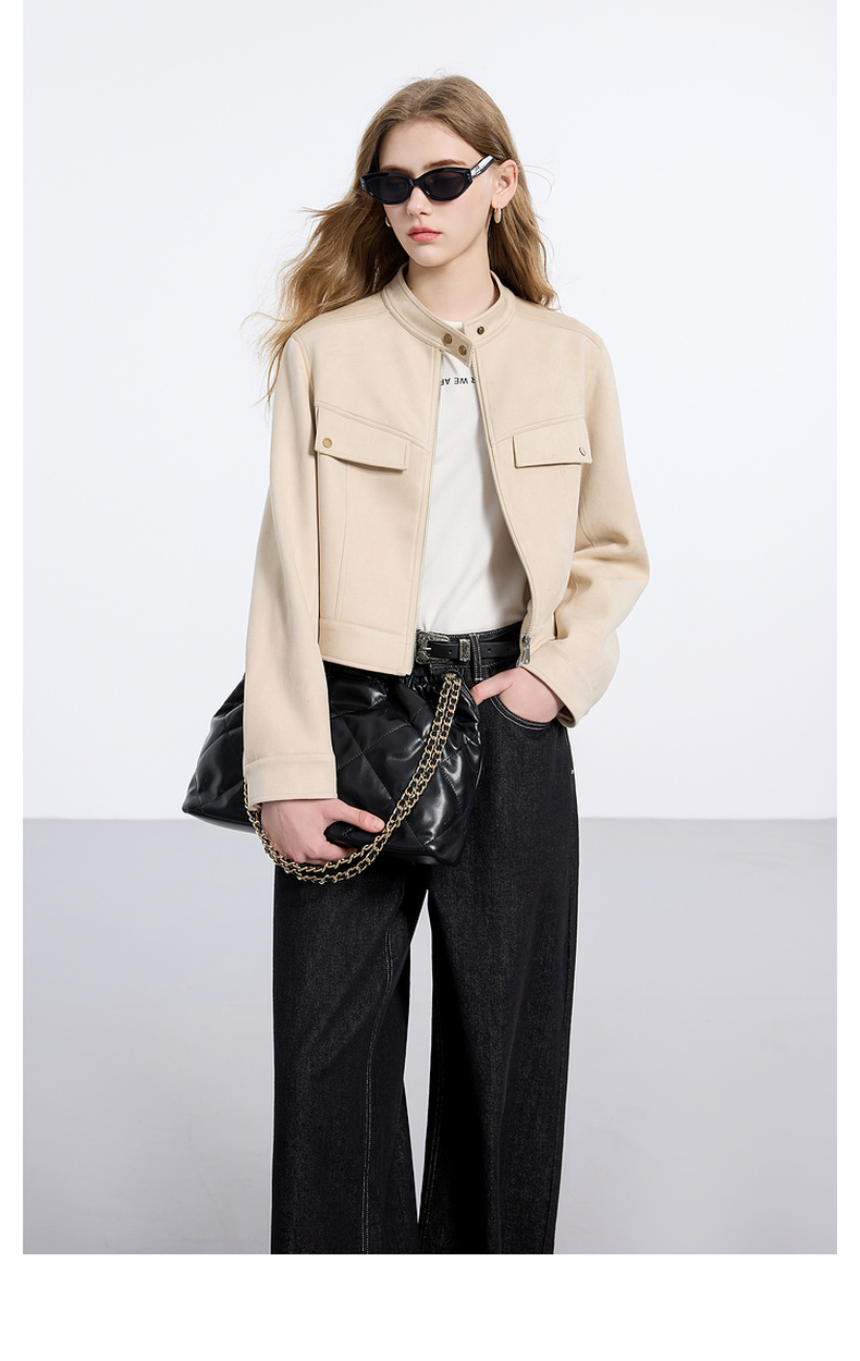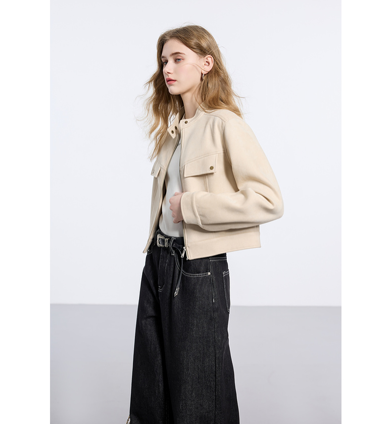 三彩2026春季新款宽松短款仿麂皮绒空气层外套简约夹克上衣M