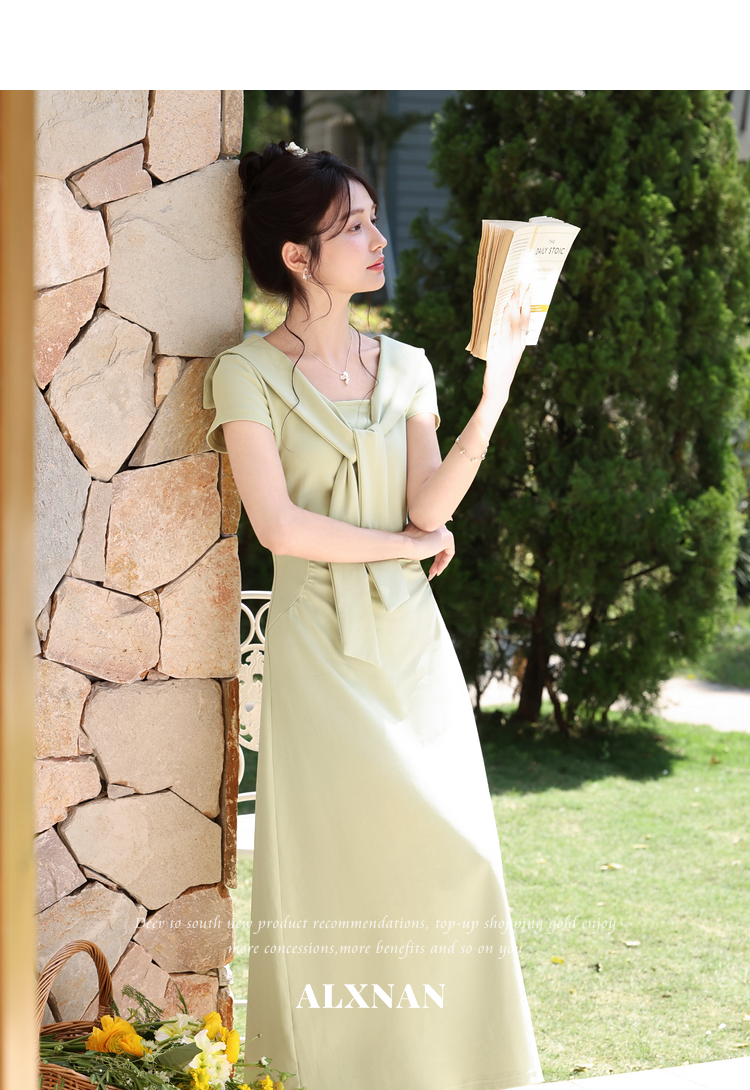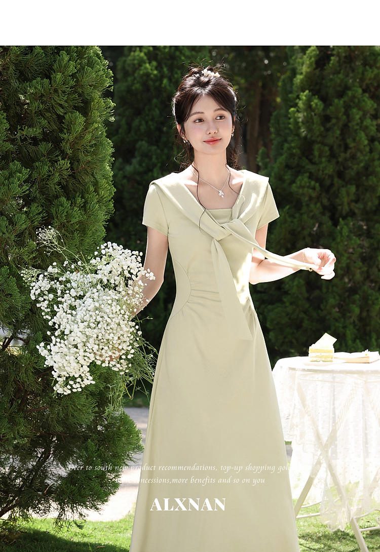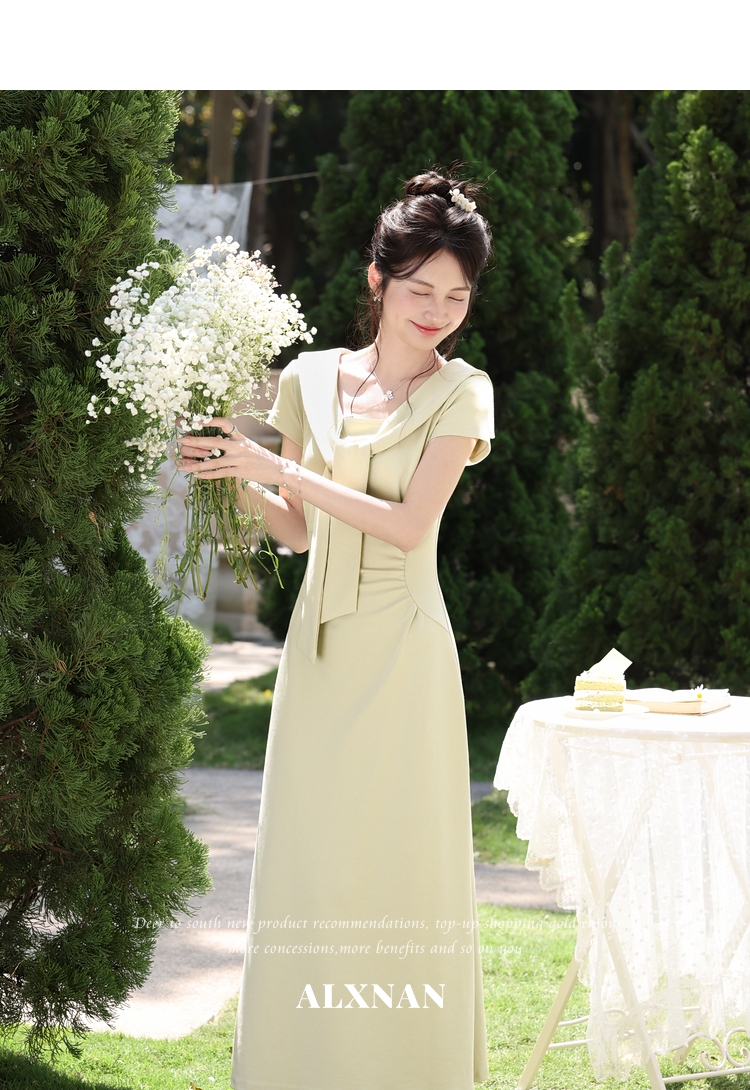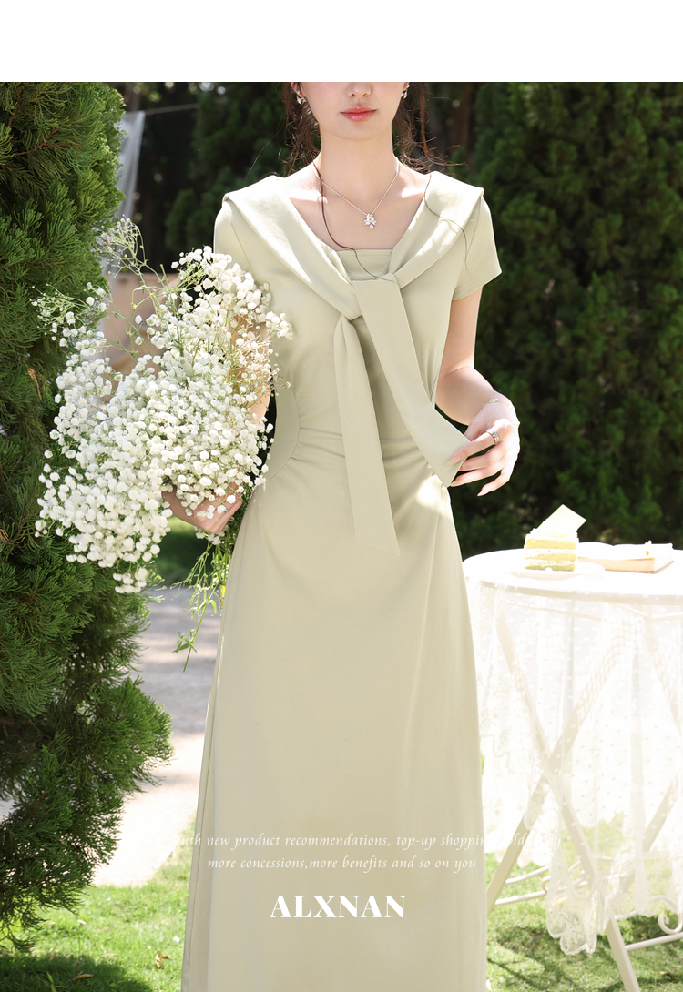 鹿向南「浅茶来信」绿色法式收腰连衣裙夏季新款显瘦气质连衣裙女