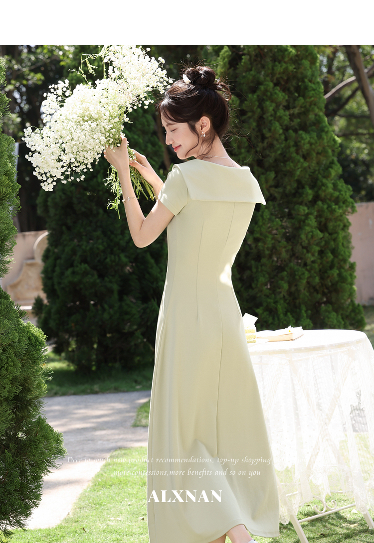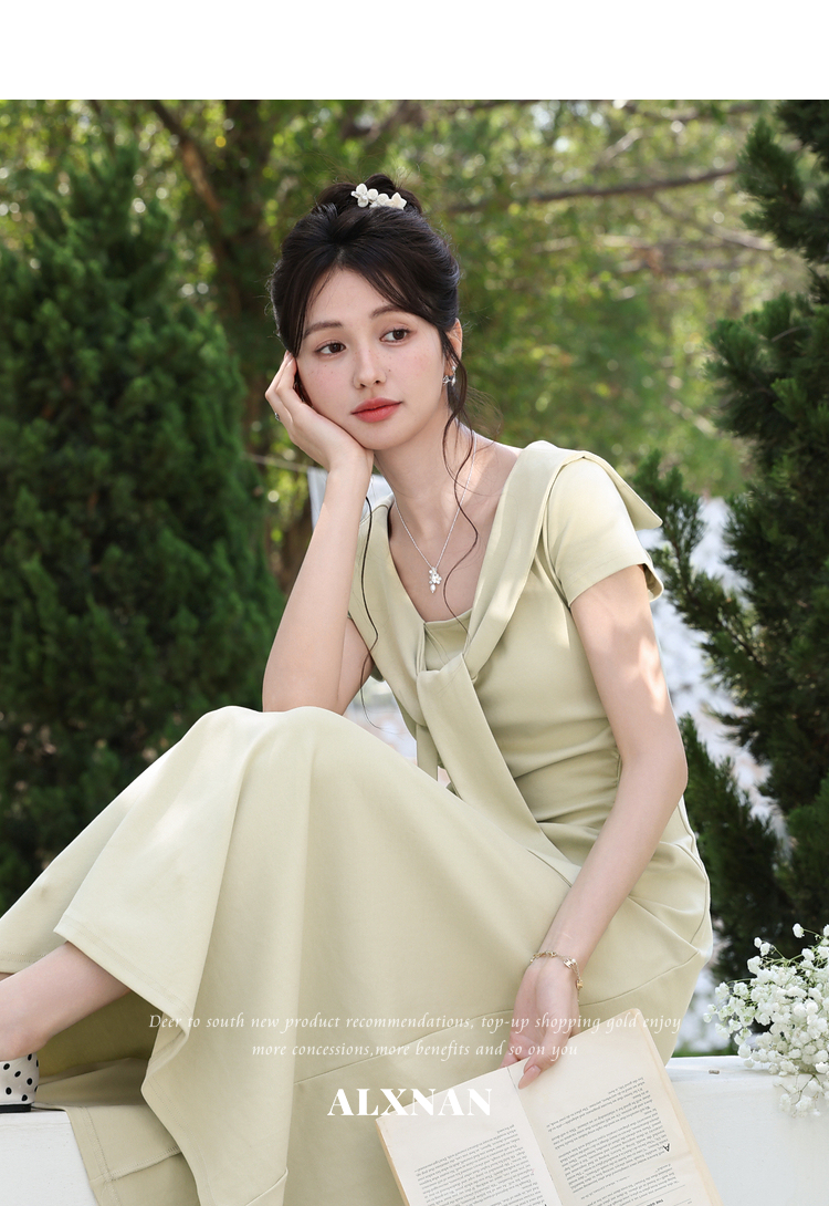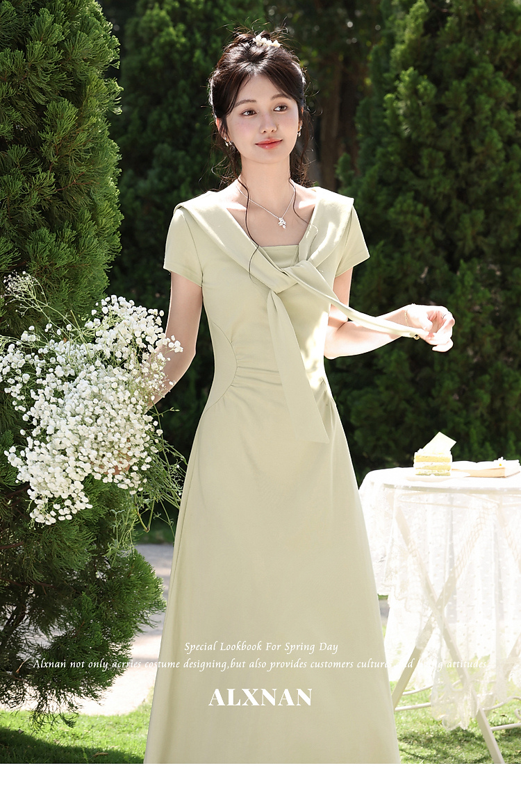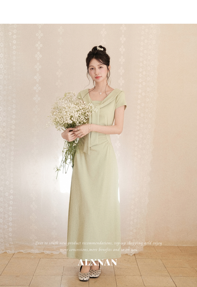 鹿向南「浅茶来信」绿色法式收腰连衣裙夏季新款显瘦气质连衣裙女