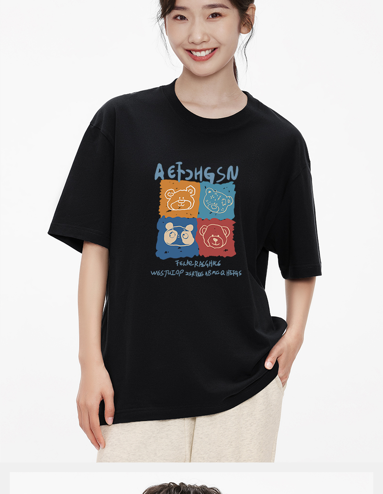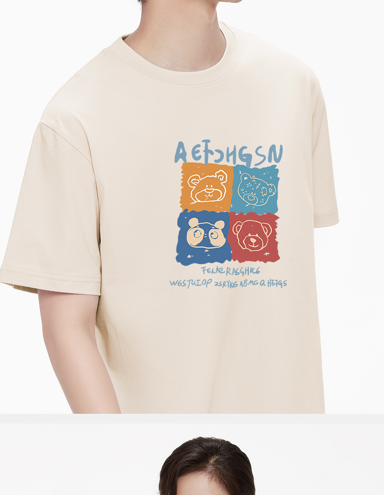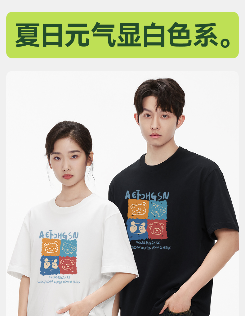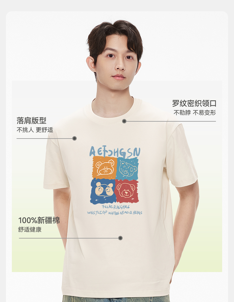 「棉的美学」夏季纯色拼色小熊印花短袖t恤男休闲2025新款纯棉衣服
