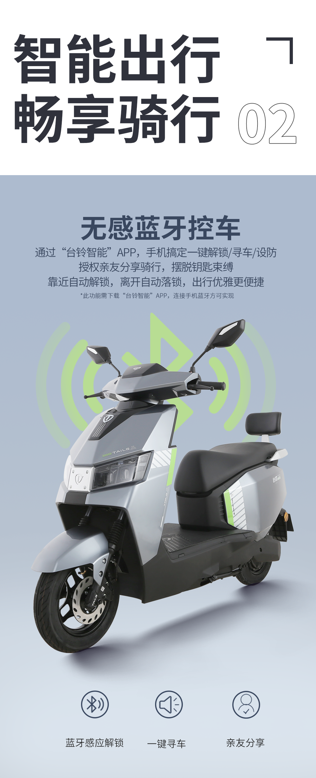 整车智能:无感蓝牙控车、台铃智能APP靠近解锁、遥控钥匙