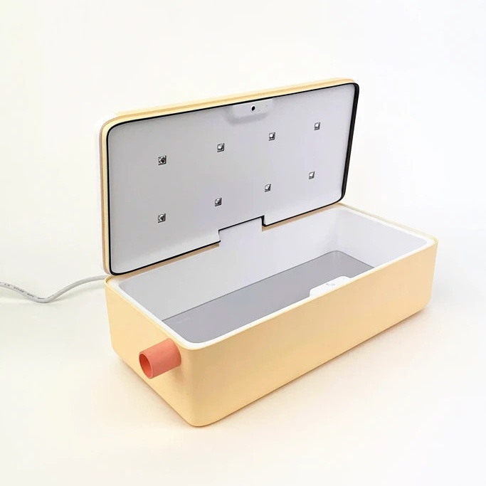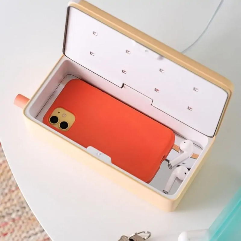 这个长方形的消毒盒可以同时放下手机、要是、耳机和其他小物品。